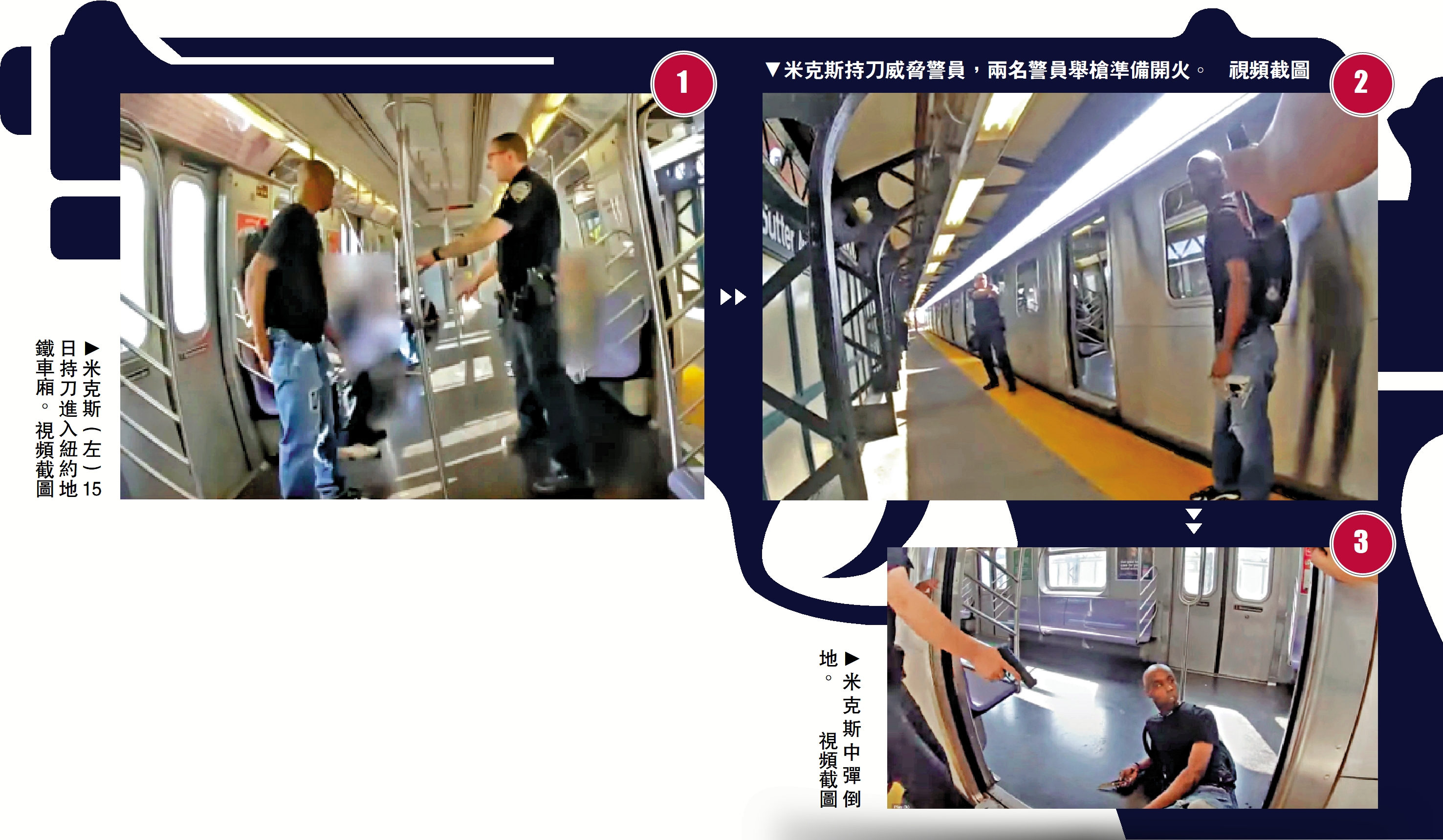 車站監控視頻和涉案警員執法記錄儀視頻顯示,當地時間15日下午3時左右,37歲男子米克斯在紐約布魯克林布朗斯維爾的薩特大道地鐵站跳閘門逃票時被警察發現,隨後離開。但10分鐘後,米克斯偷偷從應急門返回地鐵站,且手中持有刀具。警察追着他來到月台,並要求他放下刀,但米克斯拒絕配合,將持刀的手藏在背後,並且叫嚷道:「別碰我!別逼我殺了你們。」
