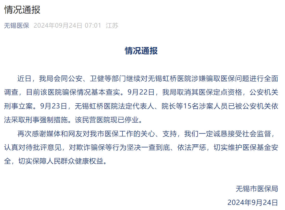 大公文匯網報道,江蘇省無錫市醫保局24日在官方微信公眾號發布情況通報稱,近日,無錫市醫保局會同公安、衞健等部門繼續對無錫虹橋醫院涉嫌騙取醫保問題進行全面調查,目前該醫院騙保情況基本查實。9月22日,無錫市醫保局取消其醫保定點資格,公安機關刑事立案。9月23日,無錫虹橋醫院法定代表人、院長等15名涉案人員已被公安機關依法採取刑事強制措施。該民營醫院現已停業。
