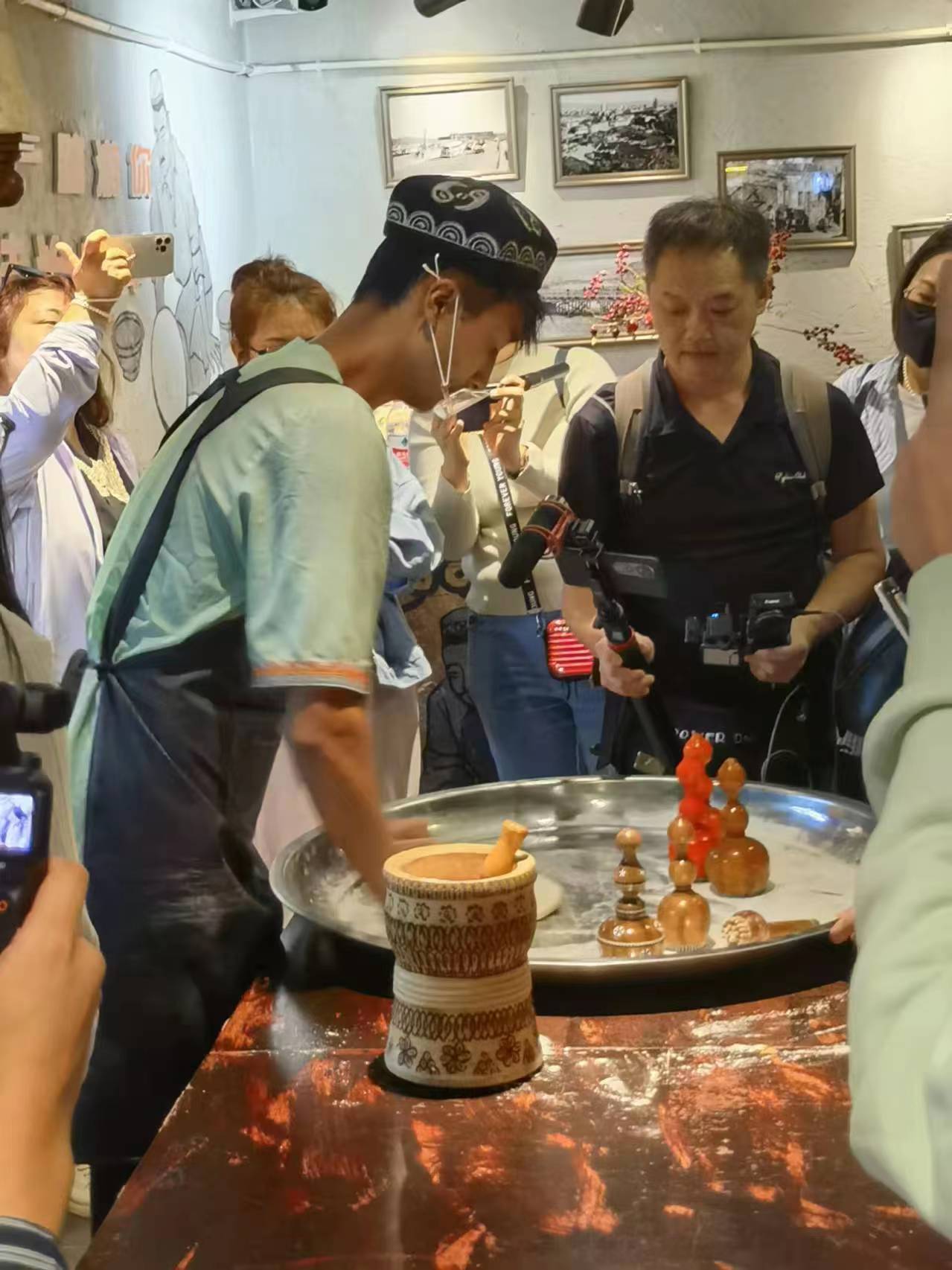 饢是新疆人須臾不可或缺的日常美食。在大巴扎裏的「新疆饢主題館」,採訪團一行圍攏在打饢的維吾爾族青年周邊,看着他熟練地和面、擀餅、壓花紋、下坑烤制……不時有同行好奇地親自下手體驗,現場充滿了陣陣歡笑。