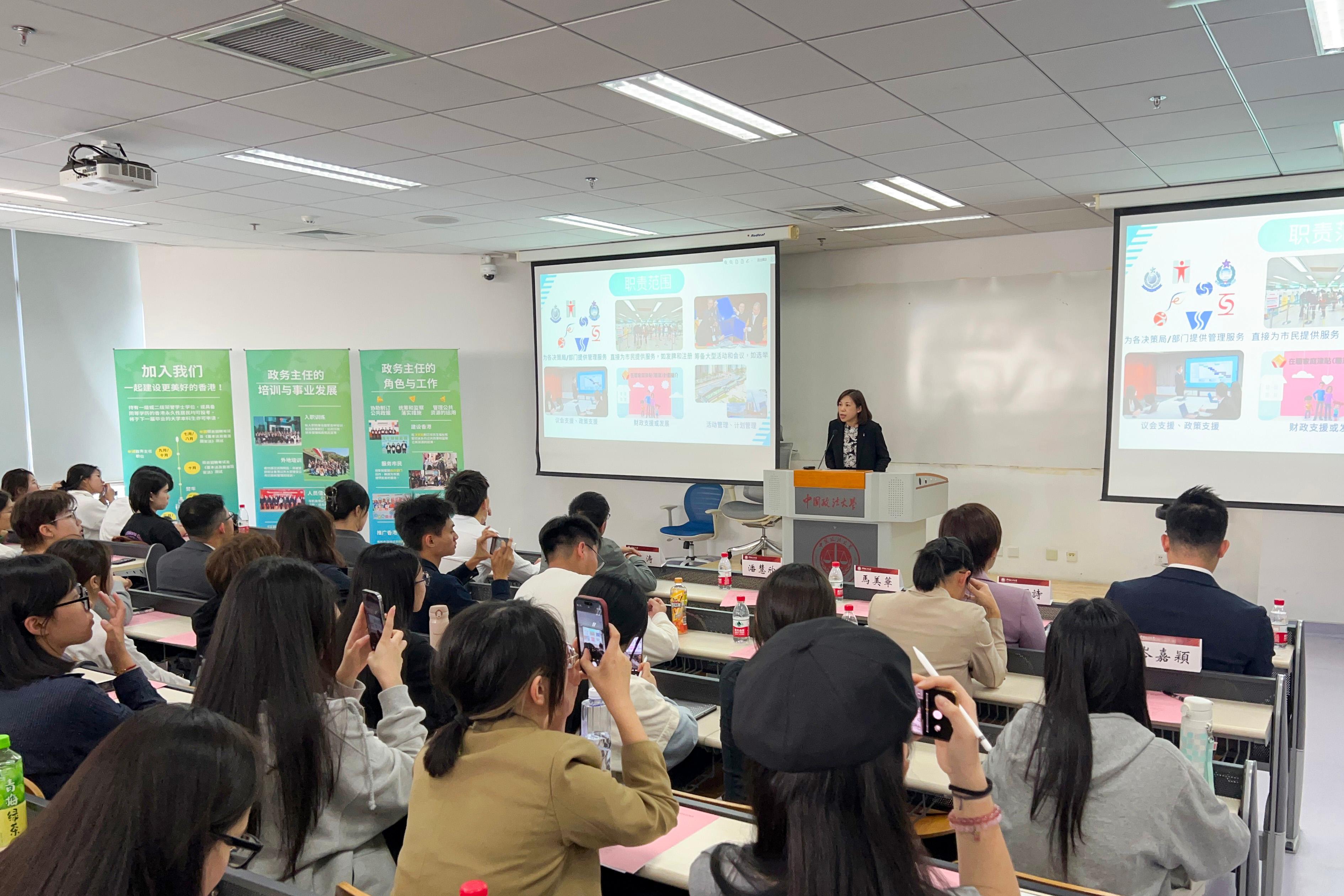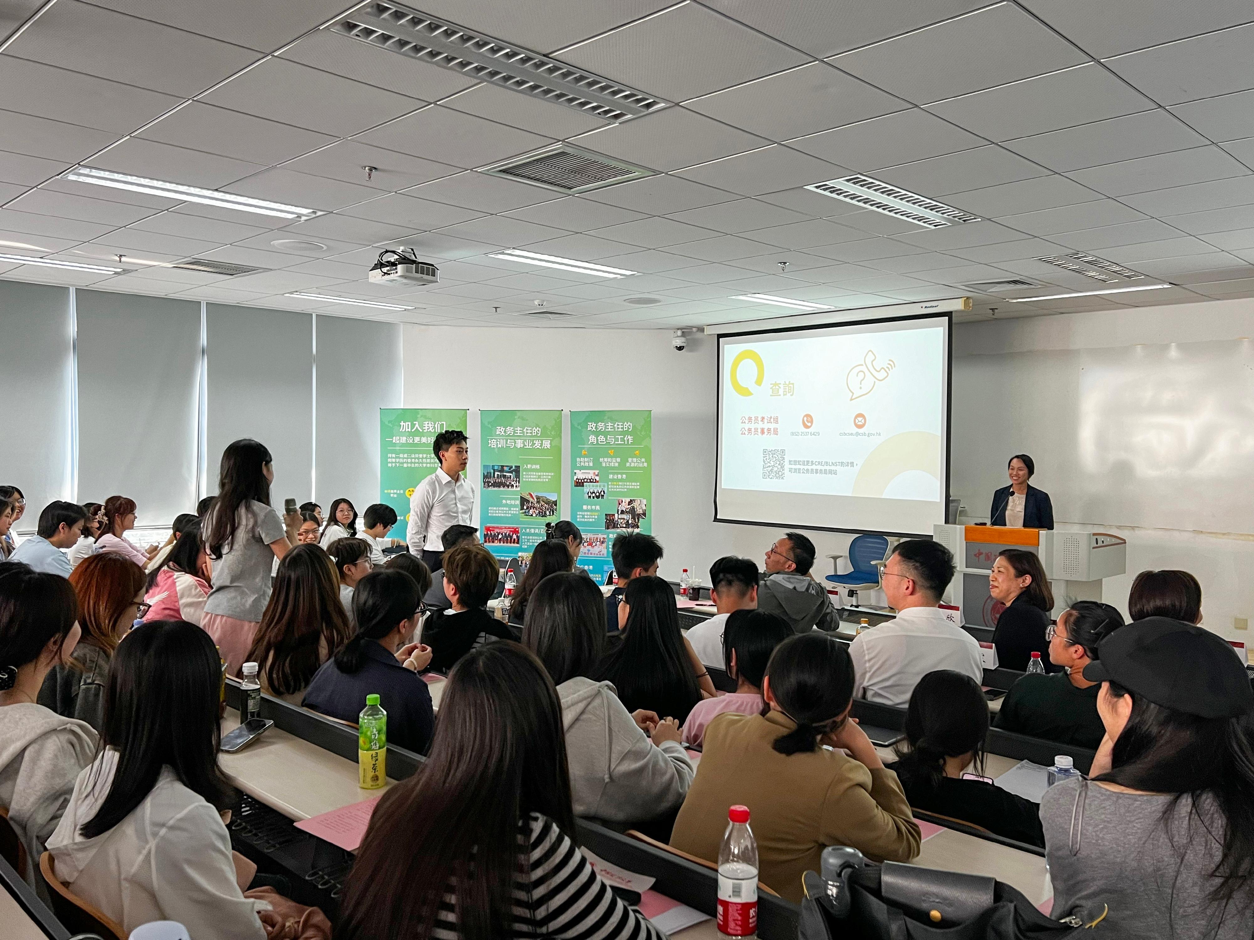 公務員事務局是次更特別安排了曾於內地升學或居住的現職政務主任和行政主任,在講座上分享工作體會及自身經驗,鼓勵大學生加入公務員行列。負責政務職系管理的公務員事務局首席助理秘書長潘慧欣和高級首席行政主任(一般職系)馬美華分別在講座上介紹政務主任和行政主任的入職要求、培訓計劃、考試面試流程,以及應考心得。