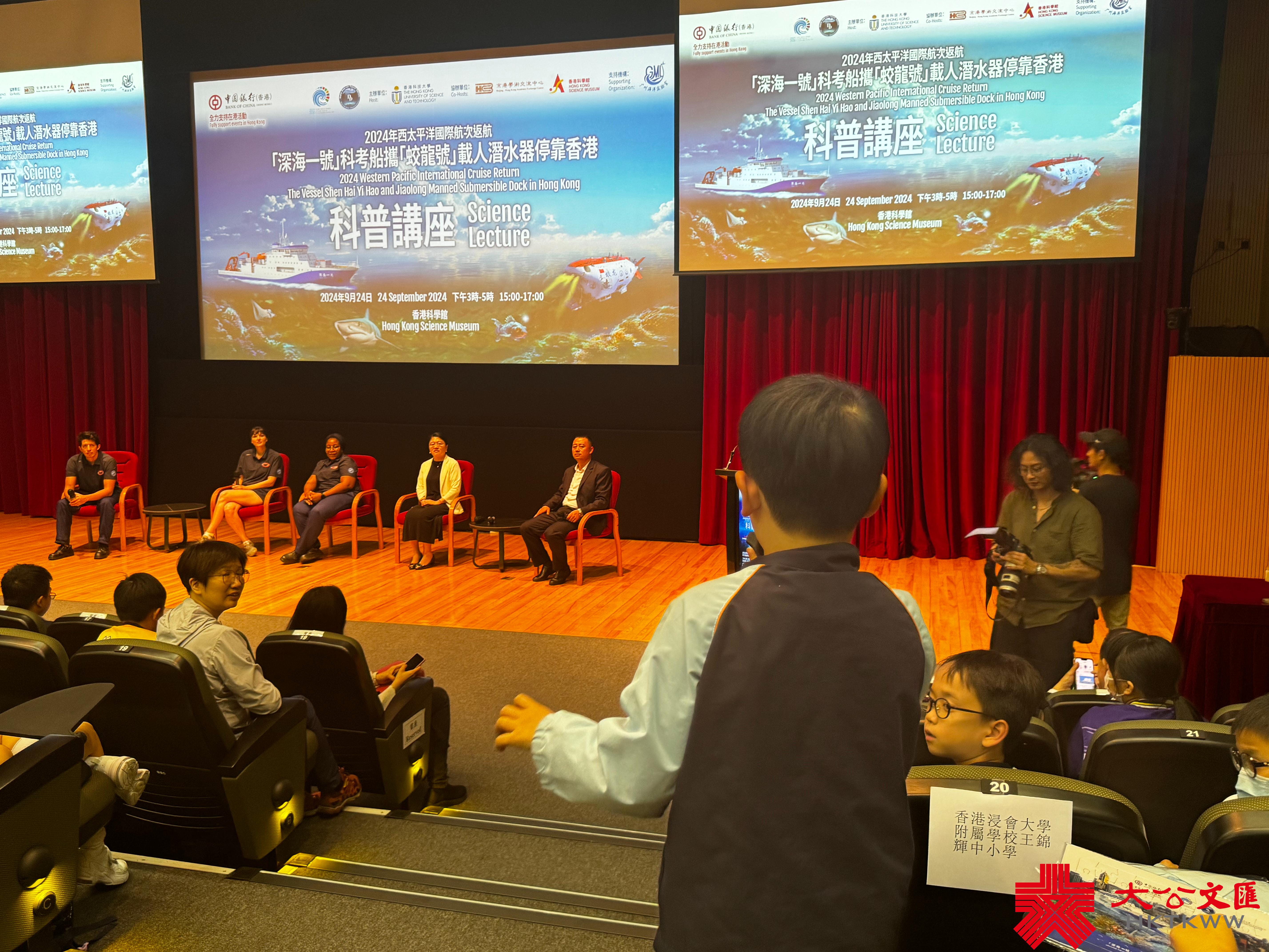 (大公文匯全媒體 記者 周傾芫)中國科研考察船「深海一號」和「蛟龍號」今日(24日)首次抵達香港。相關領域的專家學者在香港科學館為中小學生舉辦了一場別開生面的科普講座,現場氣氛熱烈,學生們積極提問,對深海世界的奧秘表現出濃厚的興趣。
