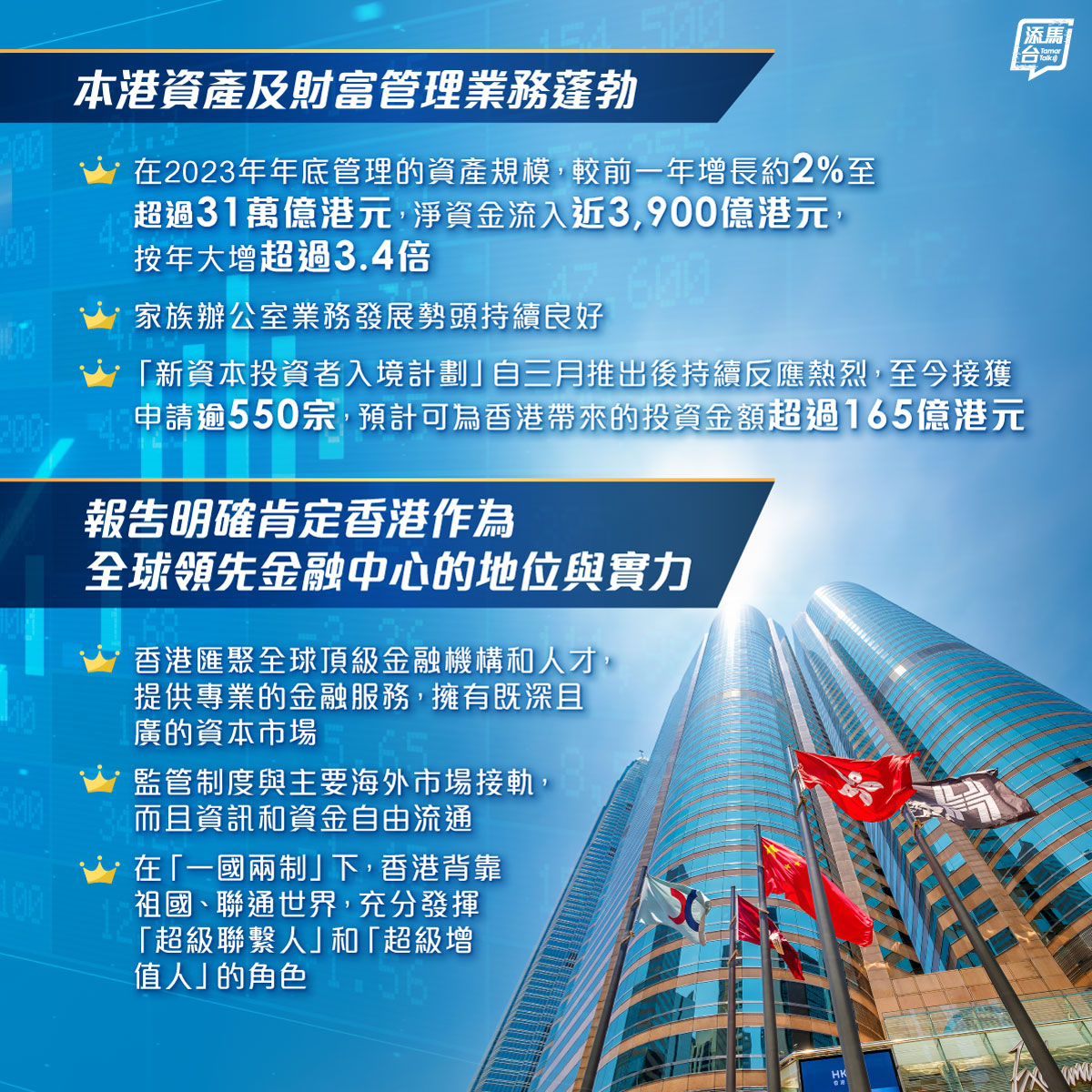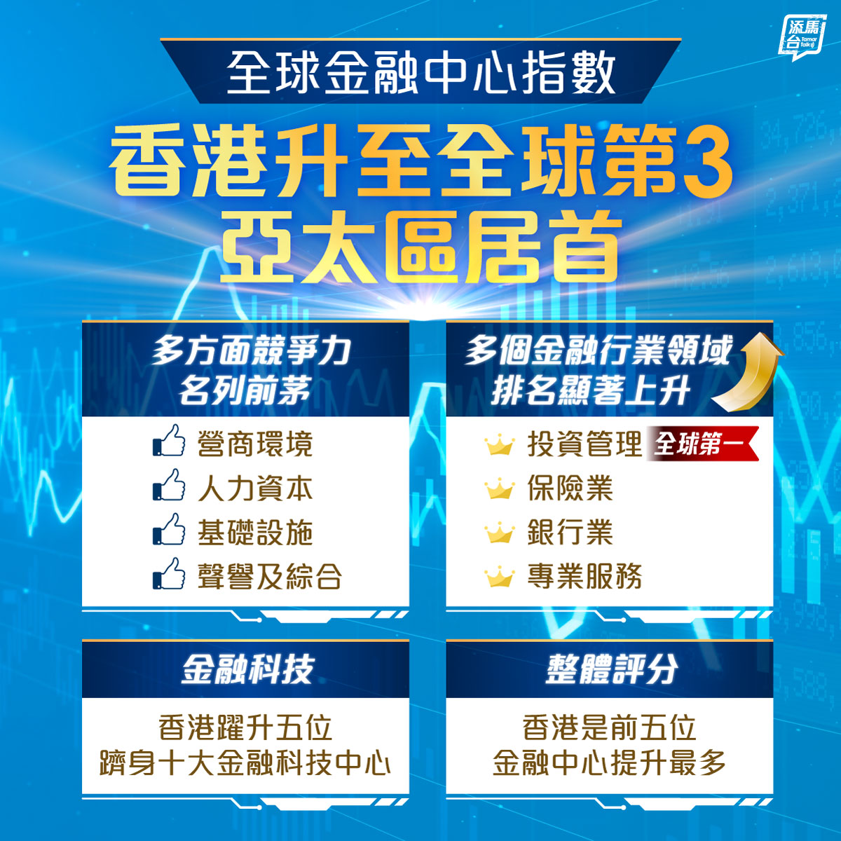 新一期《全球金融中心指數》報告今日(9月24日)發布,香港總排名全球第3,較今年3月上升一位,並在亞太區居首;整體評分上升8分,是前五位金融中心提升最多。報告明確肯定香港作為全球領先金融中心的地位與實力。