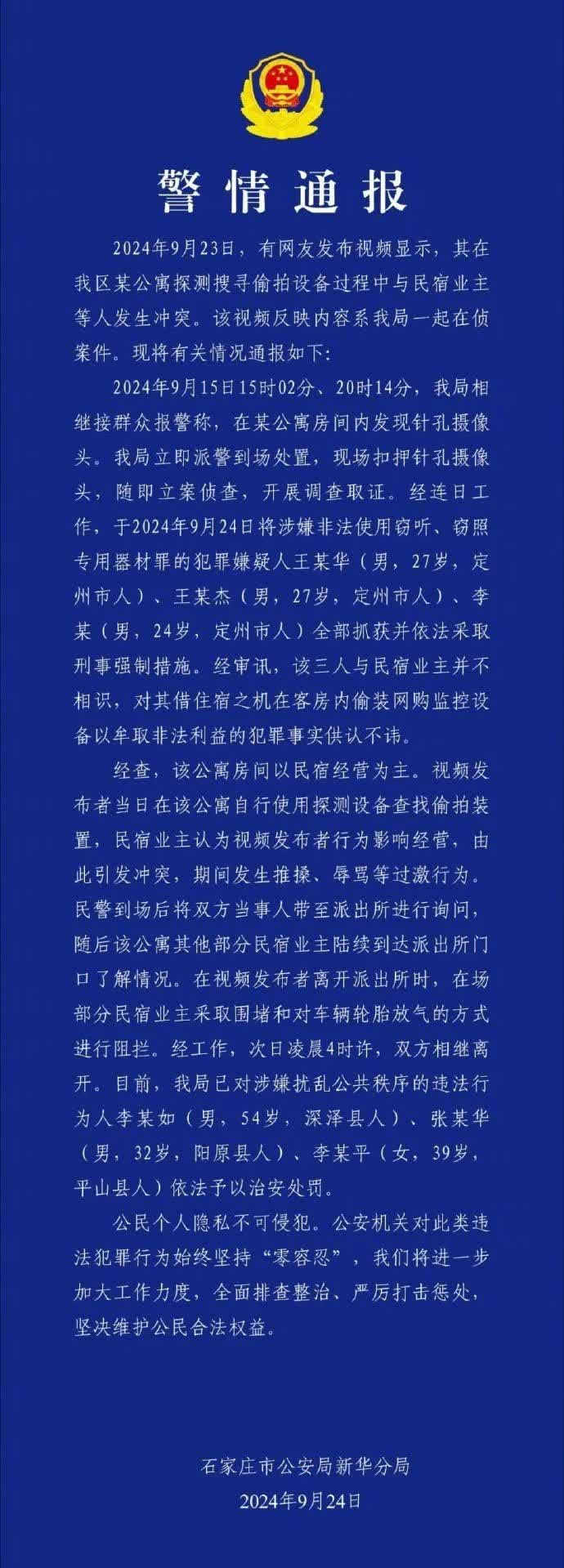 經查,該公寓房間以民宿經營為主。視頻發布者當日在該公寓自行使用探測設備查找偷拍裝置,民宿業主認為視頻發布者行為影響經營,由此引發衝突,期間發生推搡、辱罵等過激行為。民警到場後將雙方當事人帶至派出所進行詢問隨後該公寓其他部分民宿業主陸續到達派出所門口了解情況。在視頻發布者離開派出所時,在場部分民宿業主採取圍堵和對車輛輪胎放氣的方式進行阻攔。經工作,次日凌晨4時許,雙方相繼離開。目前,我局已對涉嫌擾亂公共秩序的違法行為人李某如(男,54歲,深澤縣人)、張某華(男,32歲,陽原縣人)、李某平(女,39歲平山縣人)依法予以治安處罰。