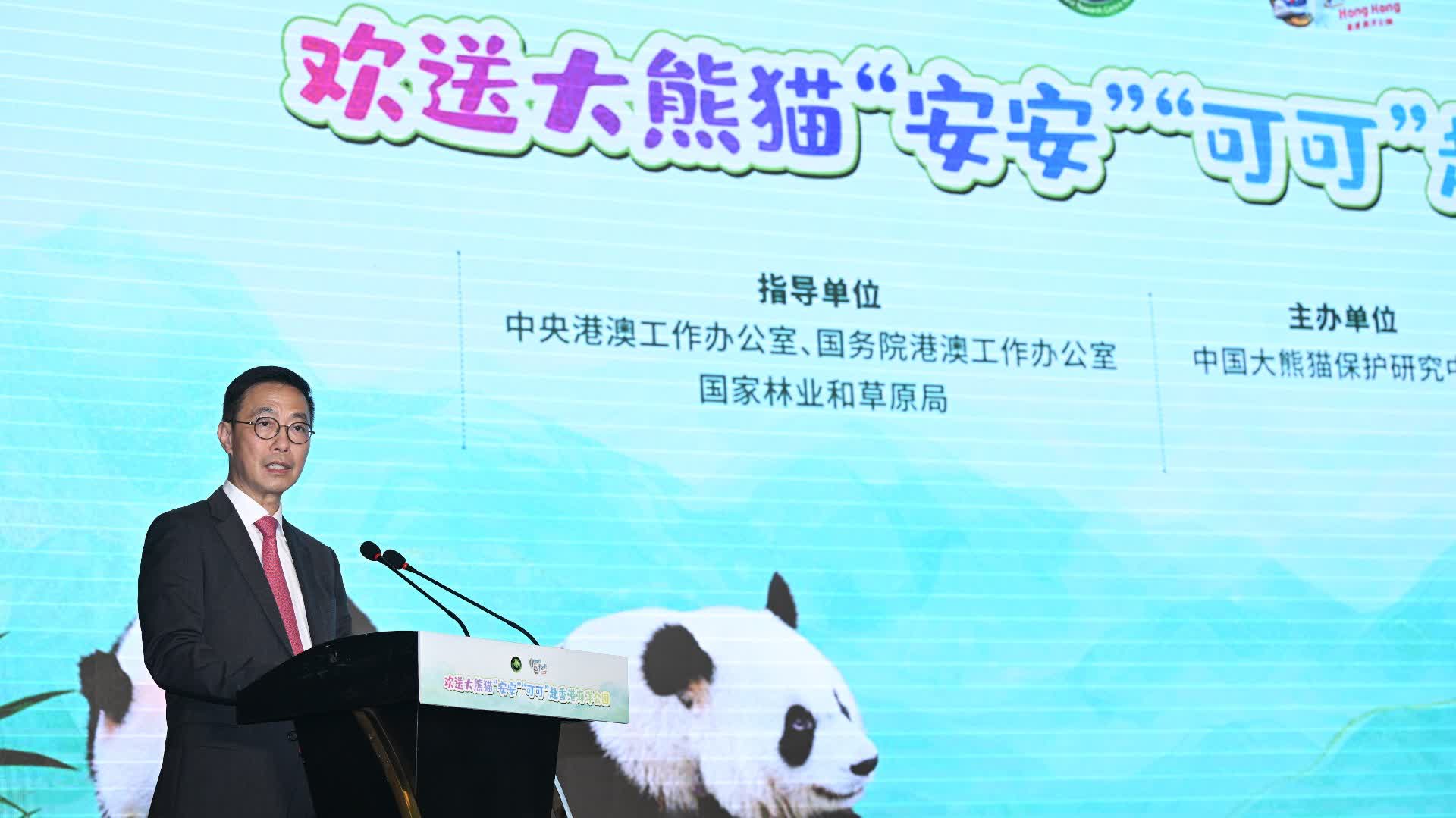 (大公文匯全媒體記者 孫夢璐)中國大熊貓保護研究中心今日(25日)在四川都江堰舉辦「歡送大熊貓『安安』『可可』赴港」儀式。文化體育及旅遊局局長楊潤雄表示,兩隻大熊貓將於明日(26日)乘坐飛機來到香港,特區政府及海洋公園等各方都已做好多重準備,迎接大熊貓加入香港大家庭。