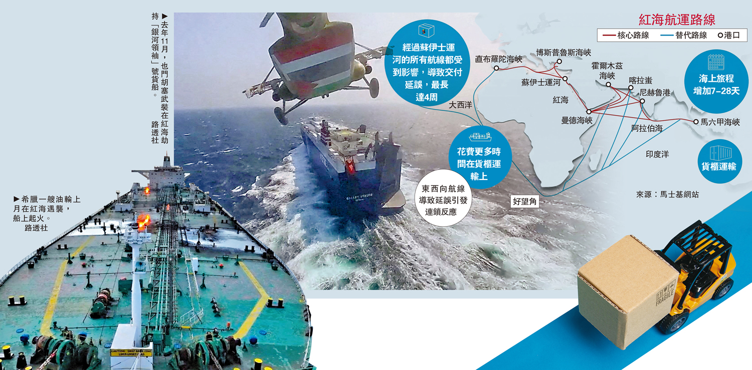 自去年10月7日新一輪巴以衝突爆發以來,也門胡塞武裝頻頻襲擊行經紅海的外國商船,迫使多國貨輪避開蘇伊士運河,繞行南非好望角,航程延遲10-14天,導致部分商品短缺,變相推高物流成本。航運巨擘馬士基此前指出,紅海危機對全球供應鏈的衝擊,已從遠東─歐洲航線擴大至全球。隨着巴以衝突持續外溢,紅海危機的負面影響不斷外擴,從喝茶喝咖啡到買車買傢具,普通民眾生活的方方面面都受到很大影響。