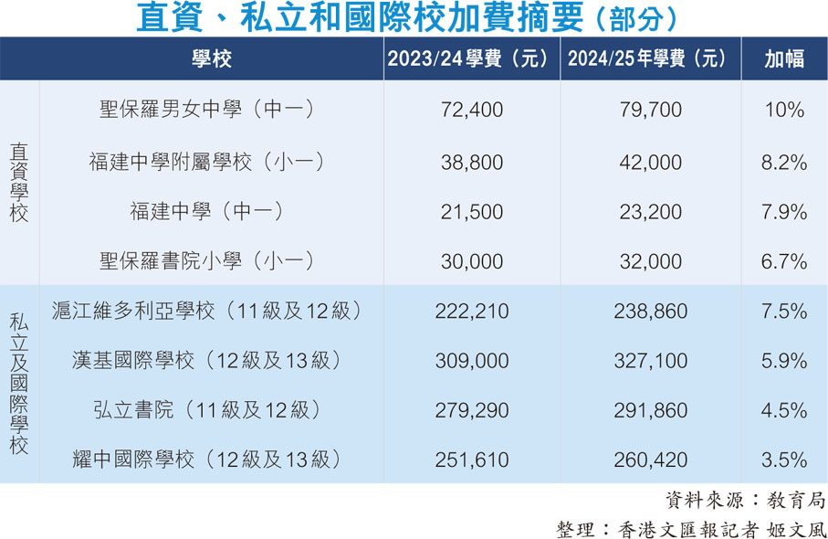 教育局資料顯示,今年直資校加幅最高為10%,分別有3所小學及3所中學的加幅為5.61%至10%,其餘47所中小學加幅為5.6%或以下。香港文匯報翻查各校最新《收費證明書》,聖保羅男女中學中一級學費從去年72,400元升至79,700元,加幅約10%;福建中學附屬學校加約8.2%;福建中學加約7.9%;聖保羅書院小學加約6.7%。另一方面,過去19年來學費均維持在每年3.8萬元的拔萃女書院,2024/25學年獲批准上調至每年4萬元,按年加幅5.26%。