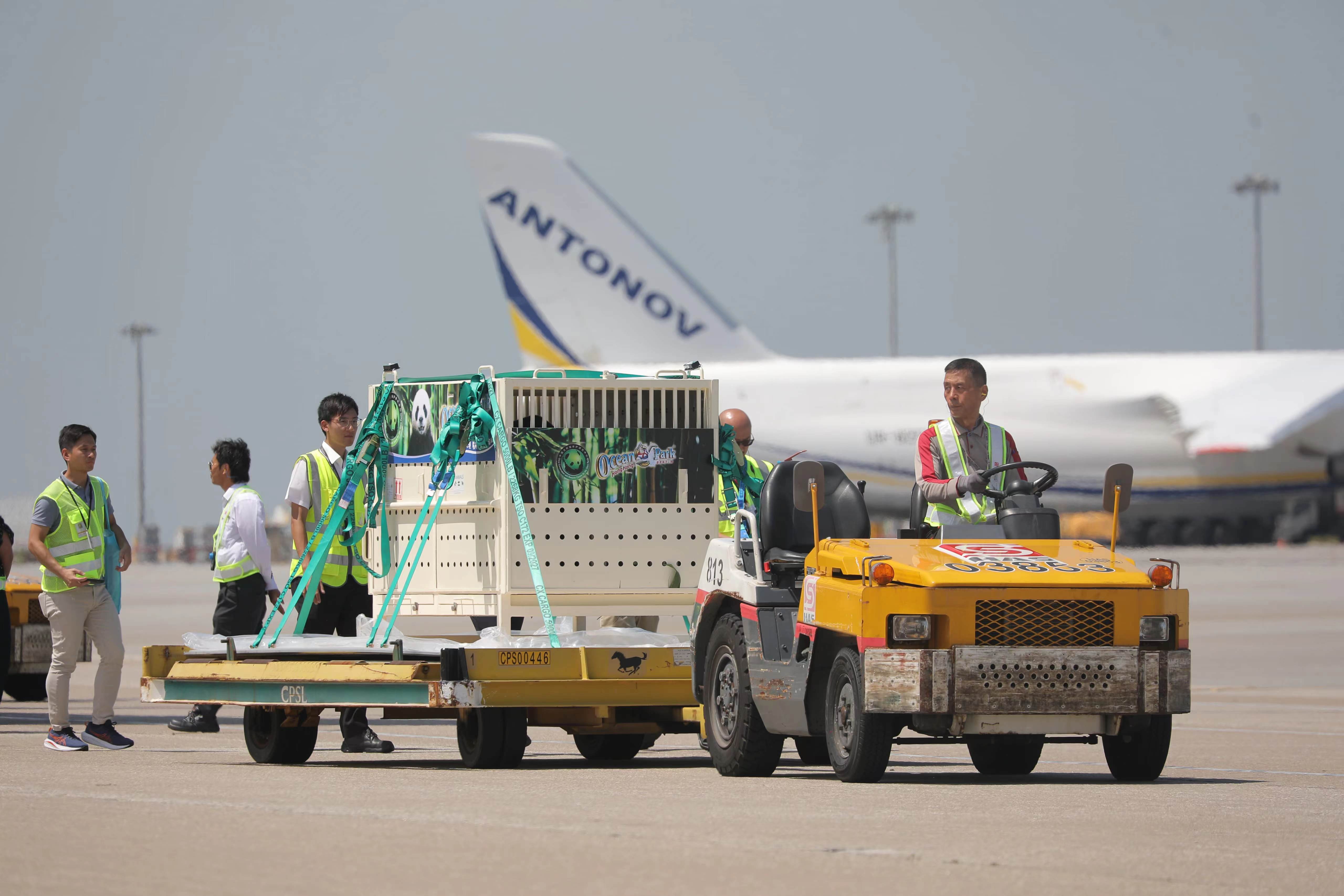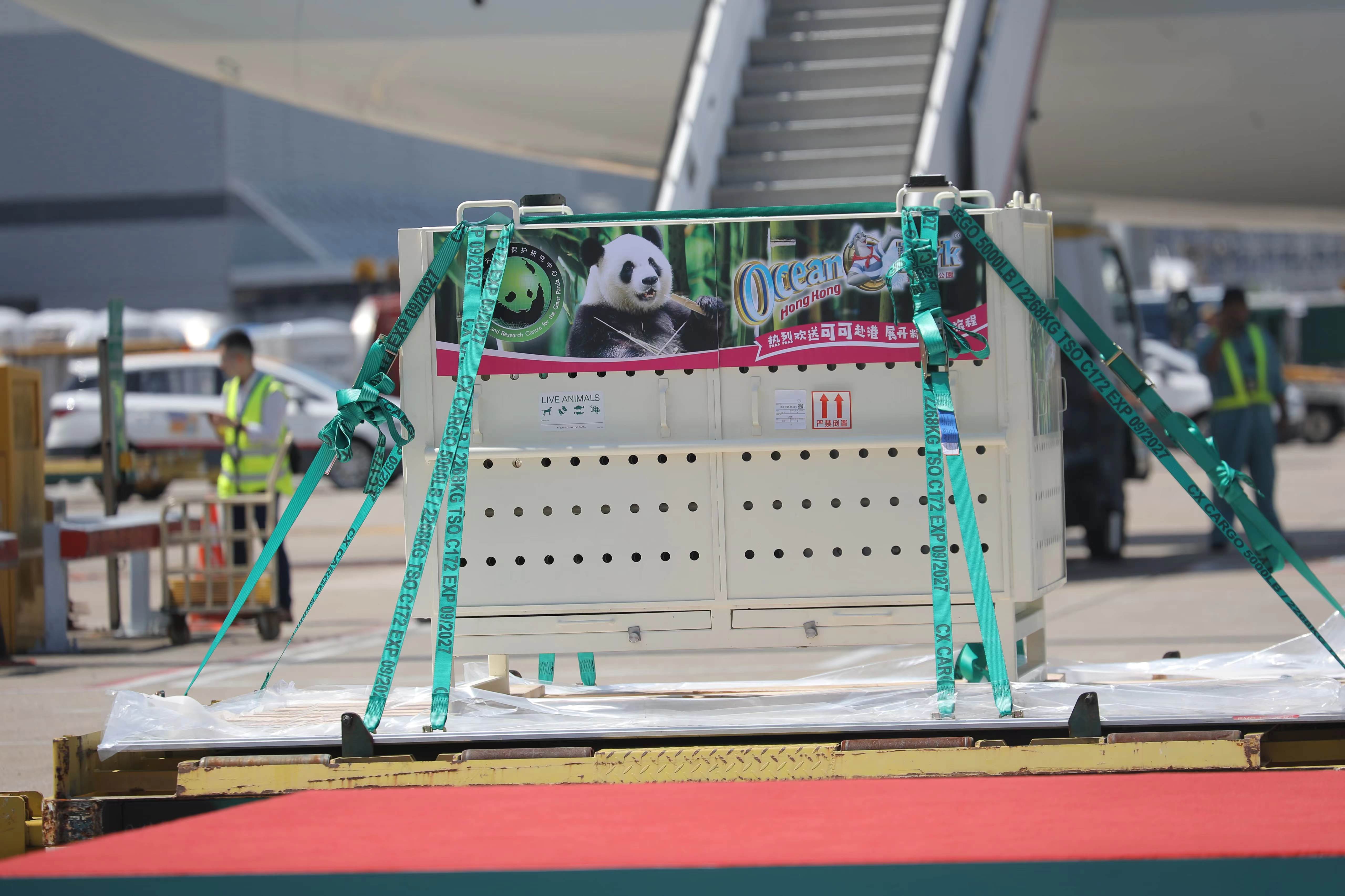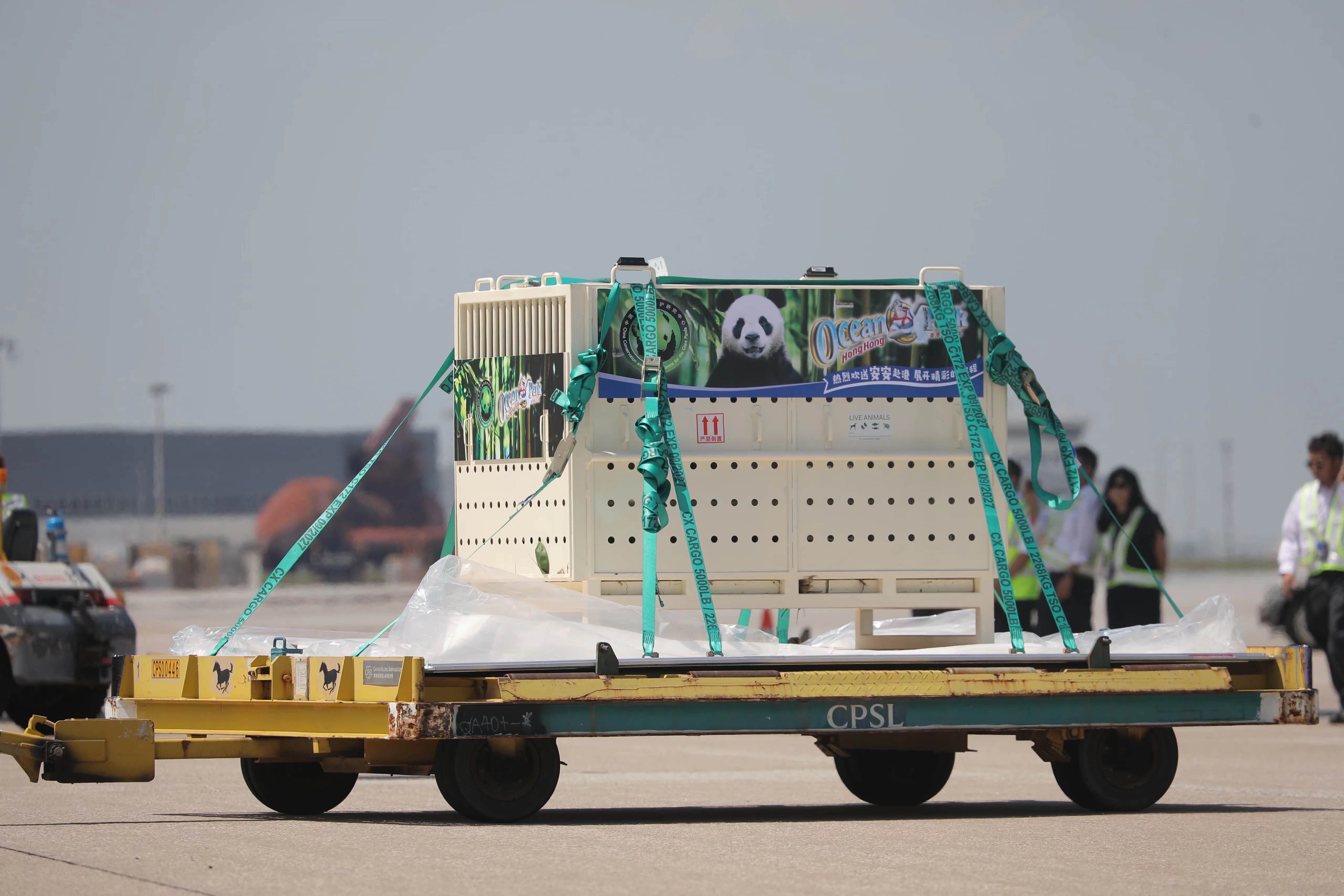大公文匯全媒體記者報道,中央政府贈港大熊貓「安安」「可可」今日上午(26日)抵達香港國際機場,兩隻大熊貓被裝進白色運輸箱內,經升降平台載往地面,並送上搬運車,準備即時送往海洋公園。