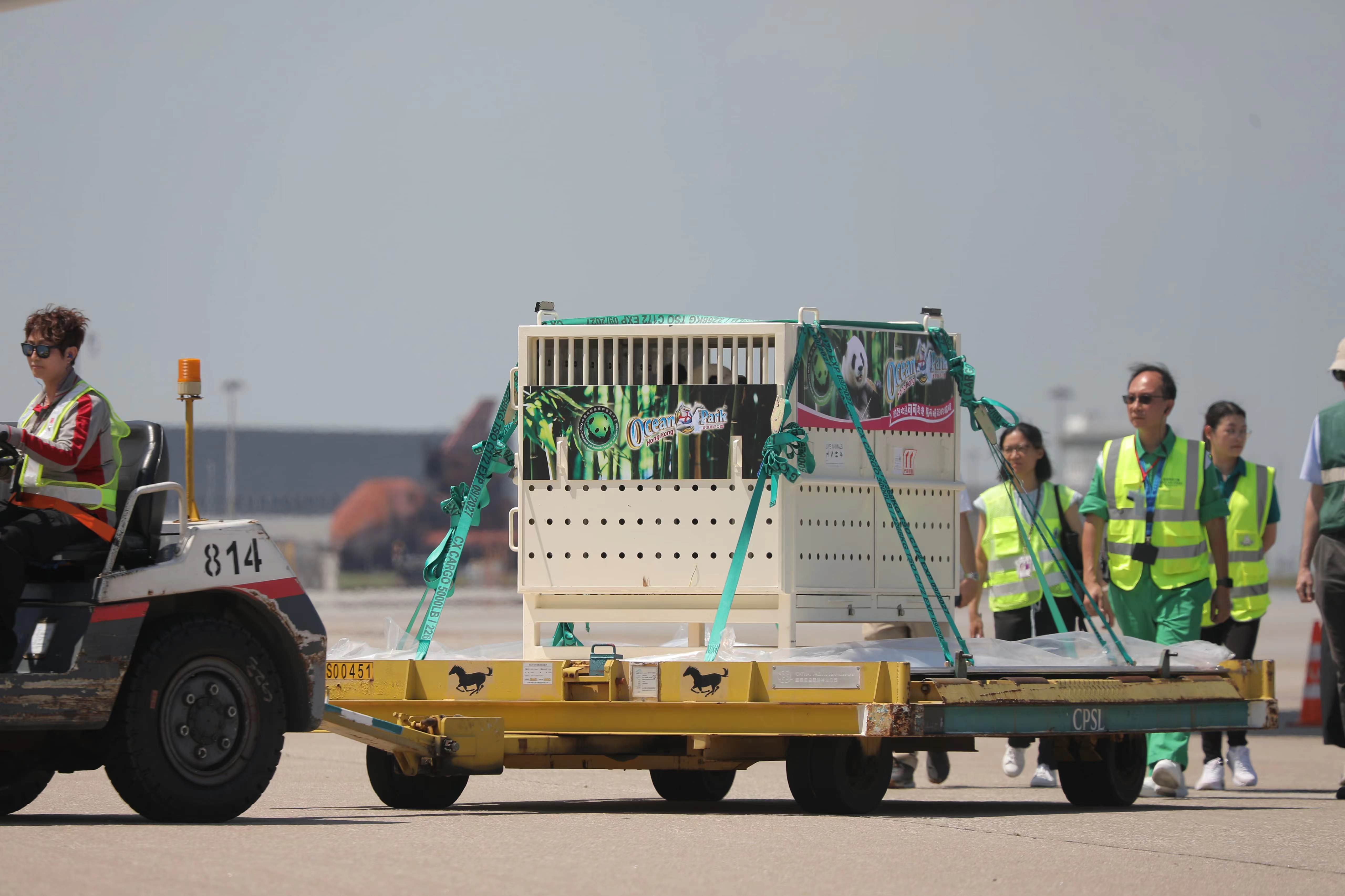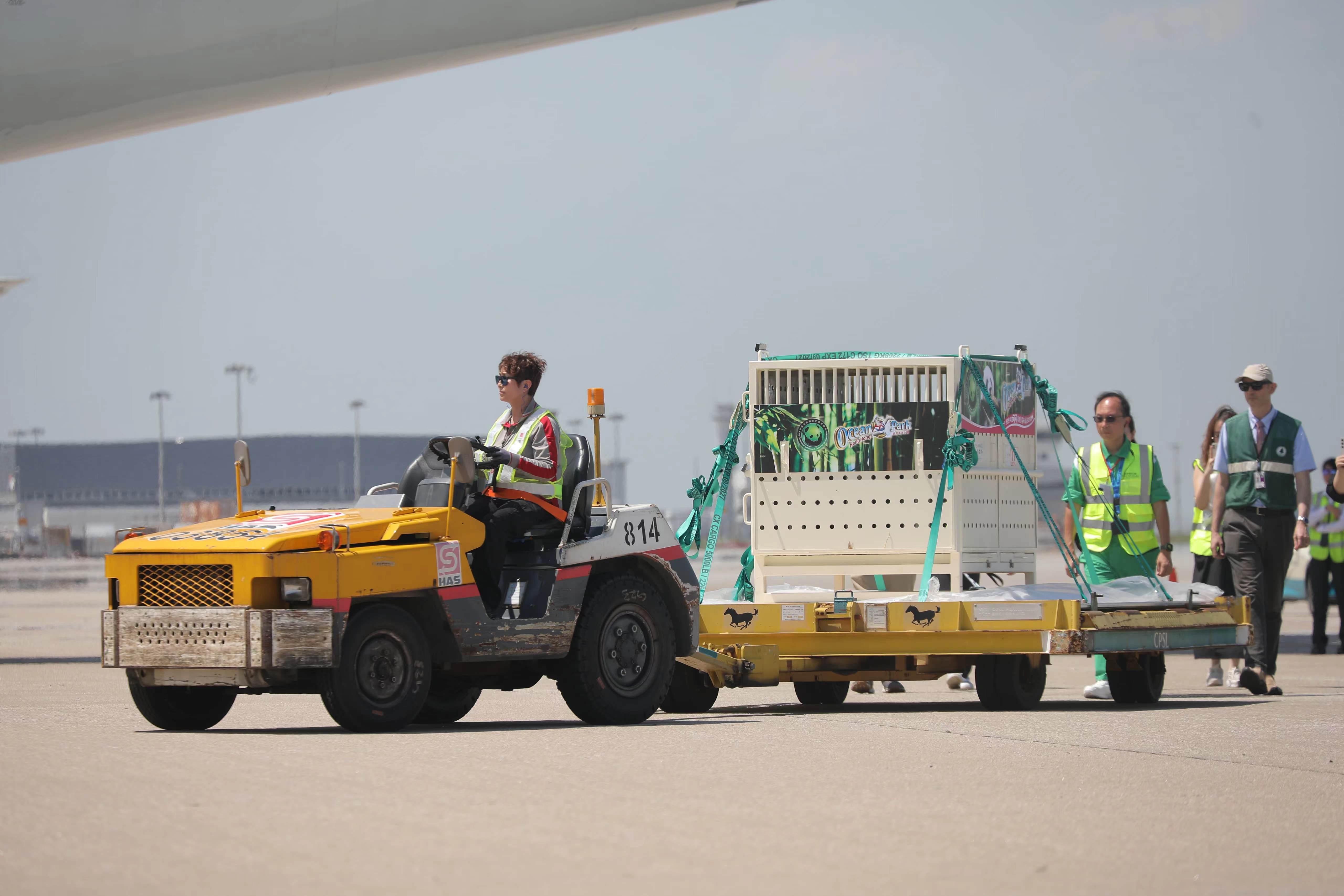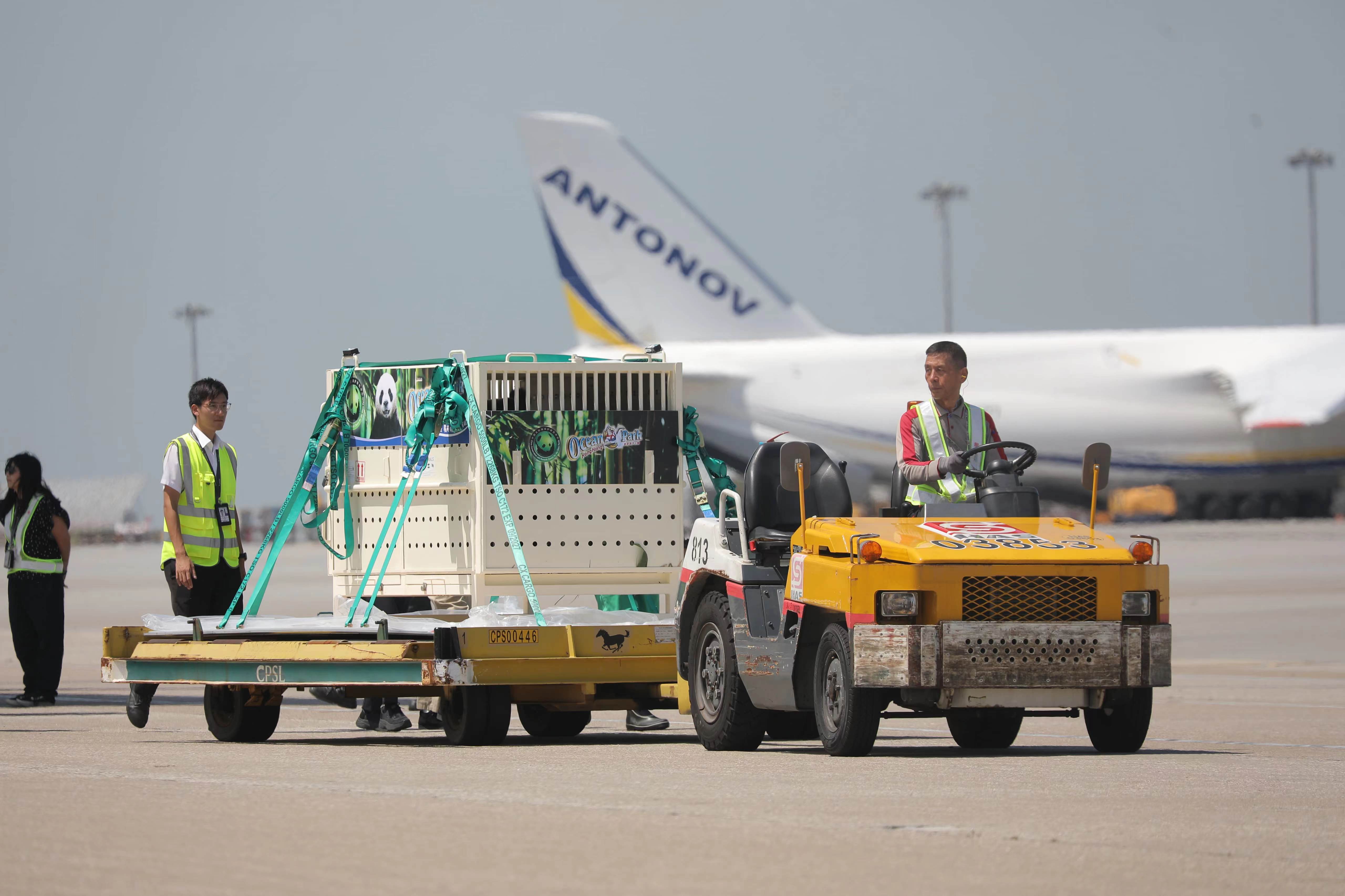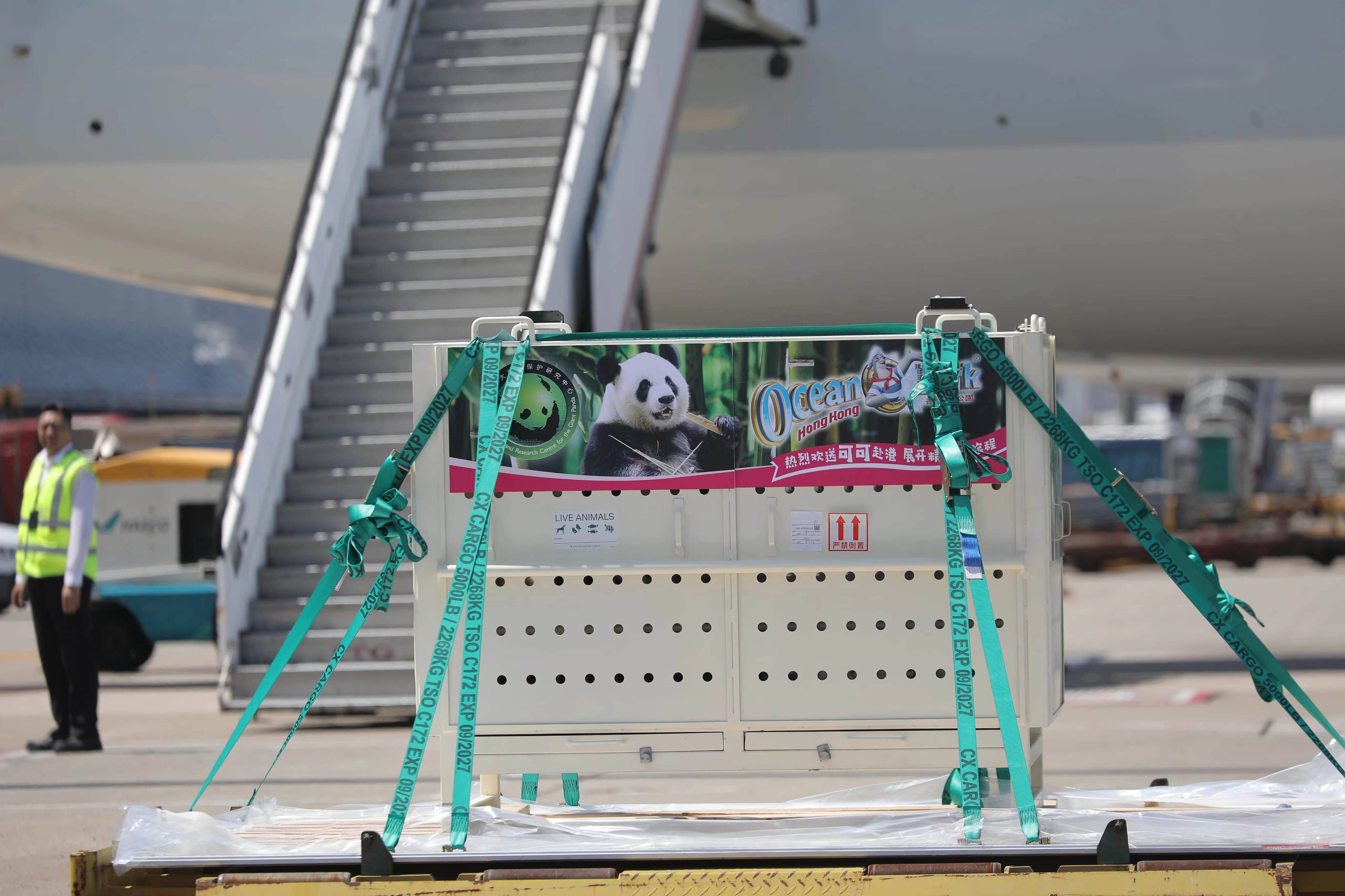 大公文匯全媒體記者報道,中央政府贈港大熊貓「安安」「可可」今日上午(26日)抵達香港國際機場,兩隻大熊貓被裝進白色運輸箱內,經升降平台載往地面,並送上搬運車,準備即時送往海洋公園。