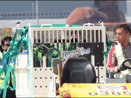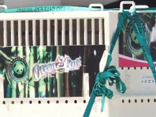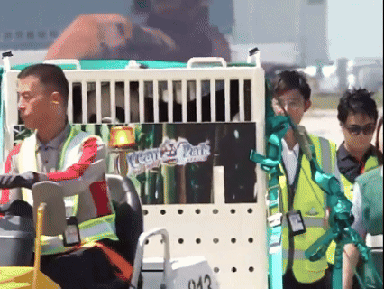 初來乍到,「安安」「可可」下飛機時難掩對新環境的好奇。「安安」性格活潑,不時探頭探腦;而「可可」性格則較安靜,在運輸箱內小心地向外四處張望。