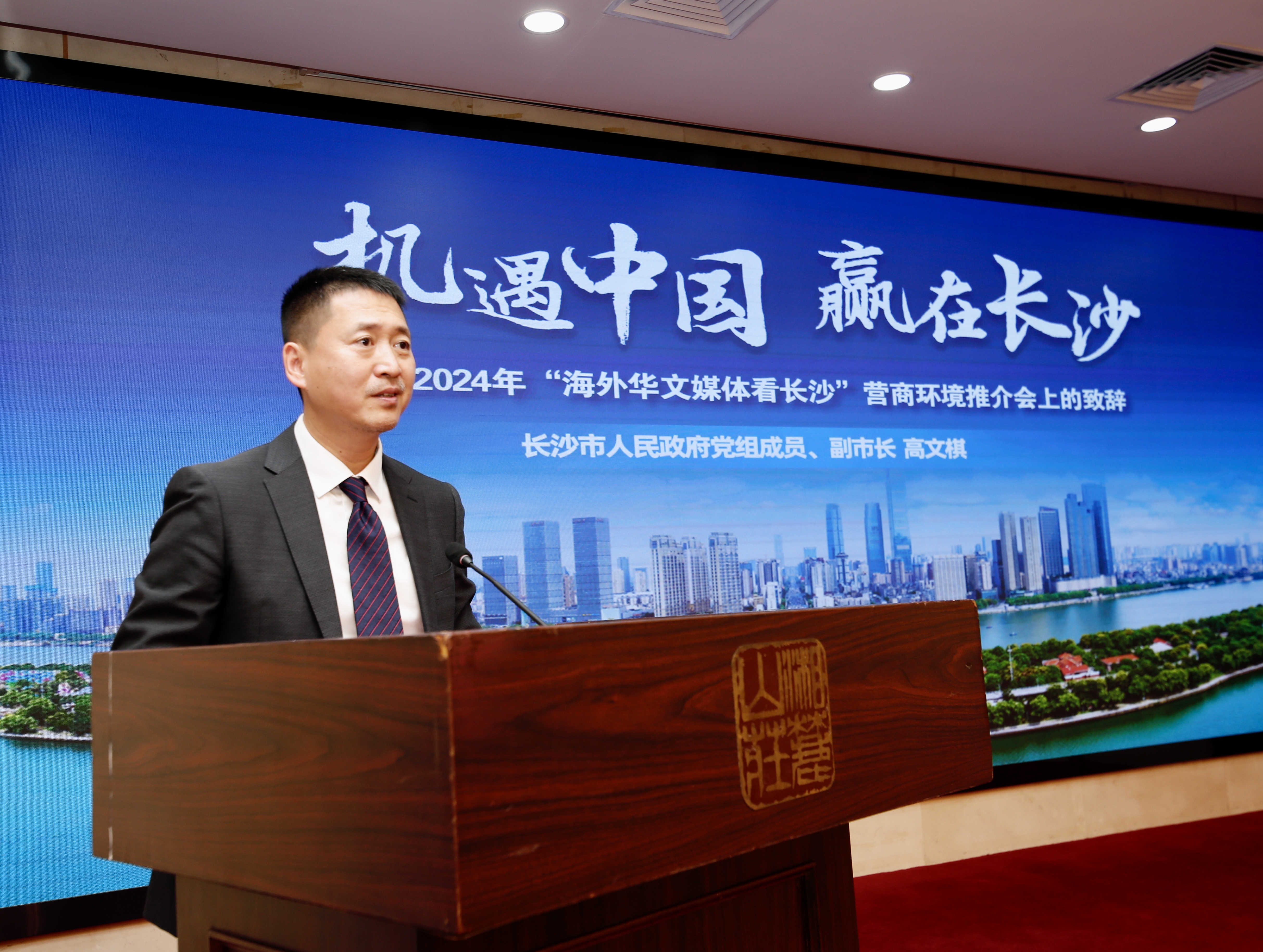 高文棋副市長在致辭中,首先對海外華文媒體代表的到來表示熱烈的歡迎,並感謝他們一直以來對長沙的關注和支持。高文棋指出,長沙作為湖南省的省會城市,近年來在經濟發展、城市建設、文化創新等方面取得了顯著成就。他強調,長沙將繼續秉持開放包容的態度,積極營造市場化、法治化、國際化一流營商環境,為國內外企業提供更加優質、高效的服務。在長沙這片熱土上,海內外企業和優秀人才能夠找到更多的發展機遇,實現更大的發展。