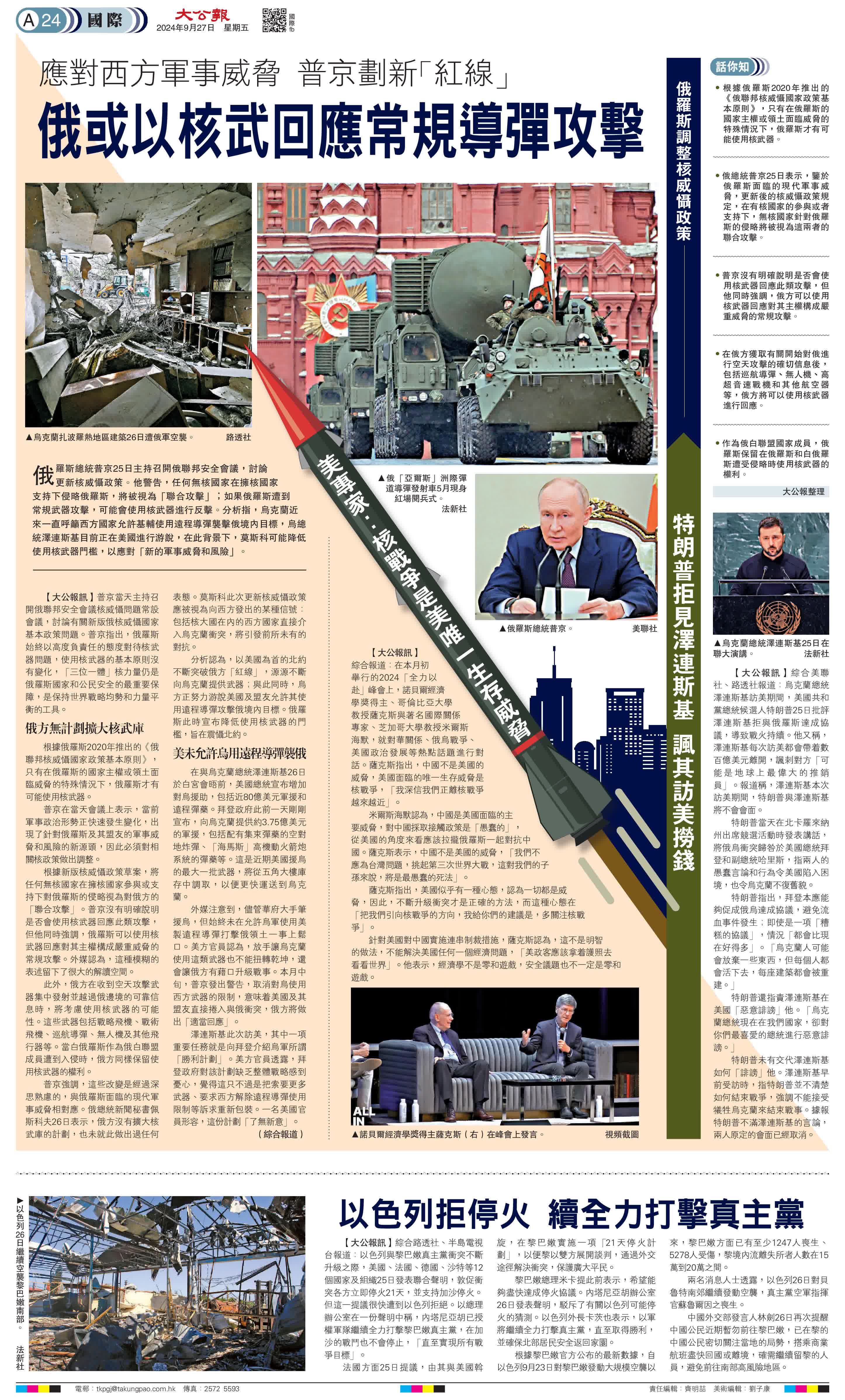 大公報綜合報道,俄羅斯總統普京25日主持召開俄聯邦安全會議,討論更新核威懾政策。他警告,任何無核國家在擁核國家支持下侵略俄羅斯,將被視為「聯合攻擊」;如果俄羅斯遭到常規武器攻擊,可能會使用核武器進行反擊。分析指,烏克蘭近來一直呼籲西方國家允許基輔使用遠程導彈襲擊俄境內目標,烏總統澤連斯基目前正在美國進行游說,在此背景下,莫斯科可能降低使用核武器門檻,以應對「新的軍事威脅和風險」。