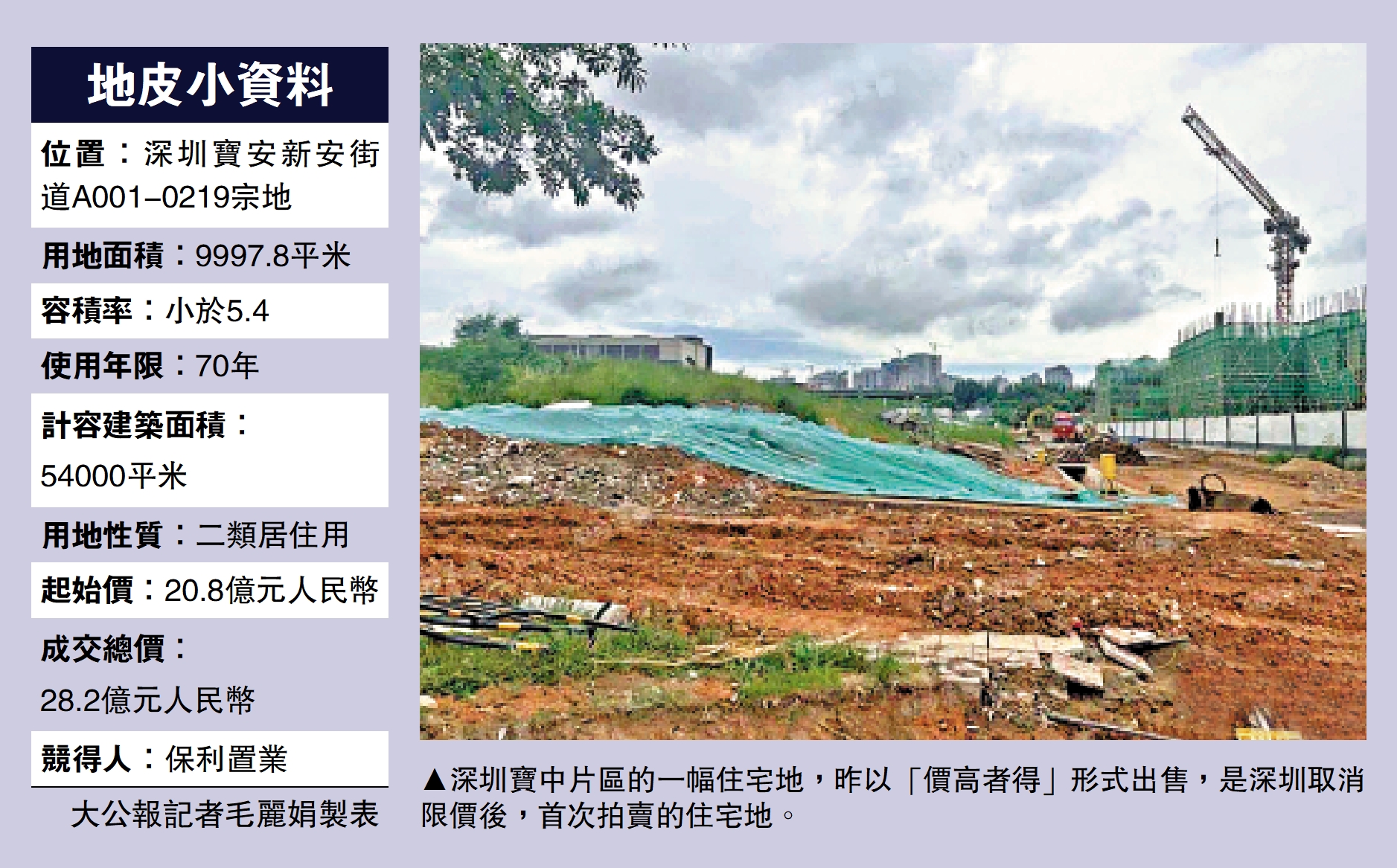 (大公報記者 毛麗娟)昨日,深圳迎來今年第二宗涉宅用地出讓,即位於寶安區新安街道的A001-0219地塊。該地塊位於寶中片區,以「價高者得」形式掛牌出讓,是深圳取消限價後首賣住宅地。吸引9家房企參與競拍,開拍後32分鐘,前後共報價82輪,最終由保利置業旗下惠州市保置房地產開發公司以28.2億元(人民幣,下同)總價競得,較起拍價20.8億元搶貴35.58%。市場人士表示,這塊地皮超過「門檻價」28億元成交,表明市場信心提振,開發商對於後市積極樂觀,市場信心正在恢復。