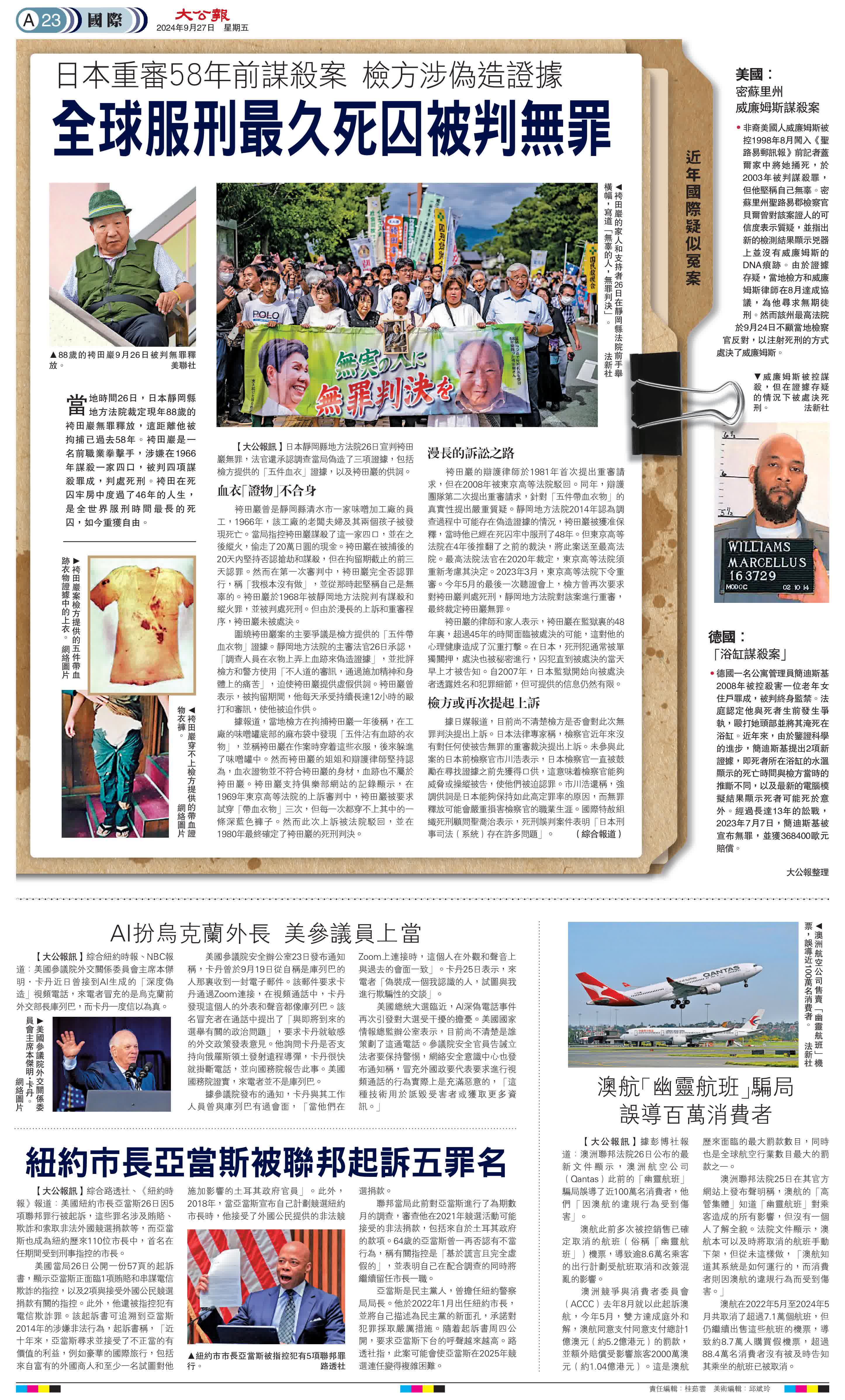 日本靜岡縣地方法院26日宣判袴田巖無罪,法官還承認調查當局偽造了三項證據,包括檢方提供的「五件血衣」證據,以及袴田巖的供詞。