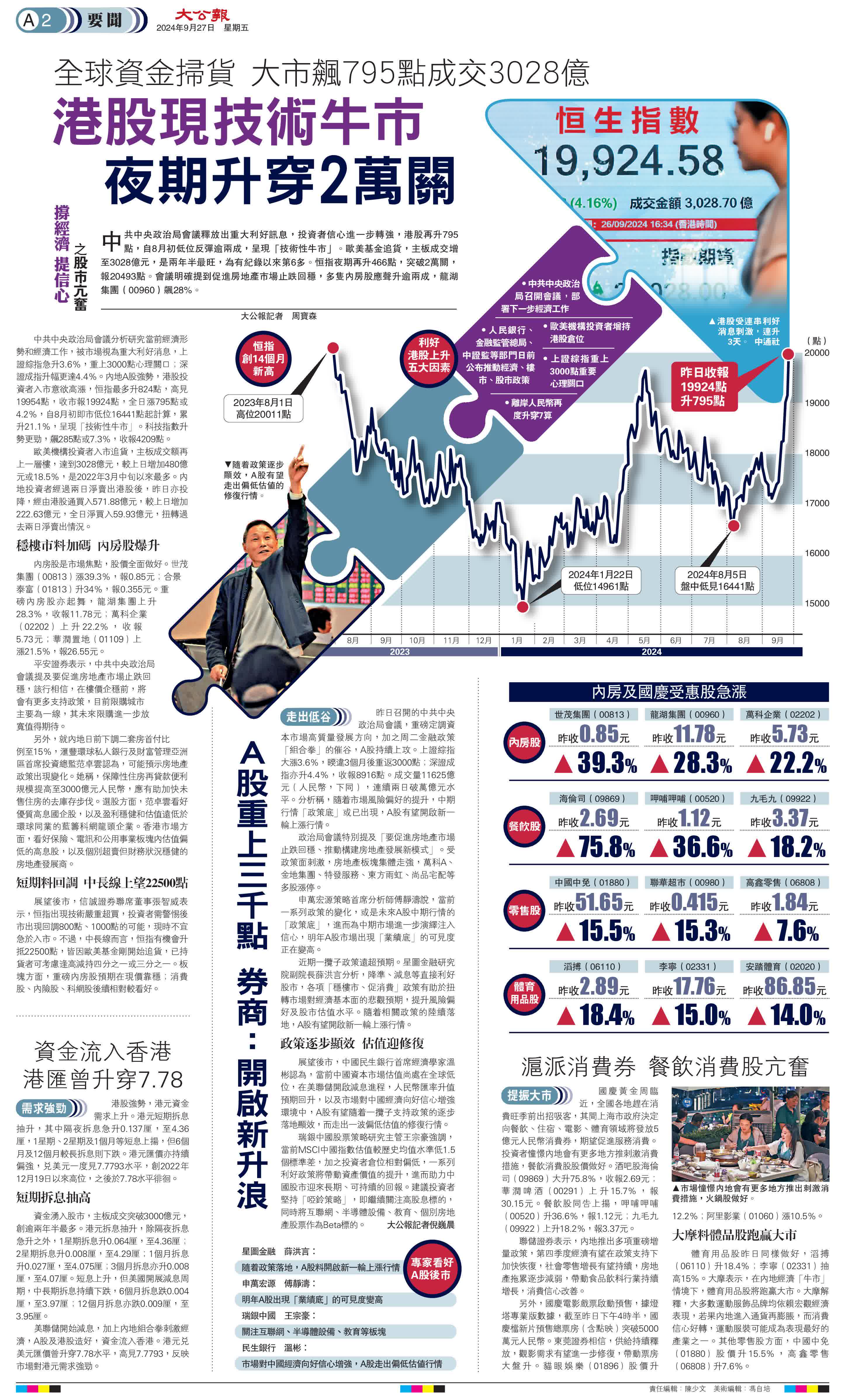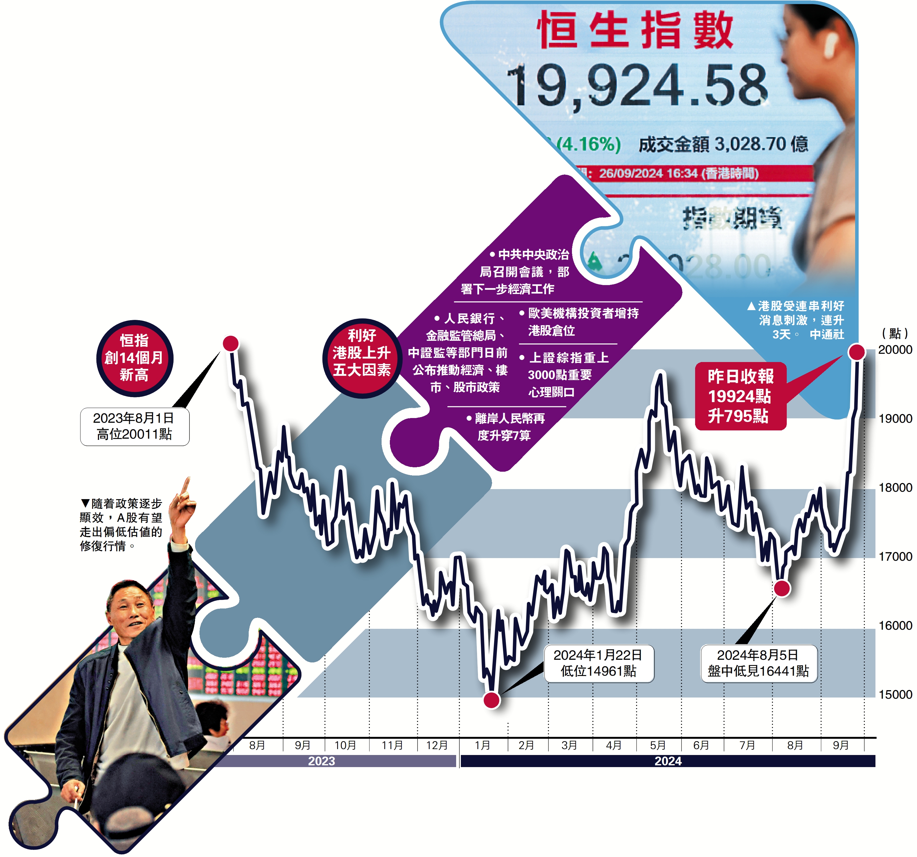 中共中央政治局會議分析研究當前經濟形勢和經濟工作,被市場視為重大利好消息,上證綜指急升3.6%,重上3000點心理關口;深證成指升幅更達4.4%。內地A股強勢,港股投資者入市意欲高漲,恒指最多升824點,高見19954點,收市報19924點,全日漲795點或4.2%,自8月初即市低位16441點起計算,累升21.1%,呈現「技術性牛市」。科技指數升勢更勁,飆285點或7.3%,收報4209點。