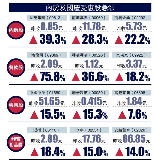 內房股是市場焦點,股價全面做好。世茂集團(00813)漲39.3%,報0.85元;合景泰富(01813)升34%,報0.355元。重磅內房股亦起舞,龍湖集團上升28.3%,收報11.78元;萬科企業(02202)上升22.2%,收報5.73元;華潤置地(01109)上漲21.5%,報26.55元。