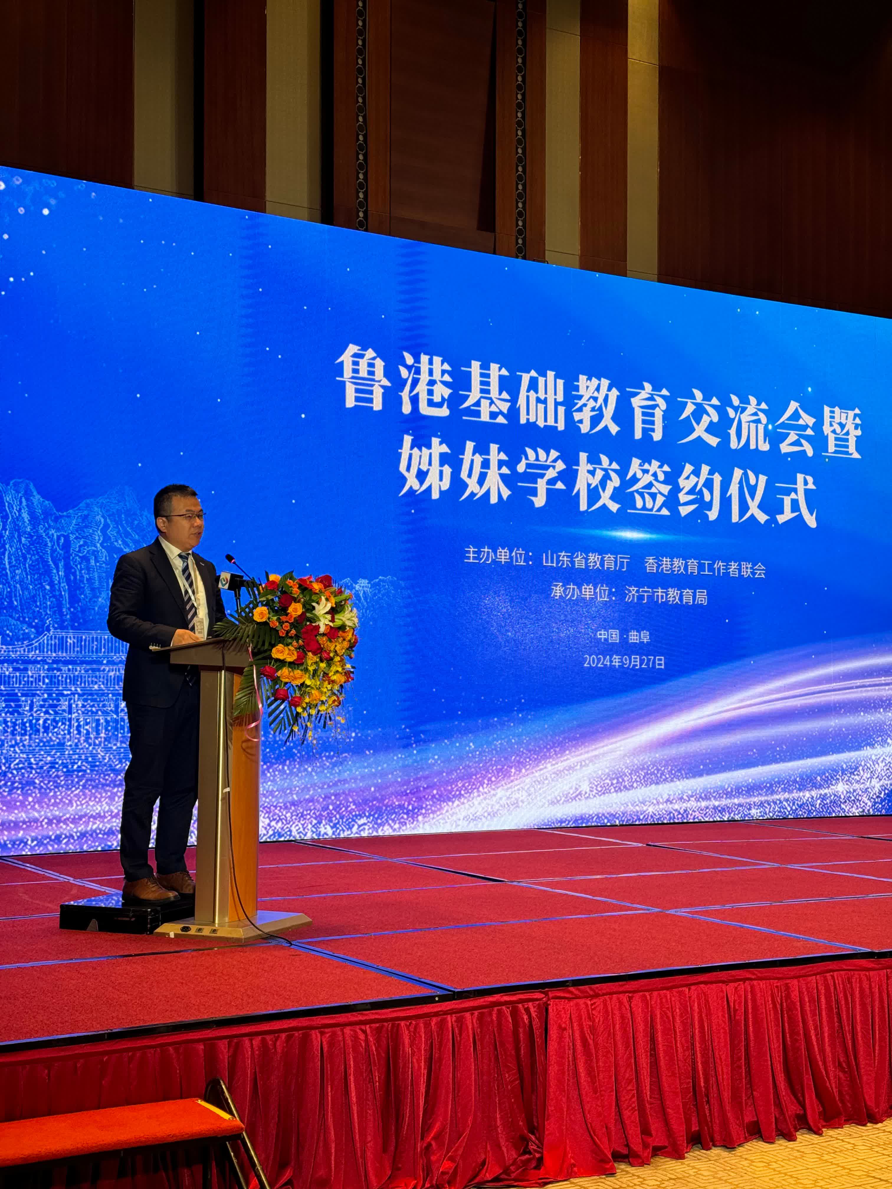 大公文匯網報道,9月27日,魯港基礎教育交流會暨姊妹學校簽約儀式在山東曲阜香格里拉大酒店舉行。魯港本次新簽約27對姊妹學校,已累計締結89對姊妹學校。簽約儀式上,山東省教育廳總督學王志剛、香港教育工作者聯會副會長伍煥傑、山東省委港澳辦二級巡視員范英傑致辭,曲阜市實驗小學校長張居峰、香港創知中學校長黃晶榕進行交流發言。