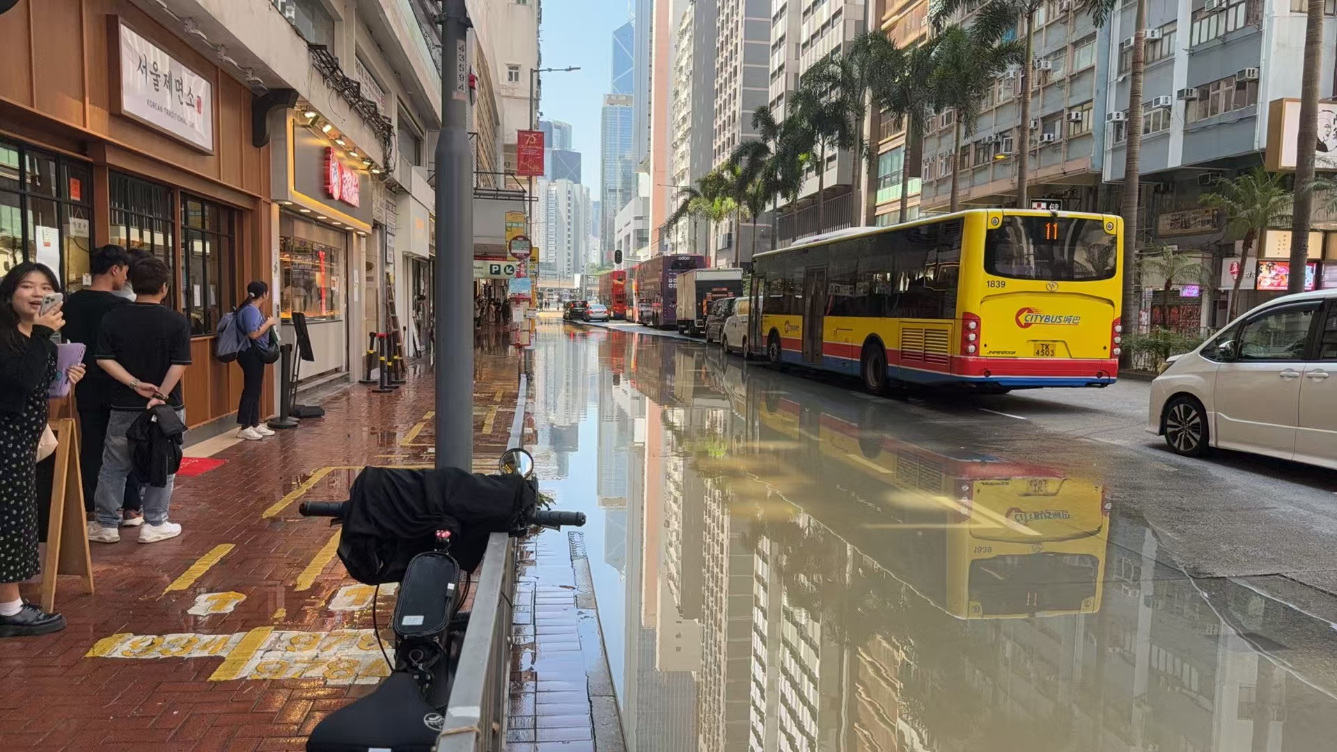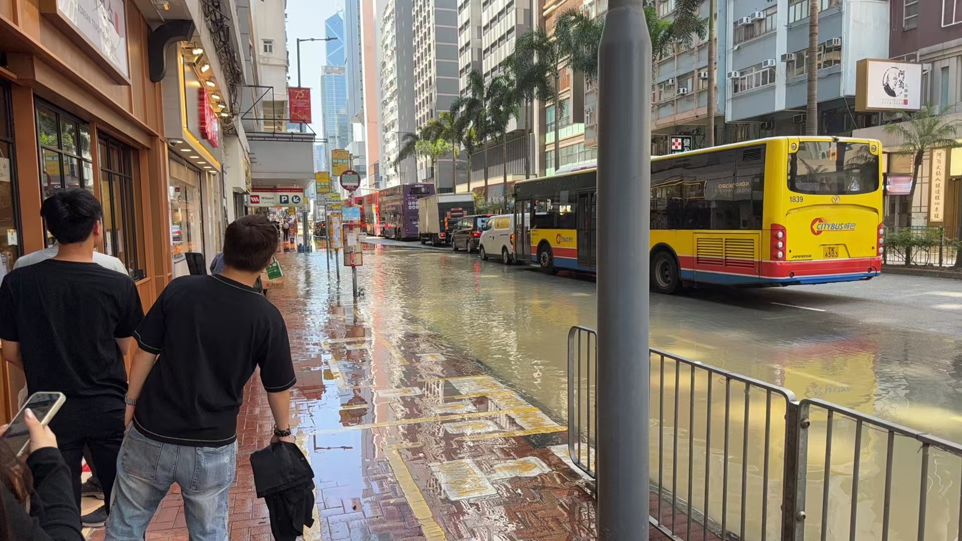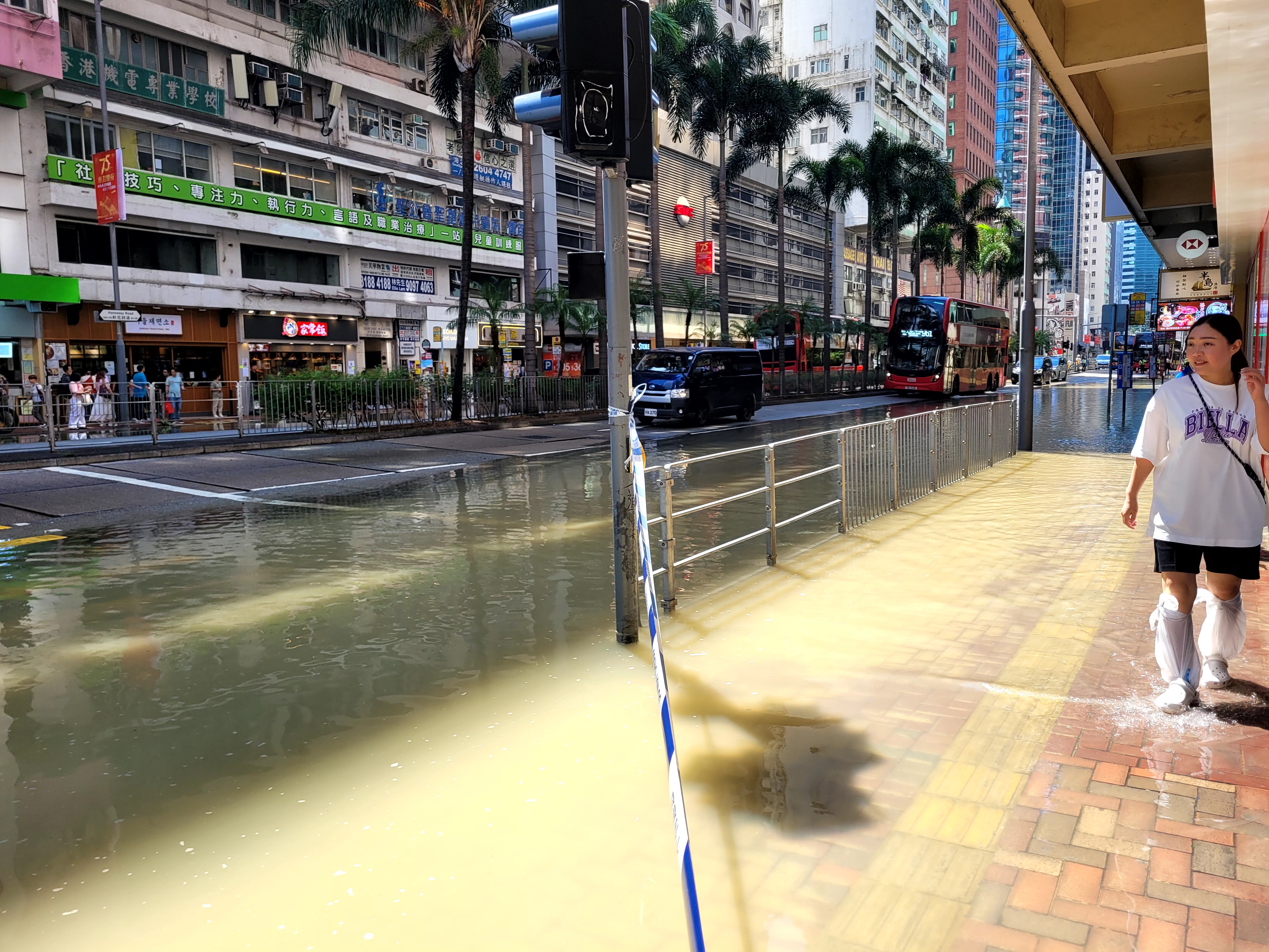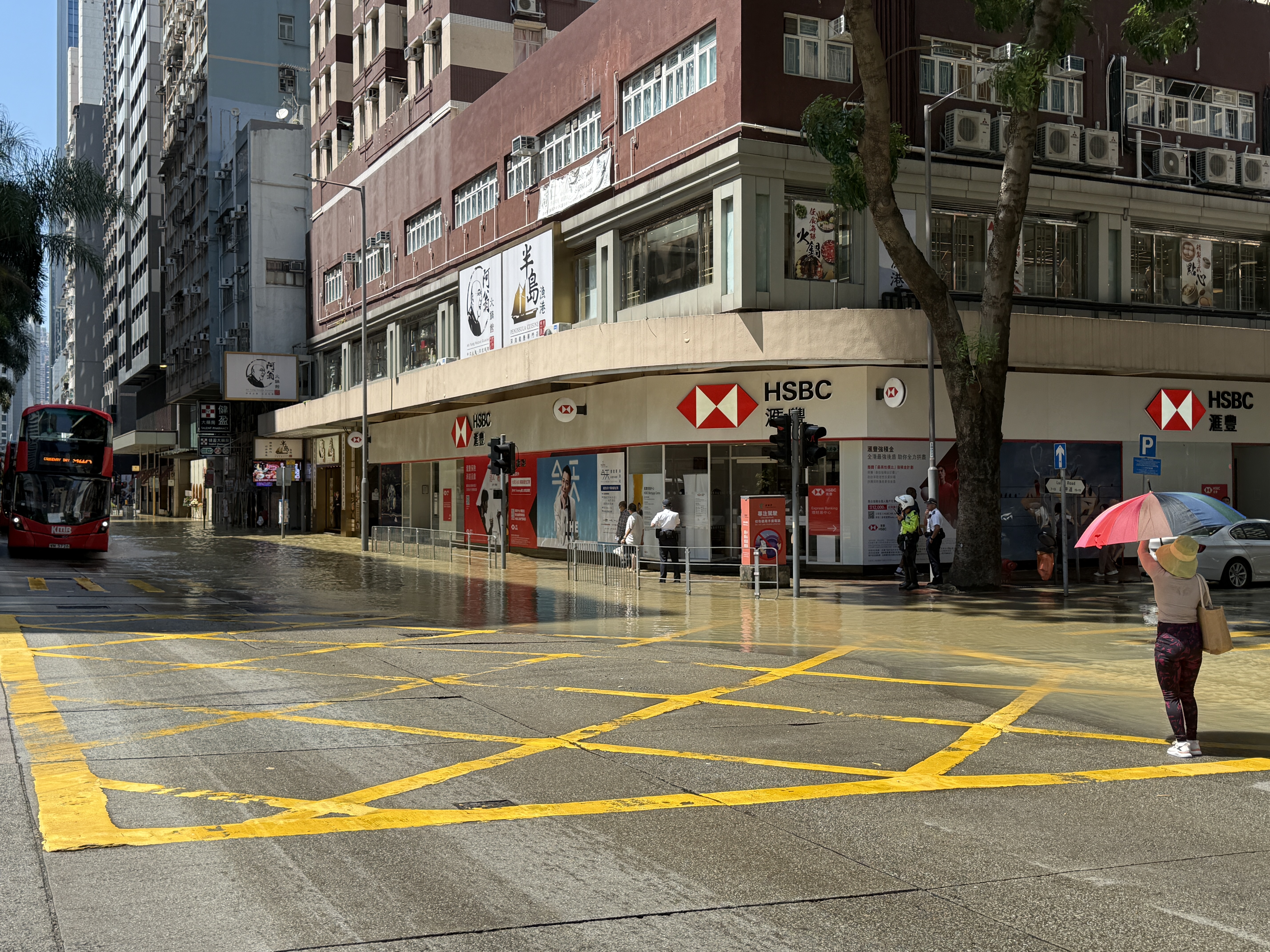據記者現場觀察,水浸範圍目測由東亞大樓到滙豐銀行一帶,臨街的巴士站已被淹,另一側路段亦被淹浸約一半。該路段交通堵塞,有交通警察在現場進行交通疏導。