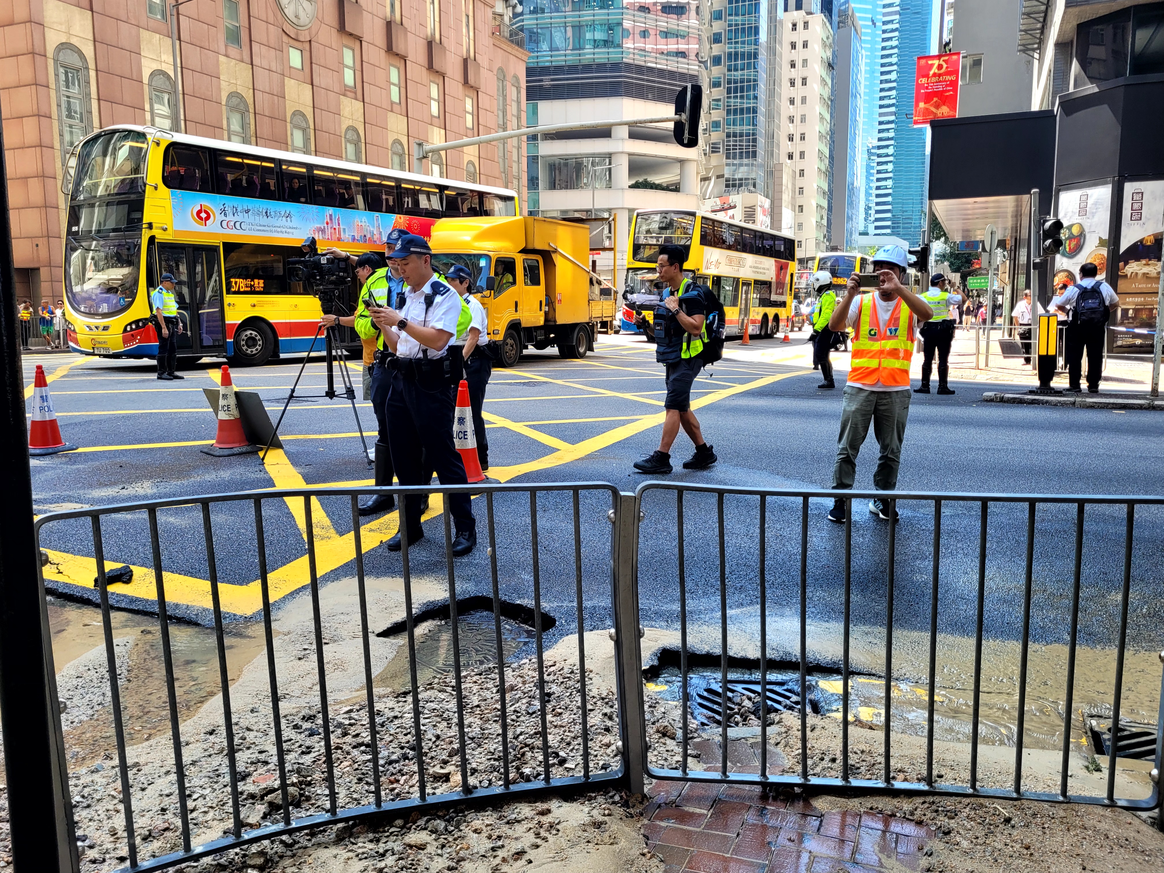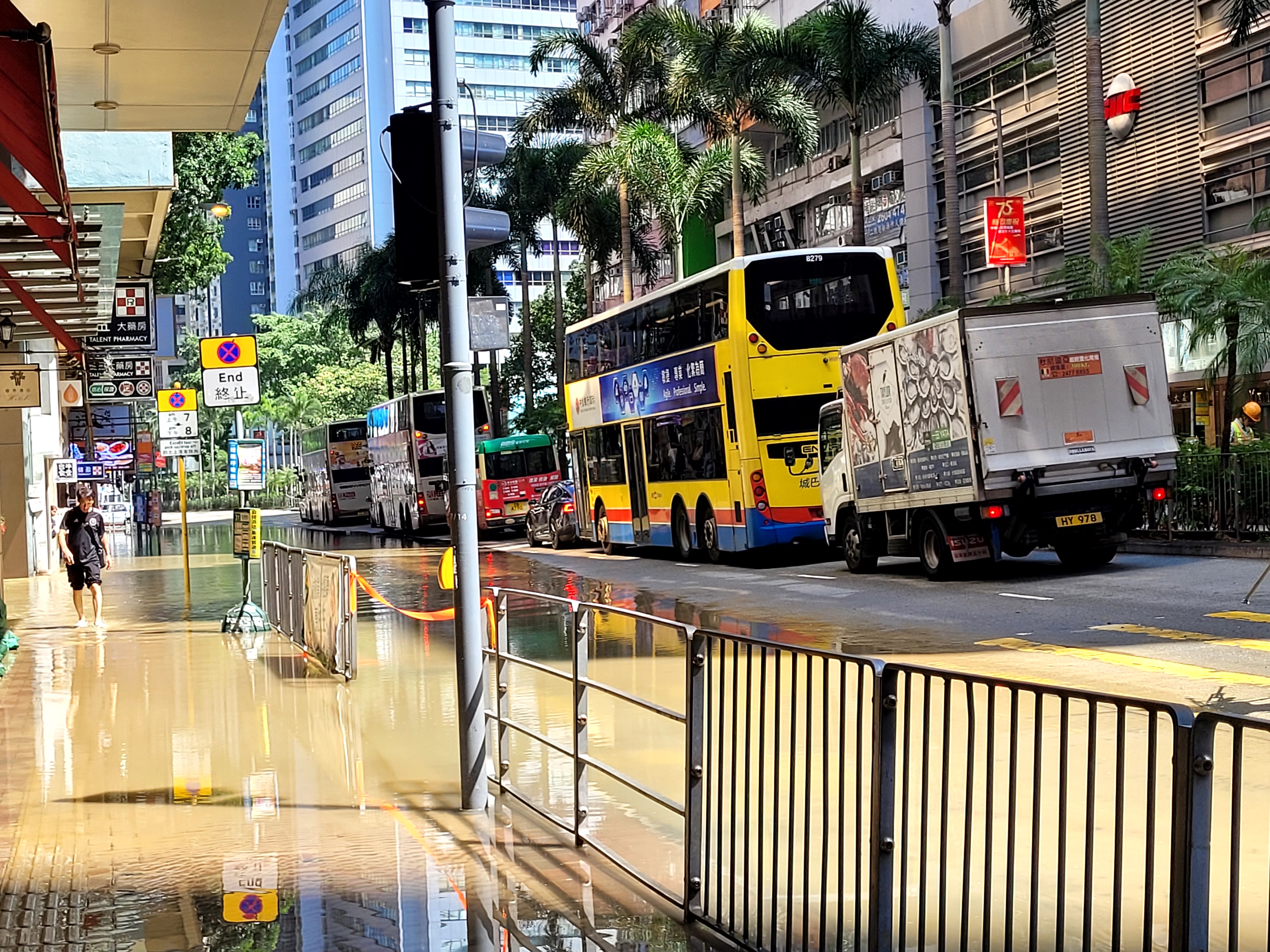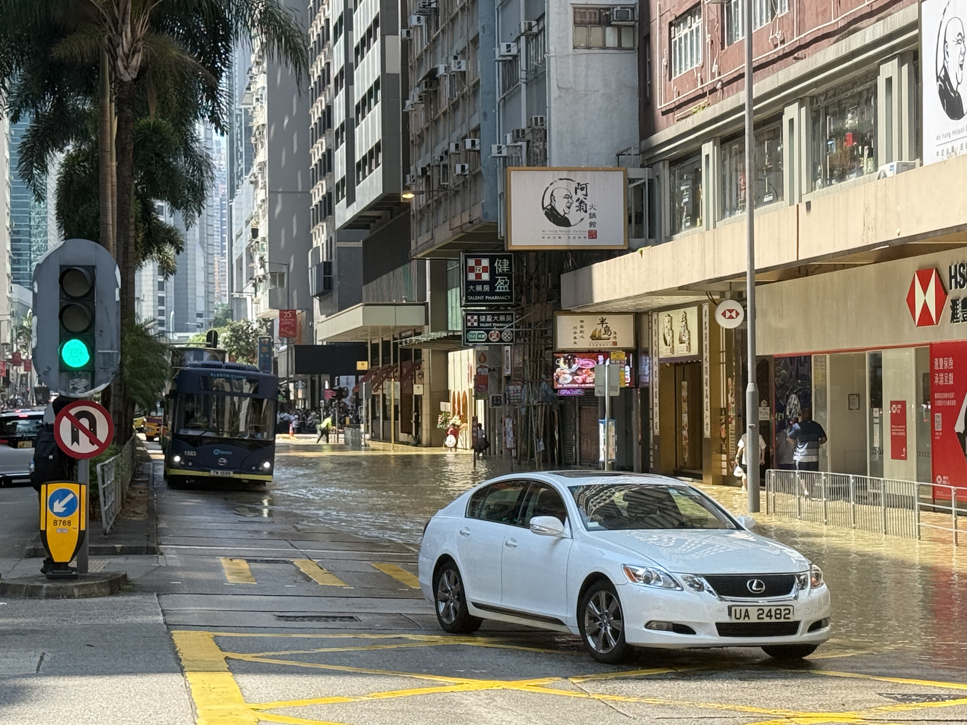 據記者現場觀察,水浸範圍目測由東亞大樓到滙豐銀行一帶,臨街的巴士站已被淹,另一側路段亦被淹浸約一半。該路段交通堵塞,有交通警察在現場進行交通疏導。