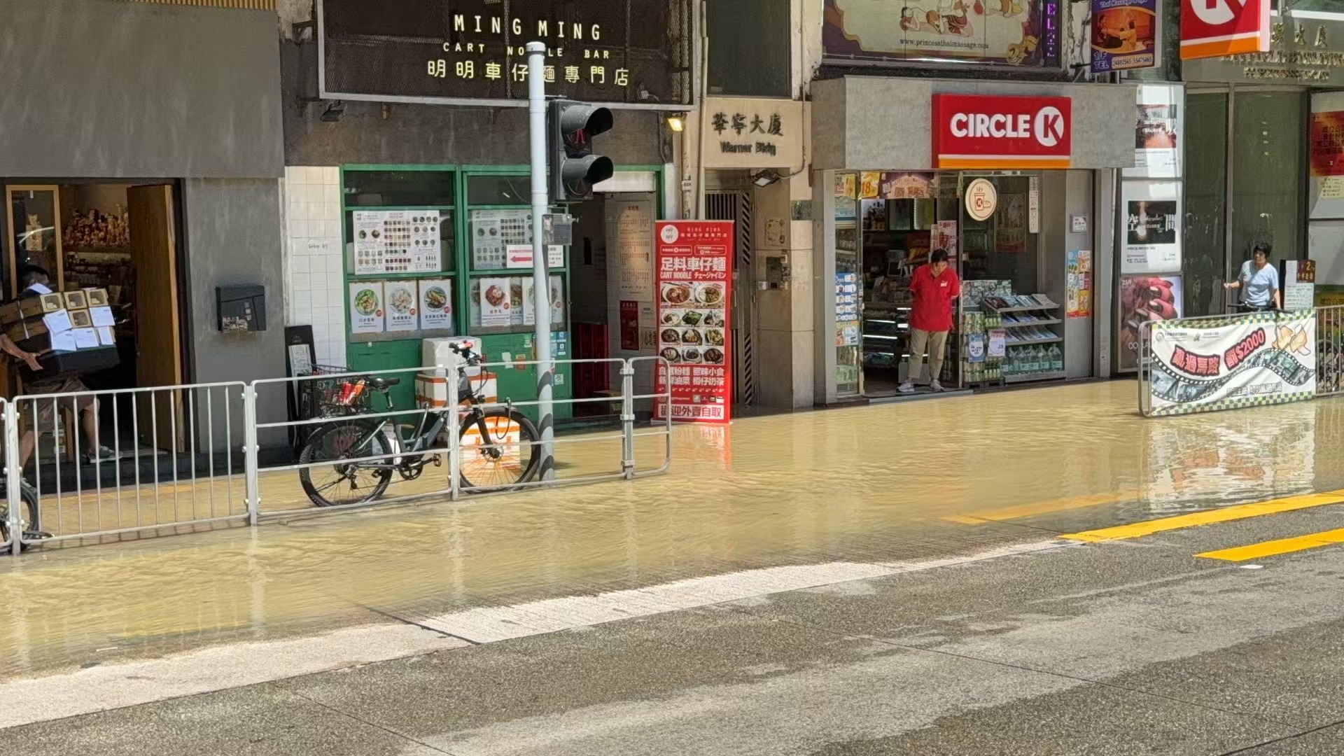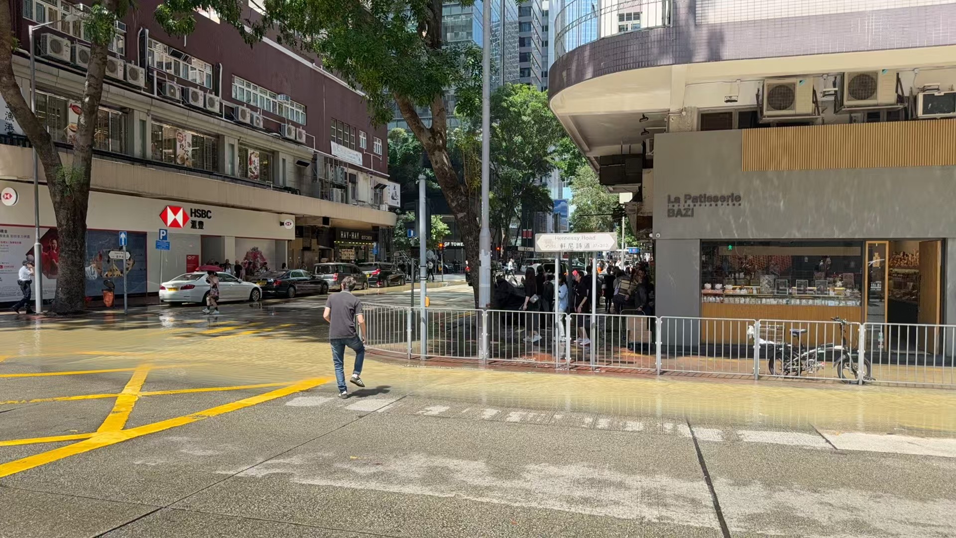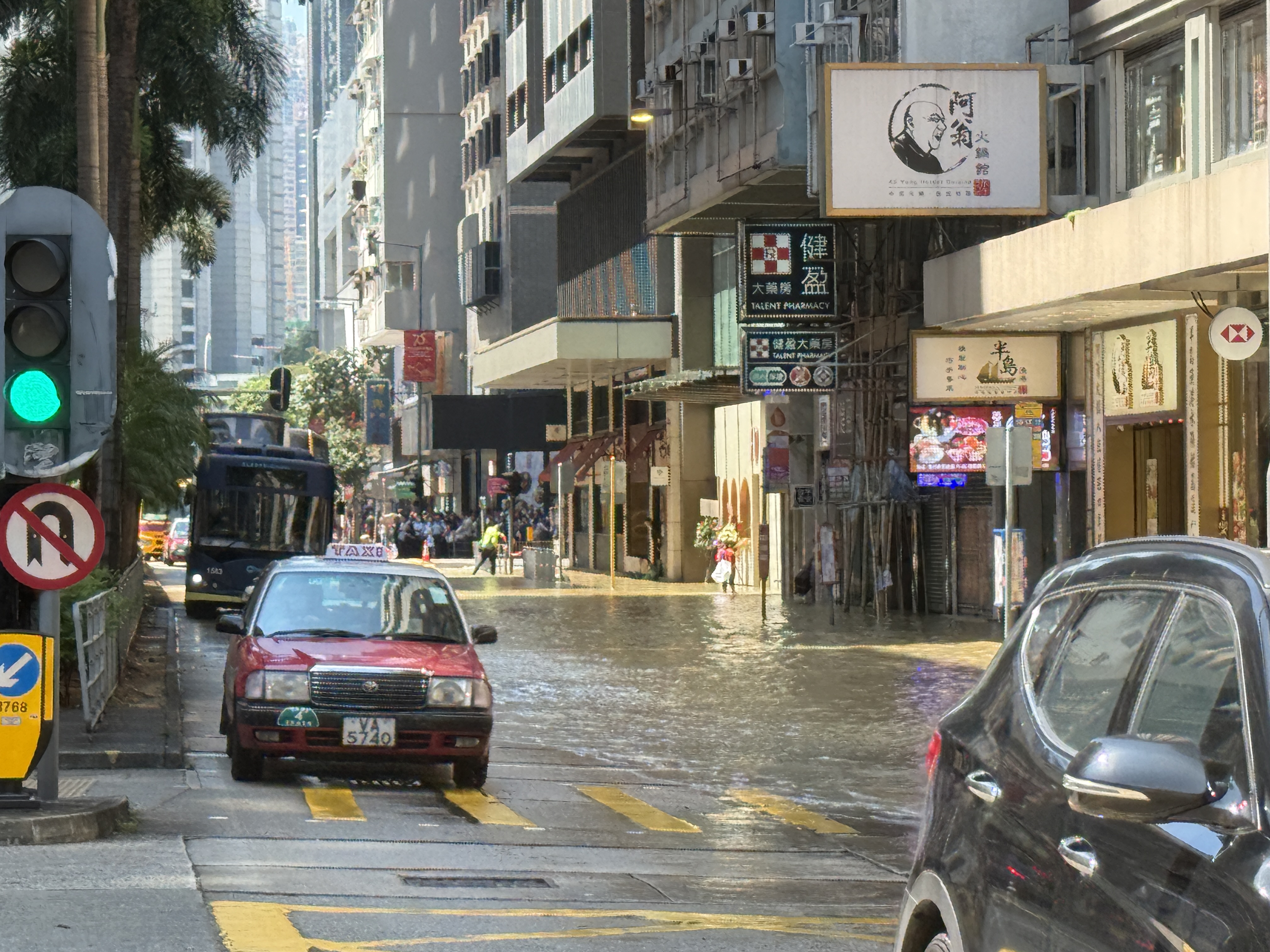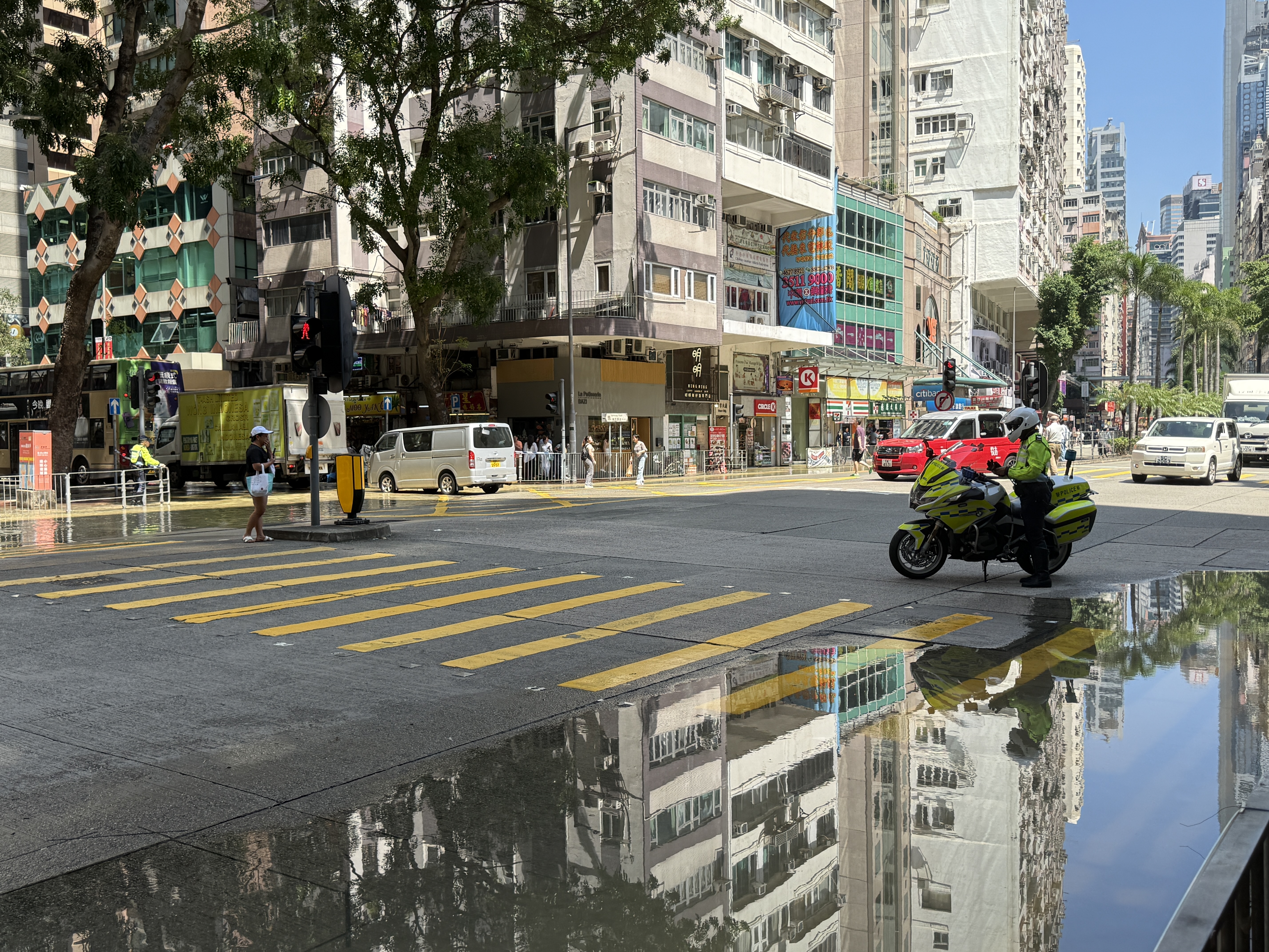 據記者現場觀察,水浸範圍目測由東亞大樓到滙豐銀行一帶,臨街的巴士站已被淹,另一側路段亦被淹浸約一半。該路段交通堵塞,有交通警察在現場進行交通疏導。