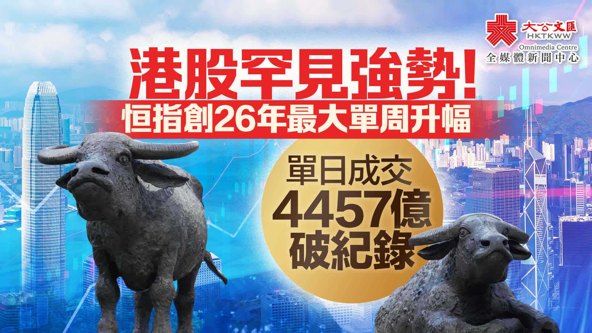 大公文匯全媒體報道,港股今日(27日)延續強勢,恒指在期指結算日收市升707點或3.55%,報20632點,成交金額4457億元創歷史新高。恒指及科指都連升4日,全星期計,恒指累計升2373點,升幅13%,創近26年最大單周升幅;科指累計升20%,兩者都連升兩星周。