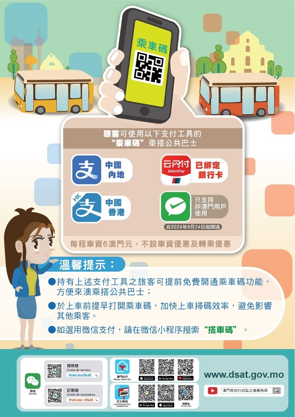 境內遊客在澳門乘坐巴士時,只需在微信搜索「搭車碼」小程序,並切換地區至澳門;或在內地「乘車碼」小程序中進行同樣的地區切換,即可掃碼乘車。使用「搭車碼」乘坐澳門所有巴士線路,車費統一為每位乘客6澳門元,微信支付時將按照實時匯率轉換為人民幣結算。