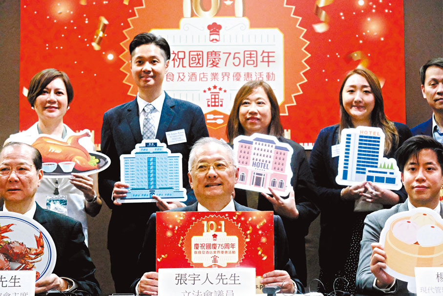 張宇人昨日聯同參與計劃的飲食、酒店業界等代表舉行記者會,宣布飲食及酒店業界慶祝國慶75周年優惠活動。他表示,今次是跨界別參與,現時已經有3,661間餐廳和店舖登記參與,除了餐飲業、酒店業界外,市民囤貨必到的超市和便利店亦會參加,包括7-11、OK兩間便利店,以及惠康、百佳、city'super三間超市,提供不同折扣優惠,例如有便利店指定飲品買一送一、麵食乾糧折扣。