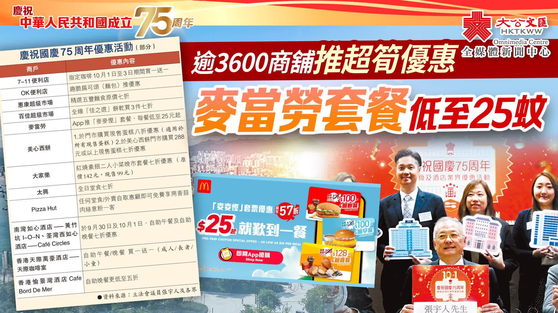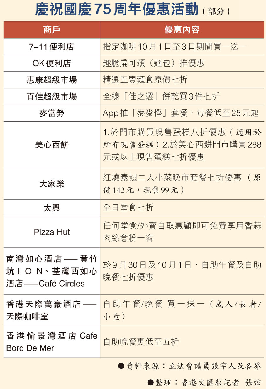 (香港文匯報 記者 張弦)香港全城歡騰迎接國慶75周年。香港餐飲業界的國慶優惠計劃加碼推出,下周二(10月1日) 有超過3,600間商舖提供優惠,較去年激增逾一倍,且商舖類別擴大,除了食肆、酒店等,今年更加入超級市場及便利店,折扣力度達七折,甚至買一送一,例如太興、靠得住等餐廳提供全日堂食七折優惠;有酒店餐廳亦推出七折優惠的套餐;便利店和超級市場出售的個別飲品、麵包、餅乾等獲折扣優惠。牽頭的香港特區立法會飲食界議員張宇人表示,該活動的目的從來不是催谷生意,而是與市民歡度國家生日,但過往經驗顯示參與商戶生意有所增長。