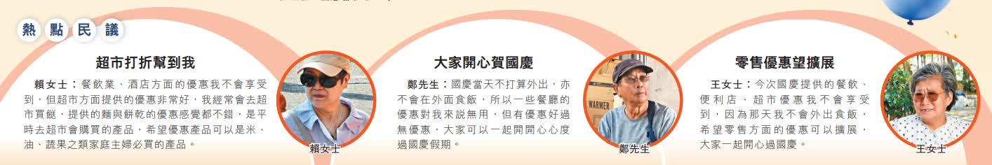 他強調,該活動的目的從來不是催谷生意,而是希望令到香港市民和來港遊覽的旅客感到開心,去到不同食肆、商店都發現有折扣優惠,「希望市民及旅客外出用膳,或在便利店買飲料時發現有優惠而開心。」由始至終,該計劃都並非為提升生意,「無論回歸或國慶都是慶祝,亦都做些本分。我從來都不認為要看生意額,但看到一直參與的食肆有增無減,有做的亦繼續再做。」