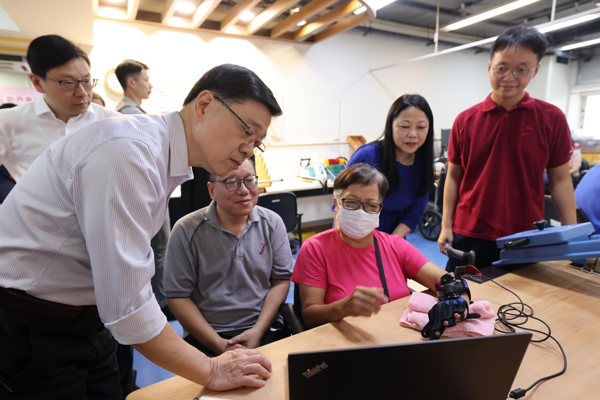 之後,李家超到日間社區康復中心視察,了解支援殘疾人士和照顧者的服務。這間中心每年提供近15,000人次的康復訓練及1,100人次的嚴重殘疾人士日間照顧服務;亦會為照顧者提供訓練活動及教育課程,強化他們的照顧能力及紓緩壓力。他在中心內與數位殘疾人士和他們的家人聊天,聆聽他們對這類支援服務的想法。