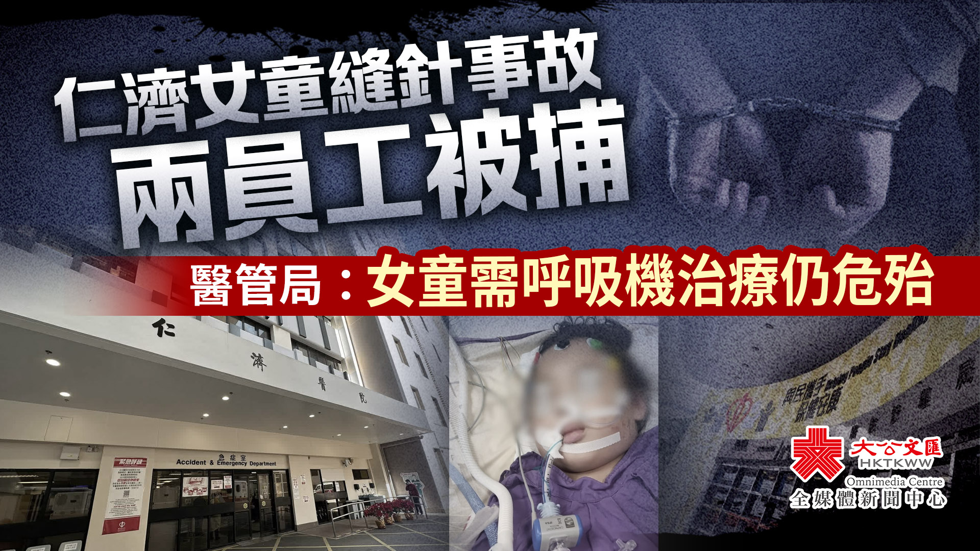大公文匯全媒體報道,近年本港公立醫院發生多宗醫療事故。今年5月,仁濟醫院一名5歲女童縫合頭部傷口後心臟驟停18分鐘,沒有意識及脈搏,經臨床診斷為缺血性腦病變,女童出現腦水腫並陷入昏迷,至今在瑪嘉烈醫院兒科深切治療部留醫。女童父親同月報案,警方經調查後拘捕兩名女子涉嫌「對所看管的兒童或少年人虐待或忽略」,消息指二人為涉案護士及病人服務助理。