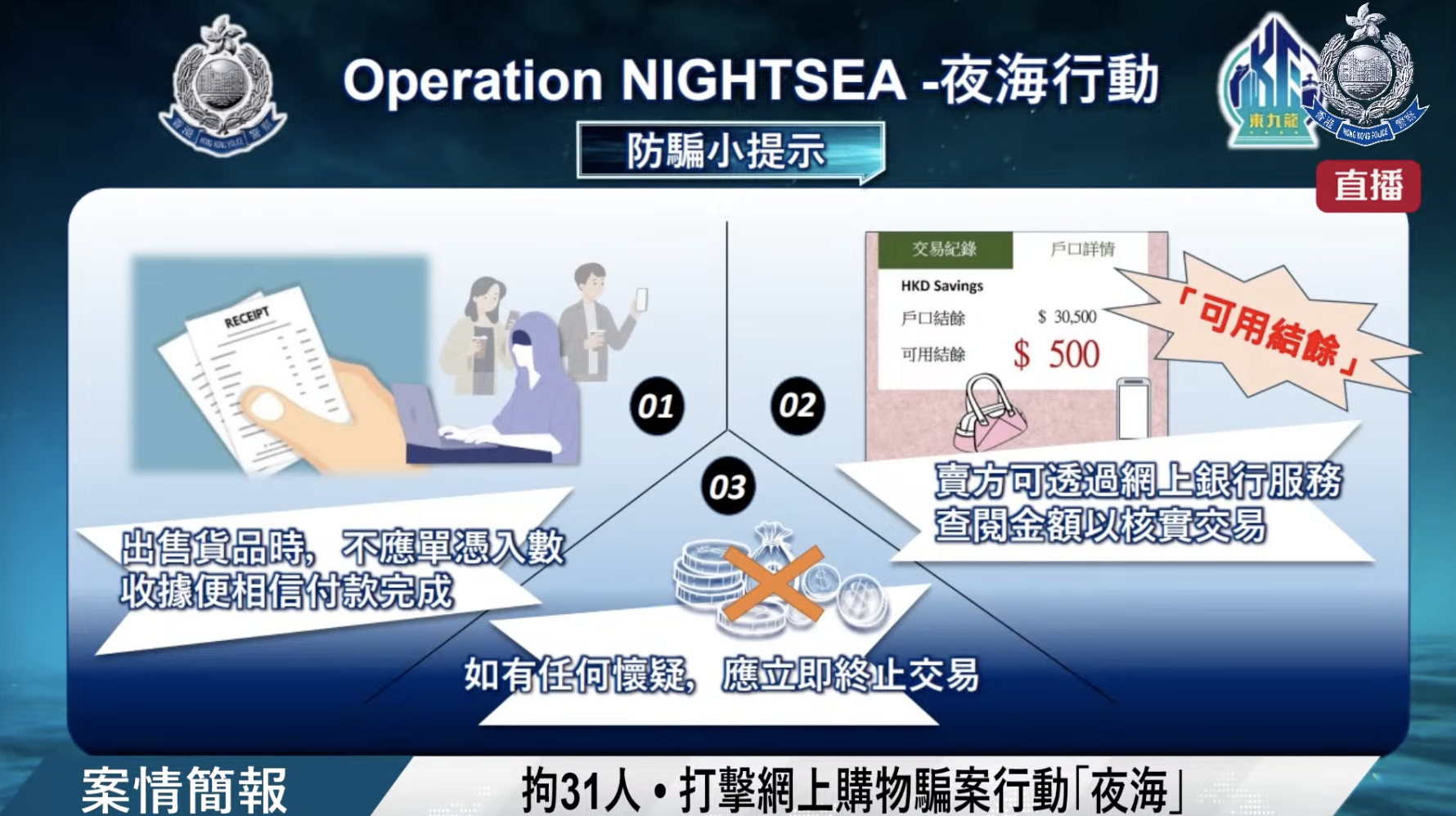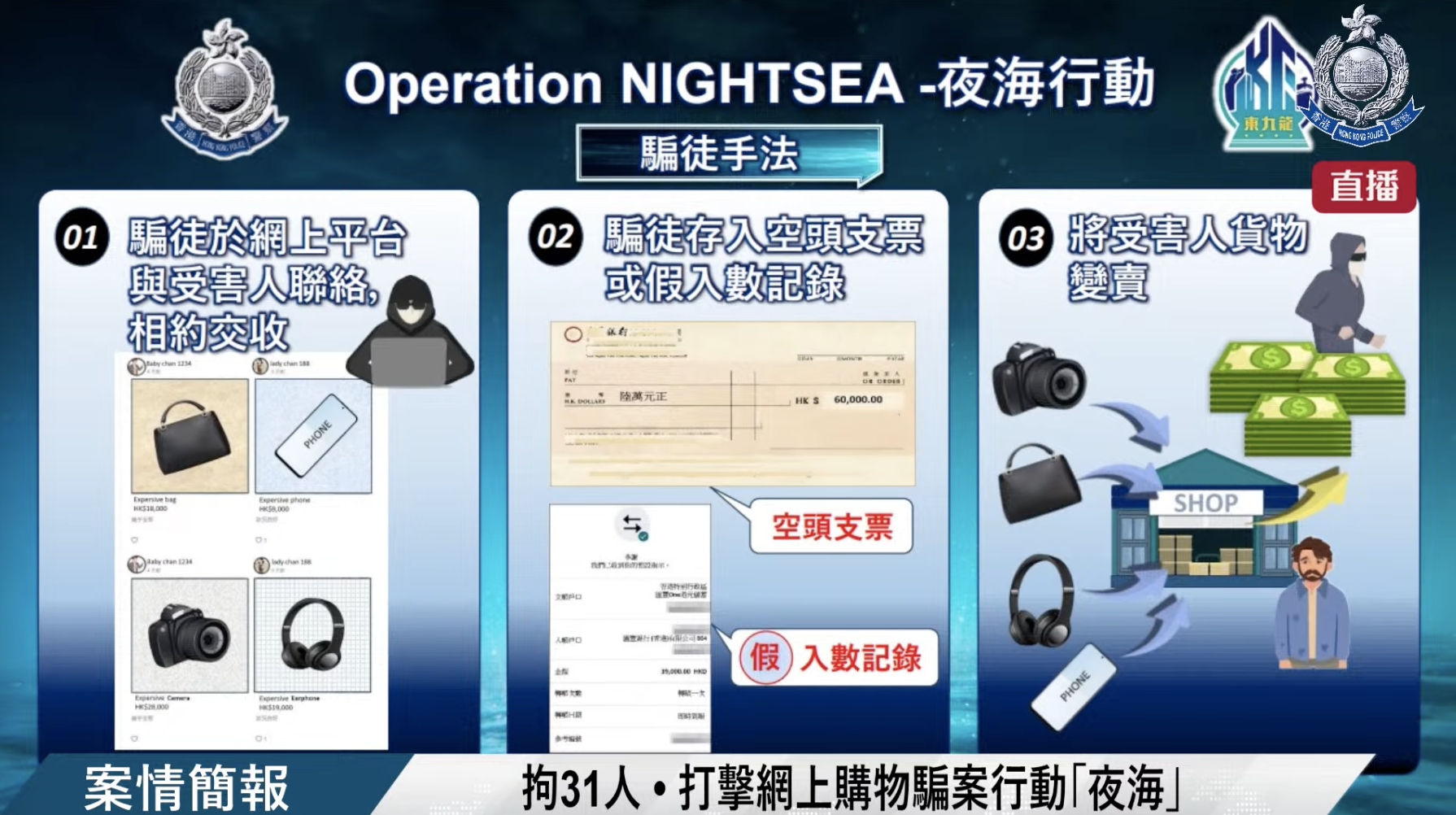 大公文匯全媒體報道,警方於9月24至28日展開行動「夜海」(NIGHTSEA)打擊網上購物騙案,以「洗黑錢」、「串謀詐騙」、「處理贓物」及「以欺騙手段取得財產」等罪拘捕18男13女,年齡介乎16至72歲,共偵破45宗騙案,涉及騙款超過100萬元。警方今日(28日)對案情作簡報。