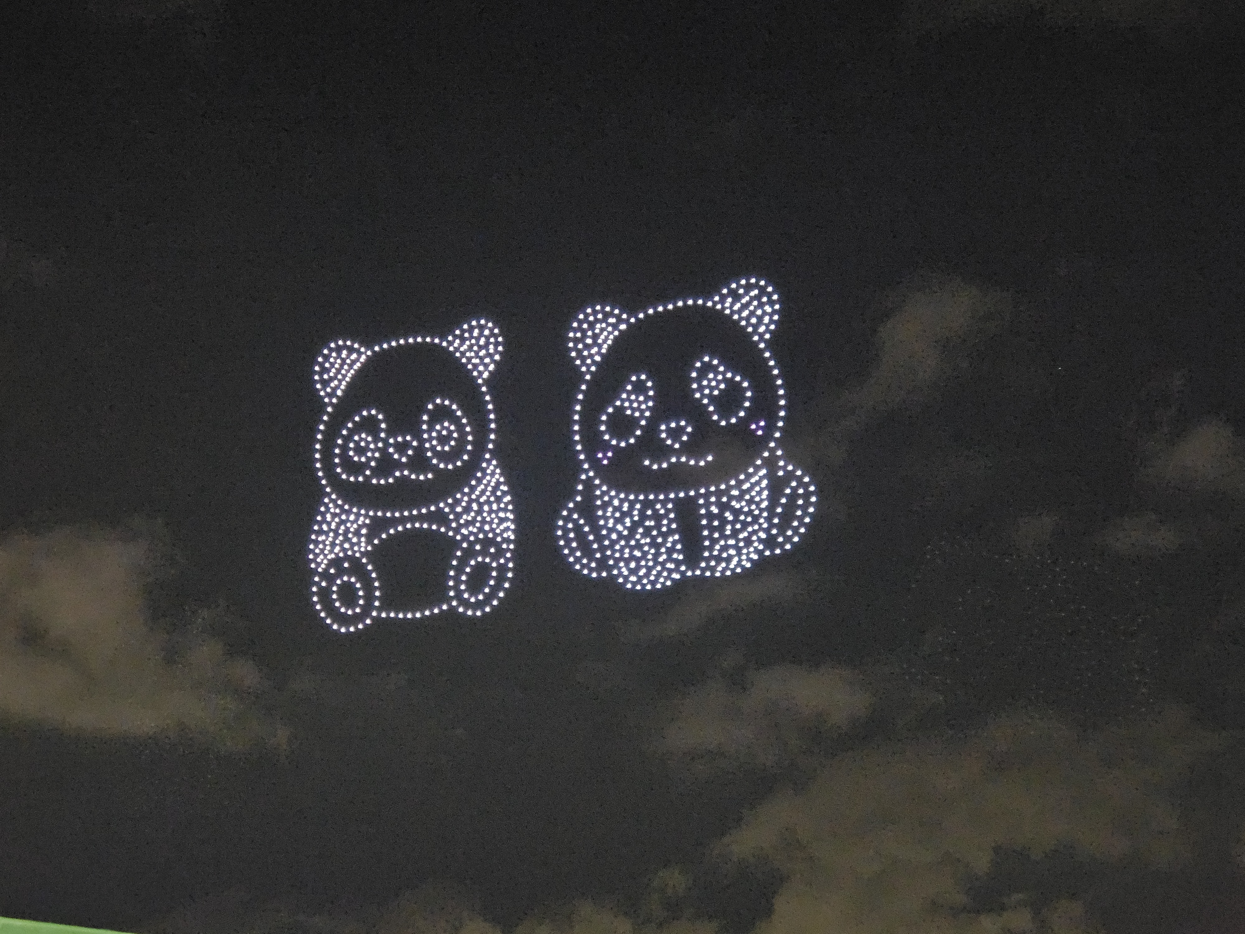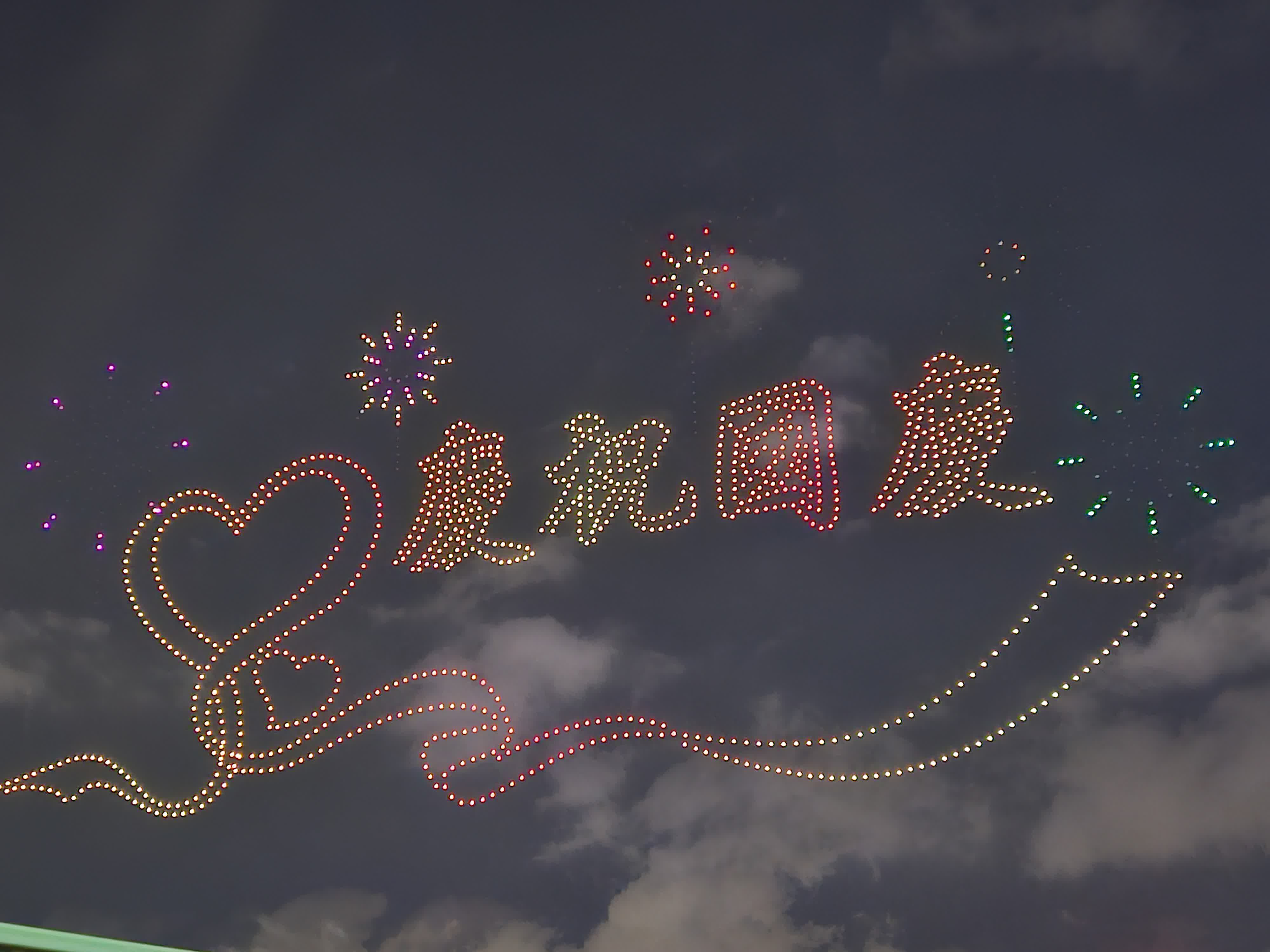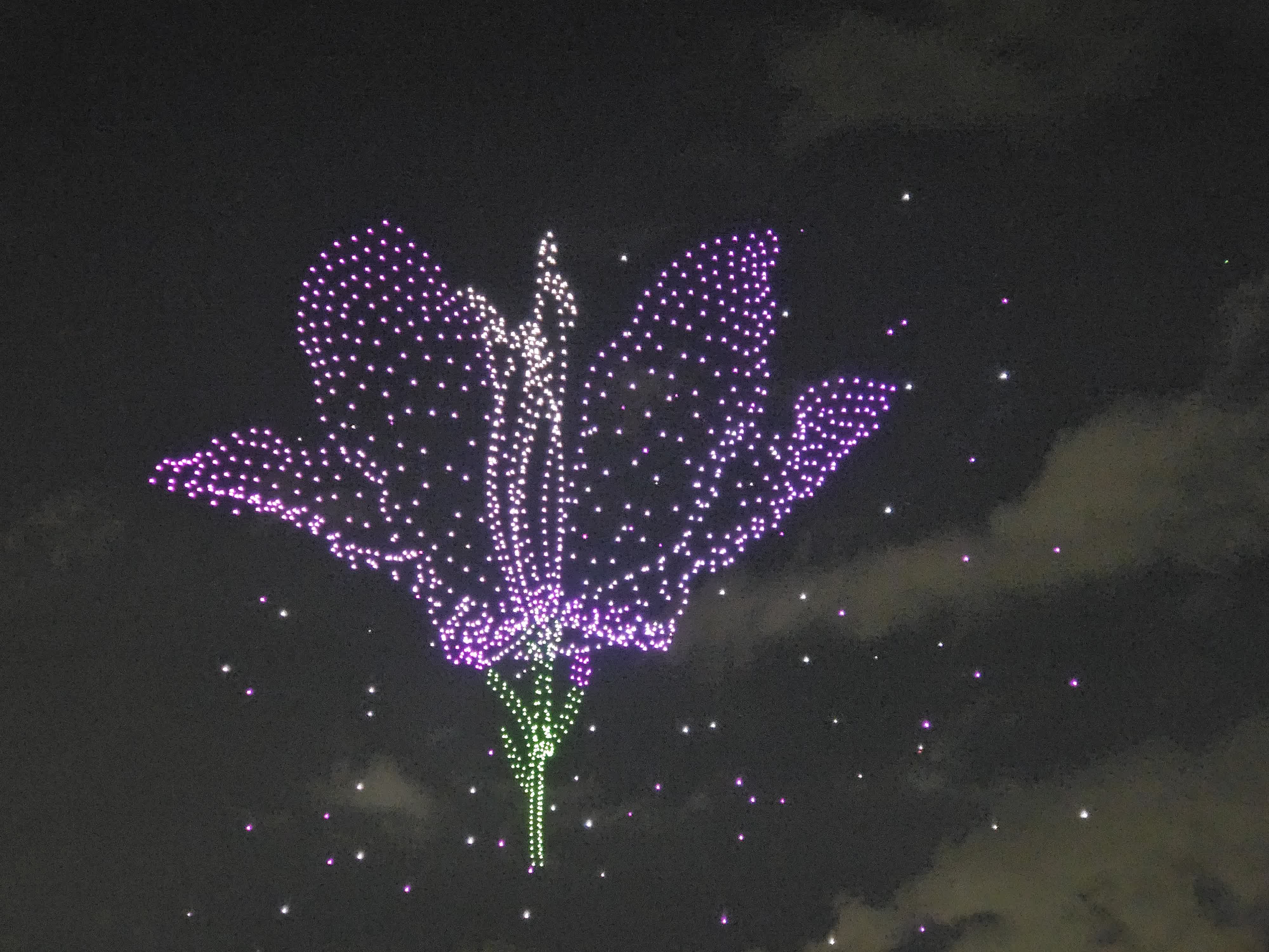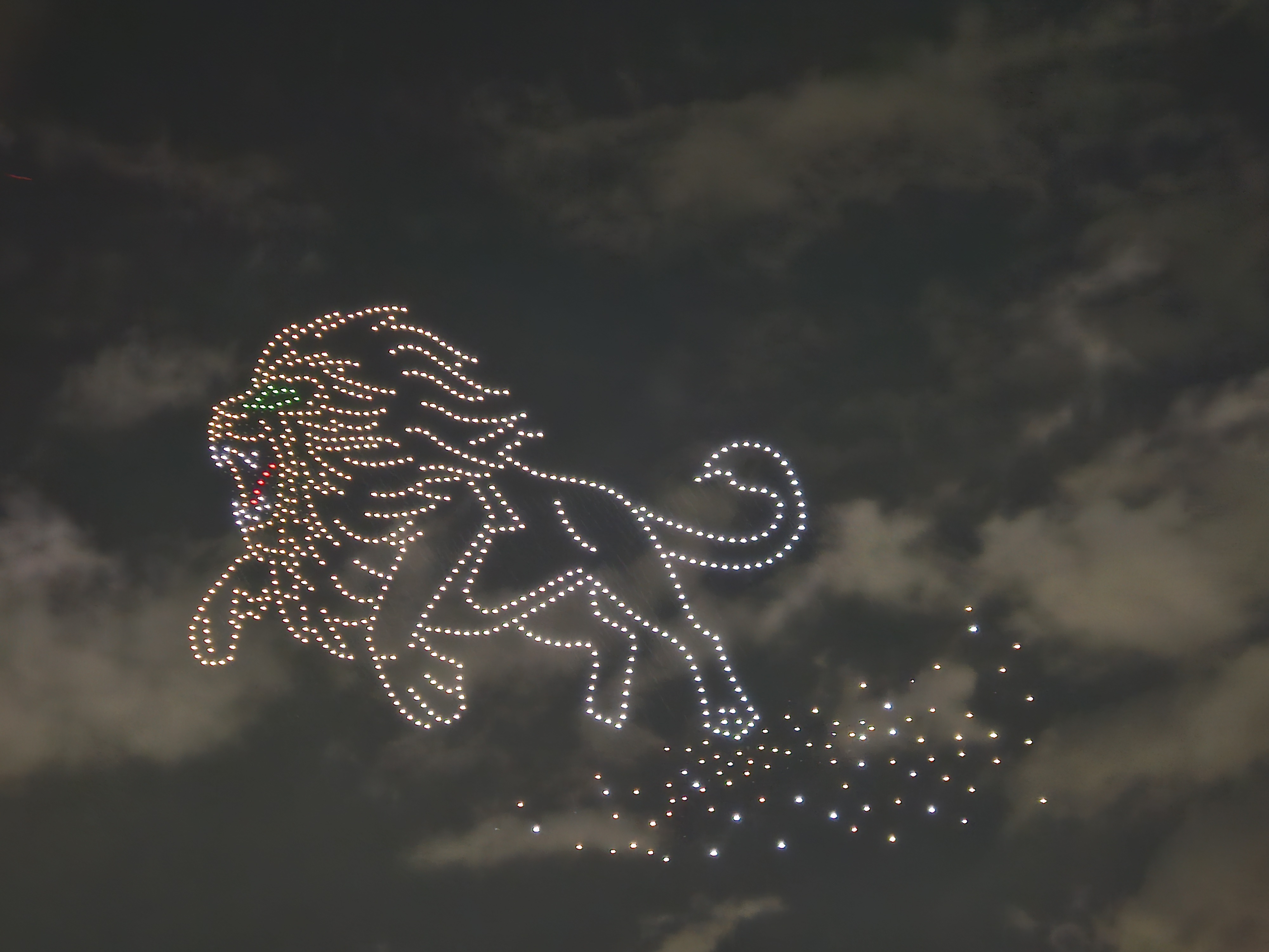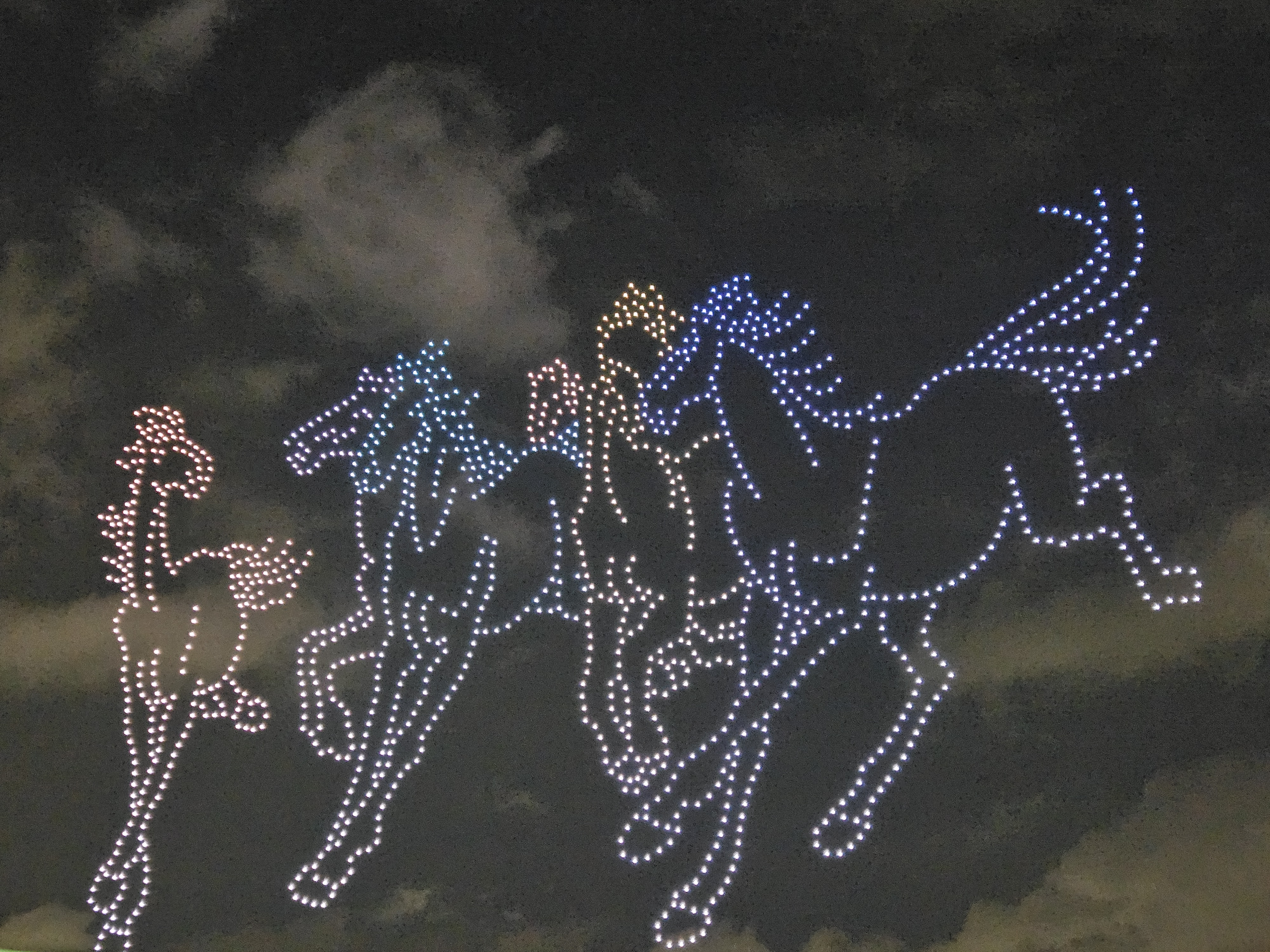 無人機表演以「香港馬騰盛世」為主題,以1500架無人機呈現多個香港本地特色場景,例如天星小輪、九龍城寨及電車等;並演繹國畫大師徐悲鴻的4幅著名畫作 《新生命活躍起來》、《天馬行空》、《群奔》及《紫荊花》,展現香港的「獅子山精神」,以及傳遞對香港繁榮穩定、美麗和諧的祝願。亦會拼湊出大熊貓「盈盈」、「樂樂」及一對龍鳳胎的圖案。