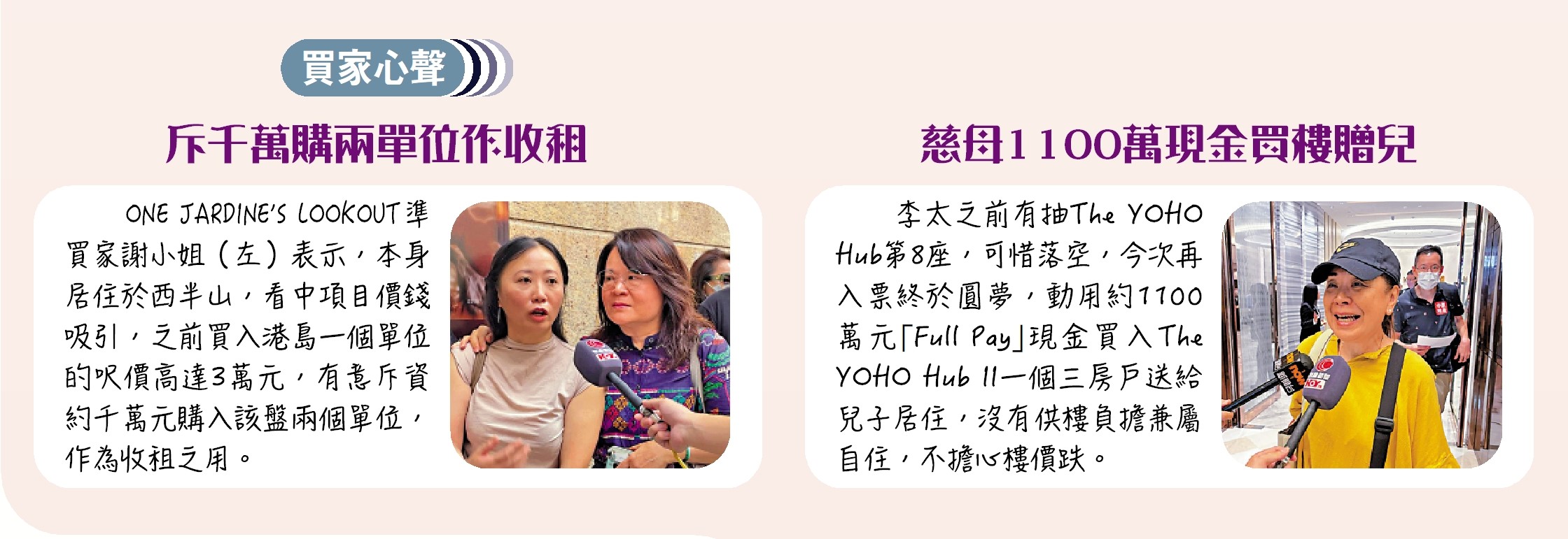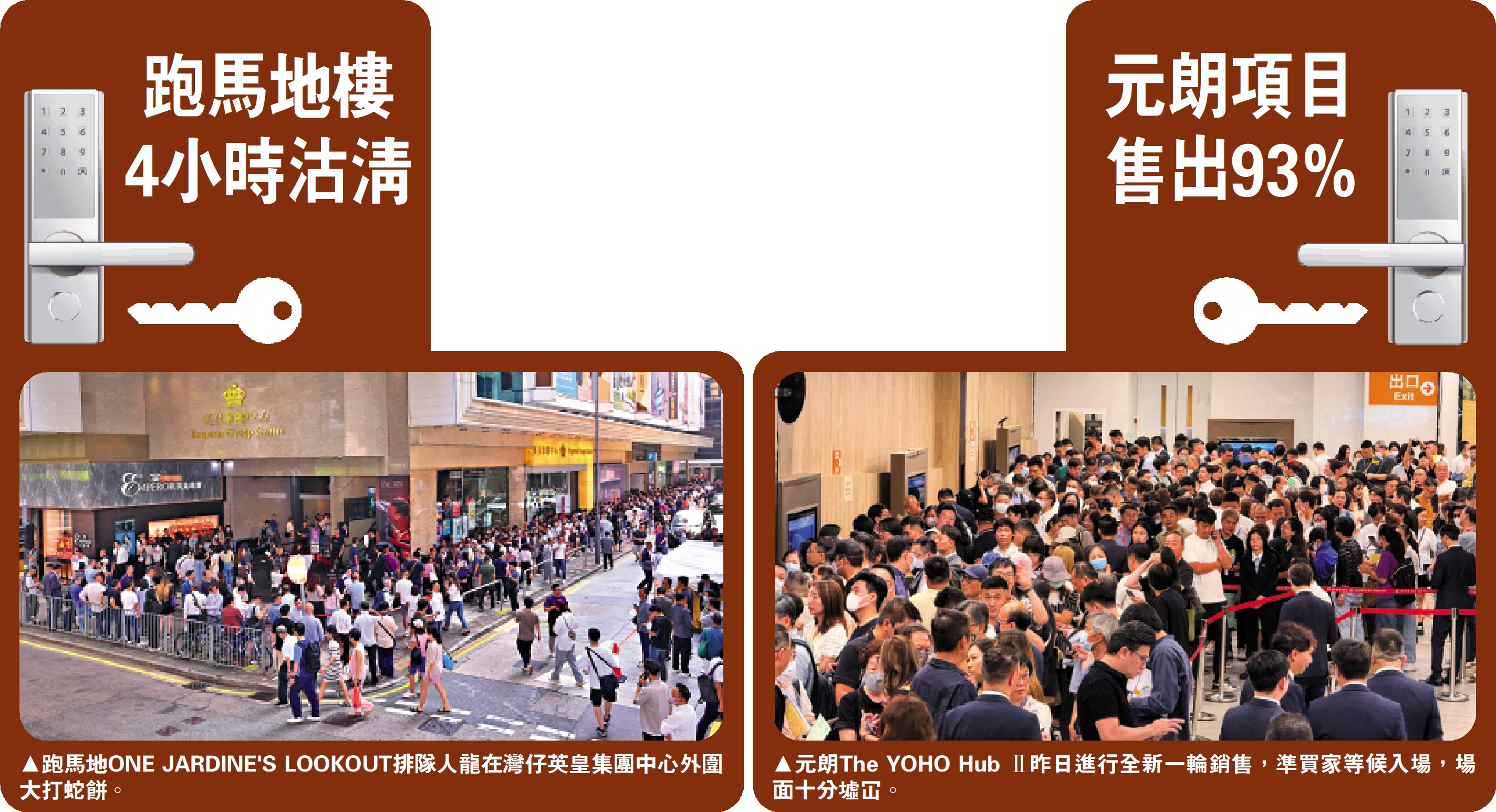 (大公報 記者 梁穎賢)本港銀行減息及中央連環推出利好經濟政策帶旺股市,本港樓市亦起舞,昨日兩個新盤同收旺場。英皇國際(00163)跑馬地ONE JARDINE'S LOOKOUT挾同區13年最平新盤出擊,推售的85伙四句鐘閃電搶清,研加推尚餘單位應市;另外,新地(00016)元朗The YOHO Hub Ⅱ開賣全新第6座120伙,全日沽112伙或93%。綜合市場消息,在兩新盤力撐下,昨日一手市場共賣近220伙,料是近兩個月最旺的周末。