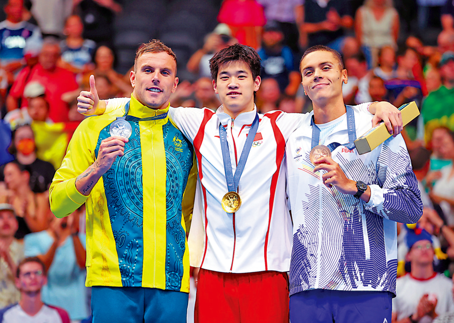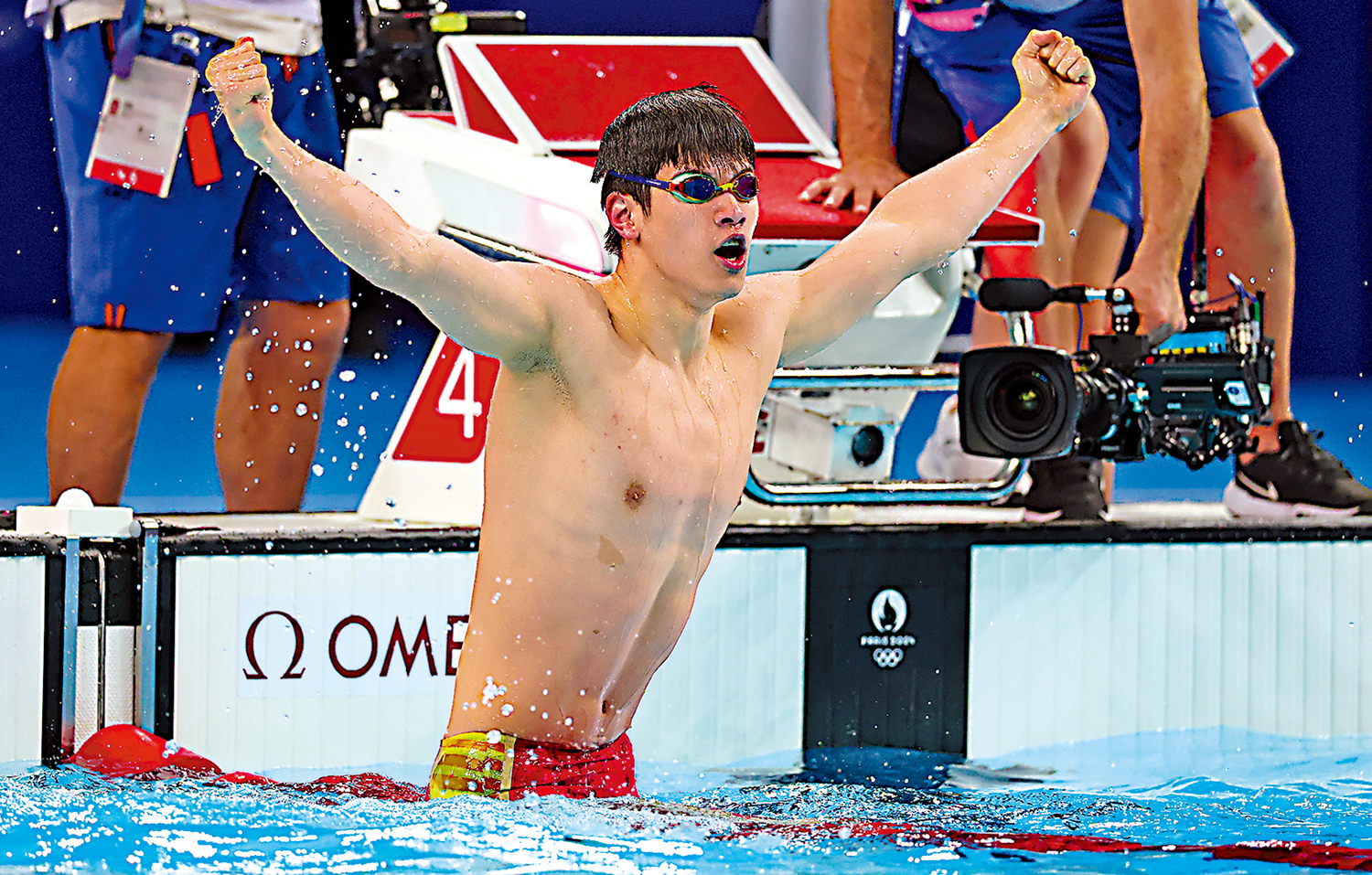 「之前看孫佳俊被他們拉開的時候,還是挺慌的。後面想想不管別人游得多快,我只要把自己這一棒做好了就行。」湛藍的水裏萬籟俱寂,最後反超時,潘展樂左邊換氣,目之所及只有自己,「我啥都沒想,全憑意志力在頂,然後就順其自然地贏了。」