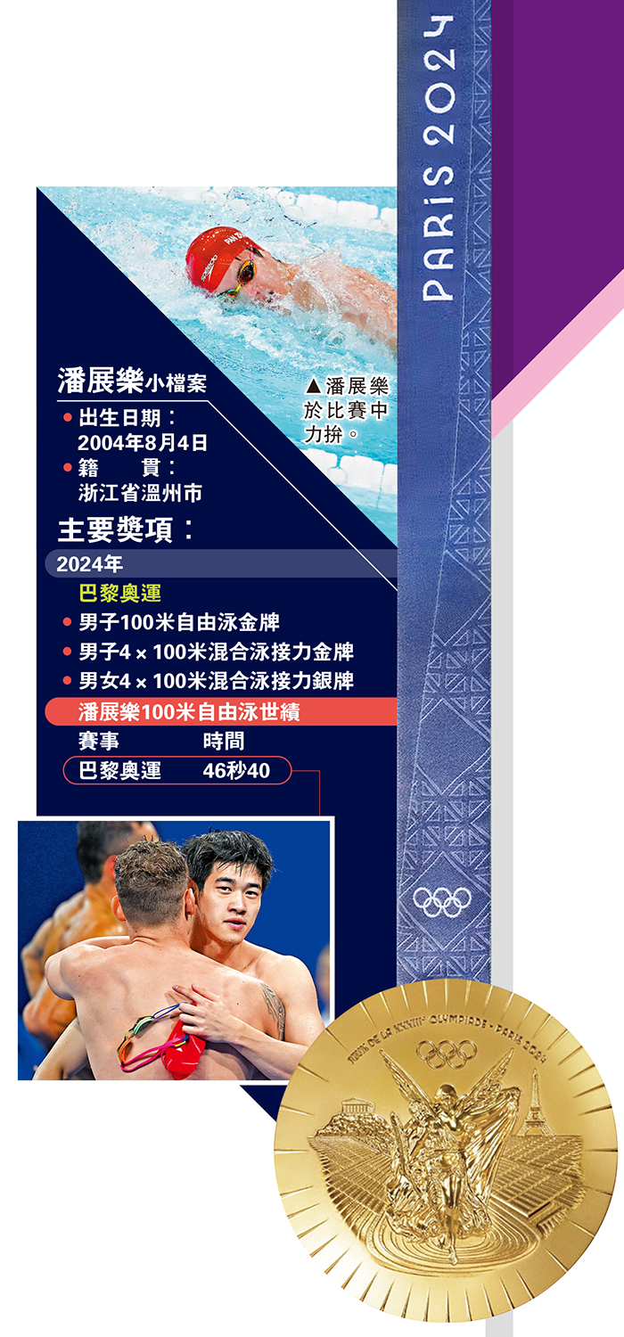 巴黎奧運男子4×100米混合泳接力決賽中,在國家隊後半程落到第3的情況下,潘展樂力挽狂瀾,最後100米游出45秒92,強勢助力全隊斬獲金牌。