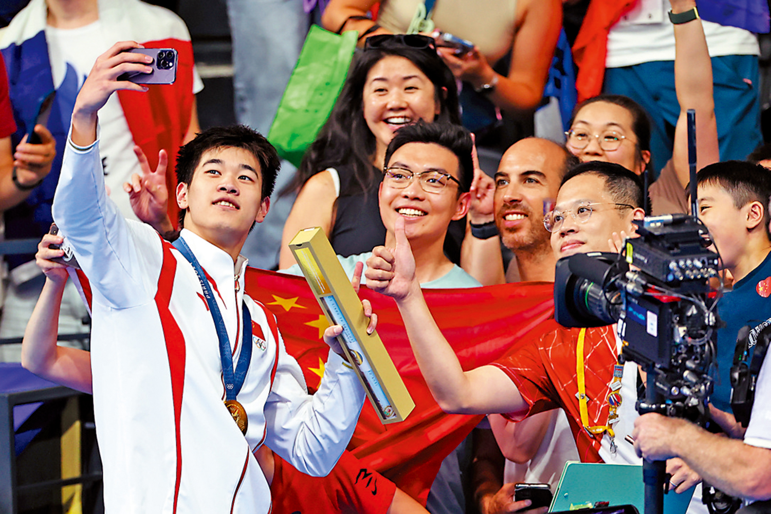 大公報綜合報道,當國家隊拿下金牌的歡呼聲響徹整個巴黎奧運會賽場時,潘展樂還泡在水裏,魚一樣起起伏伏。下一秒,他突然「使壞」,抬起雙臂用力擊向水面,水花濺了岸上的隊友一頭一身─隊友大笑,蹲下伸出手,和水裏的潘展樂來了個結結實實的擊掌。