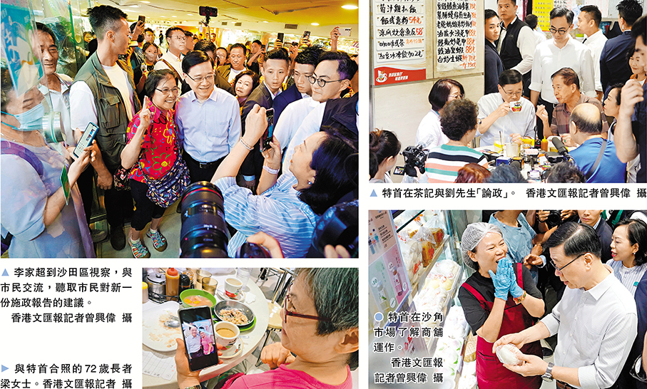 (香港文匯報記者 胡恬恬、黃子晉)香港特區行政長官李家超昨日到沙田區探訪,聽取市民對新一份施政報告的建議。他先後探訪了殘疾人士和照顧者家庭,參觀日間社區康復中心,又到沙角邨內的街市和熟食檔與商戶和市民交流。不少街坊在和李家超交談時均表示,特區政府做了很多工作,他們生活得很開心。李家超回應表示:「見市民精神奕奕,我最開心。」從與市民的交流中,他感受到市民們對香港的熱愛和對生活的期盼,他親身了解市民日常需要,「有助我們在施政報告中研究怎樣繼續提供地區服務。」