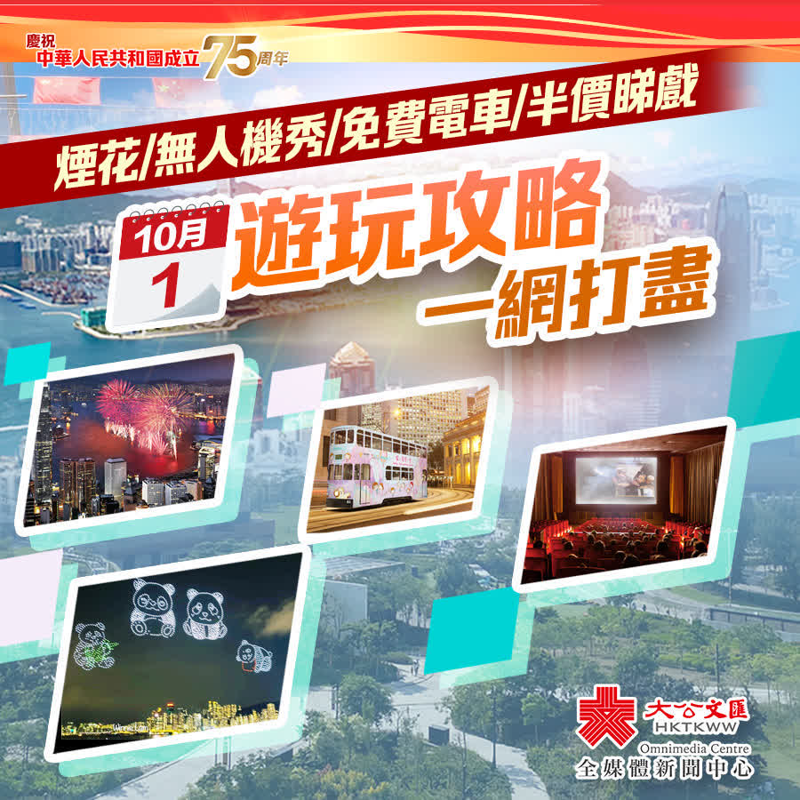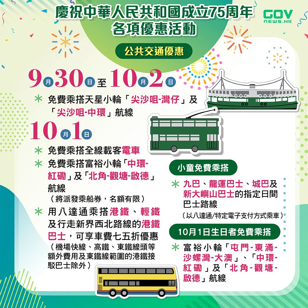(大公文匯全媒體 記者 裘真)今年是中華人民共和國成立75周年,10月1日國慶日,香港特區政府與社會各界推出一系列活動和優惠,與市民共賀國慶,涵蓋公共交通、文化藝術、消閒娛樂、飲食消費和獎賞活動等方面。10月1日國慶當晚維港上空將再次上演國慶煙花匯演,更新增無人機表演;9月30日至10月2日,天星小輪一連三日免費乘搭;10月1日電車免費,港鐵車費七五折、康文署博物館展覽免費開放、半價睇電影等國慶優惠活動更是數不勝數。十一假期如何免費玩轉香港?當天香港都有哪些吃喝玩樂等優惠活動?快來一網打盡!