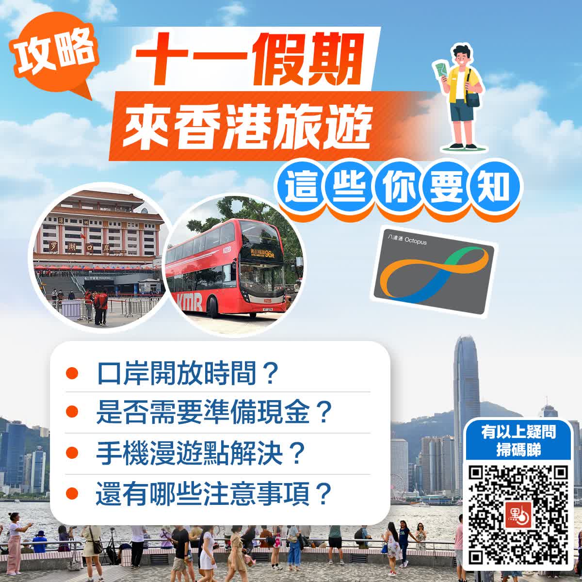 十一來香港旅遊,尤其是首次來港旅遊,有哪些注意事項呢?首先要注意各口岸的通關時間。目前香港與內地只有皇崗口岸與港珠澳大橋口岸是24小時通宵運作,但兩口岸都沒有鐵路接駁,要靠跨境巴士疏導人潮。有鐵路接駁的羅湖口岸,運作到凌晨零點;福田口岸則是運作到晚上10點半。