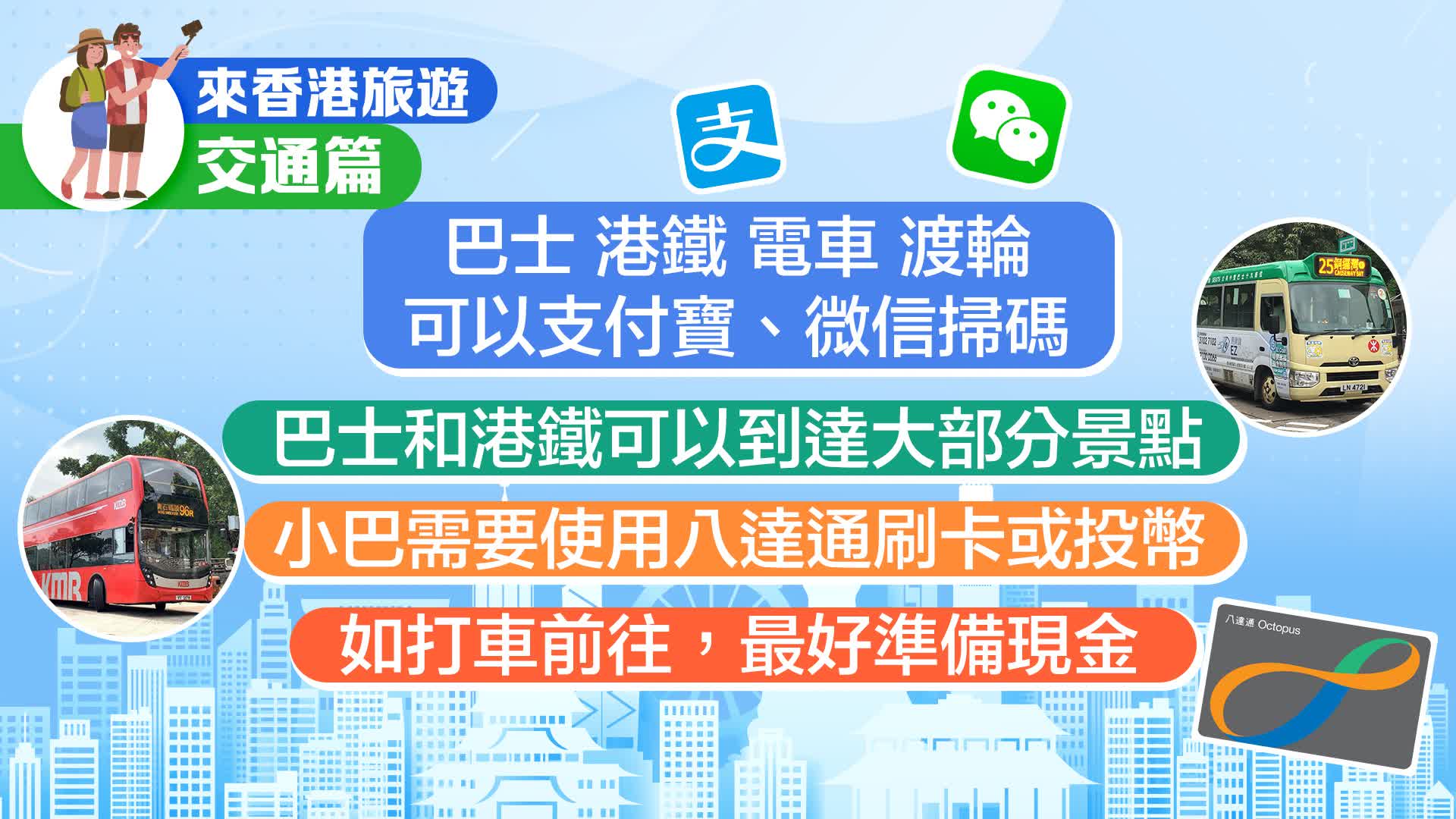 交通方面,香港的巴士、港鐵、電車、渡輪都可以使用支付寶、微信掃碼支付,同時巴士和港鐵可以到達大部分景點。如要乘坐小巴,需要使用八達通刷卡或使用零錢投幣,不設找贖。如打車前往目的地,最好準備現金,來港遊客可以提前準備一些港幣現金。