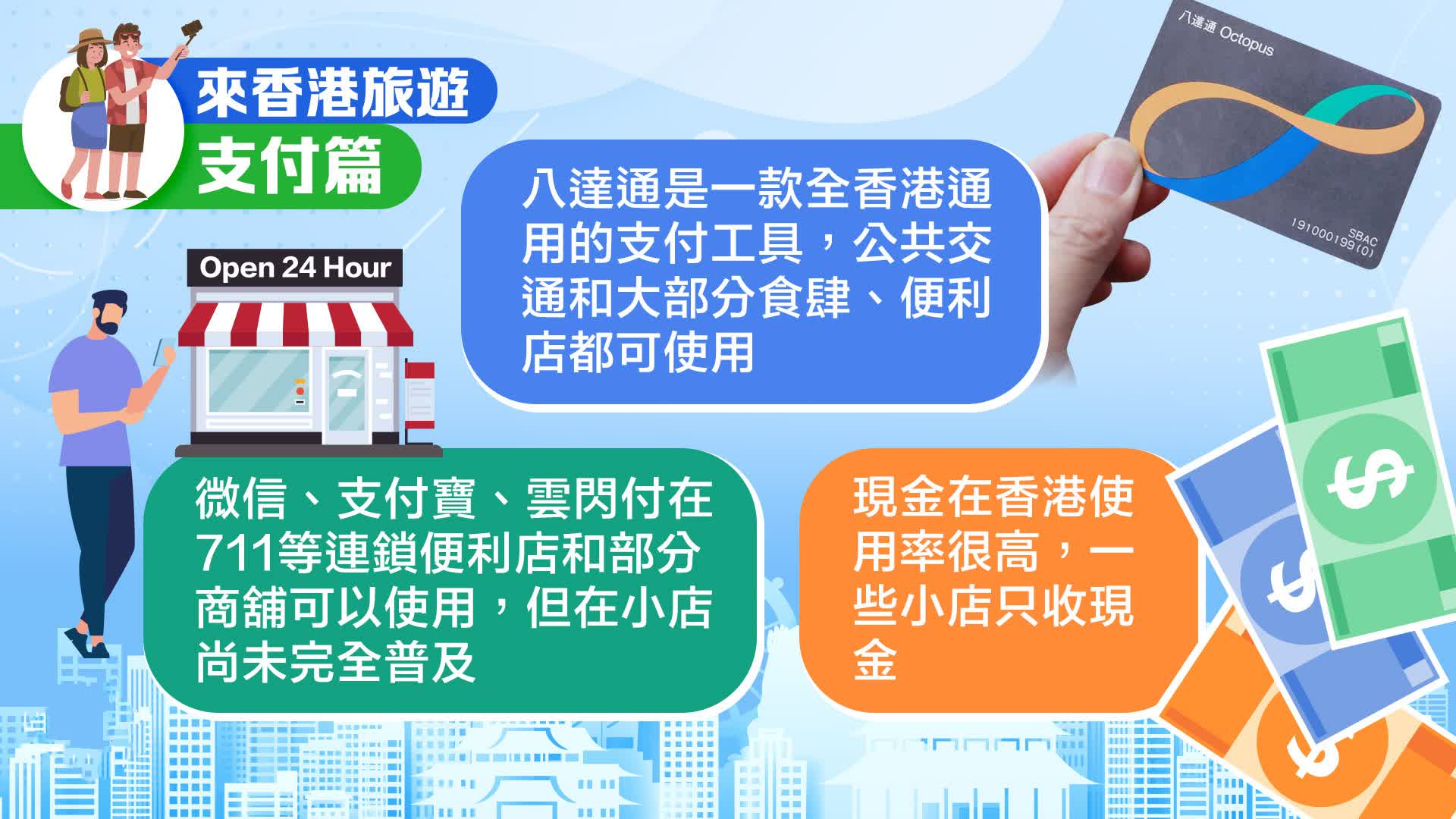支付方面,八達通是一款全香港通用的支付工具,公共交通和大部分食肆、便利店都可使用。同時,微信、支付寶、雲閃付在711等連鎖便利店和部分商舖也可以使用,但在小店尚未完全普及。除了八達通,在香港使用率很高的還有現金,一些小店只收現金,來港旅遊前可以準備一些港幣現金。