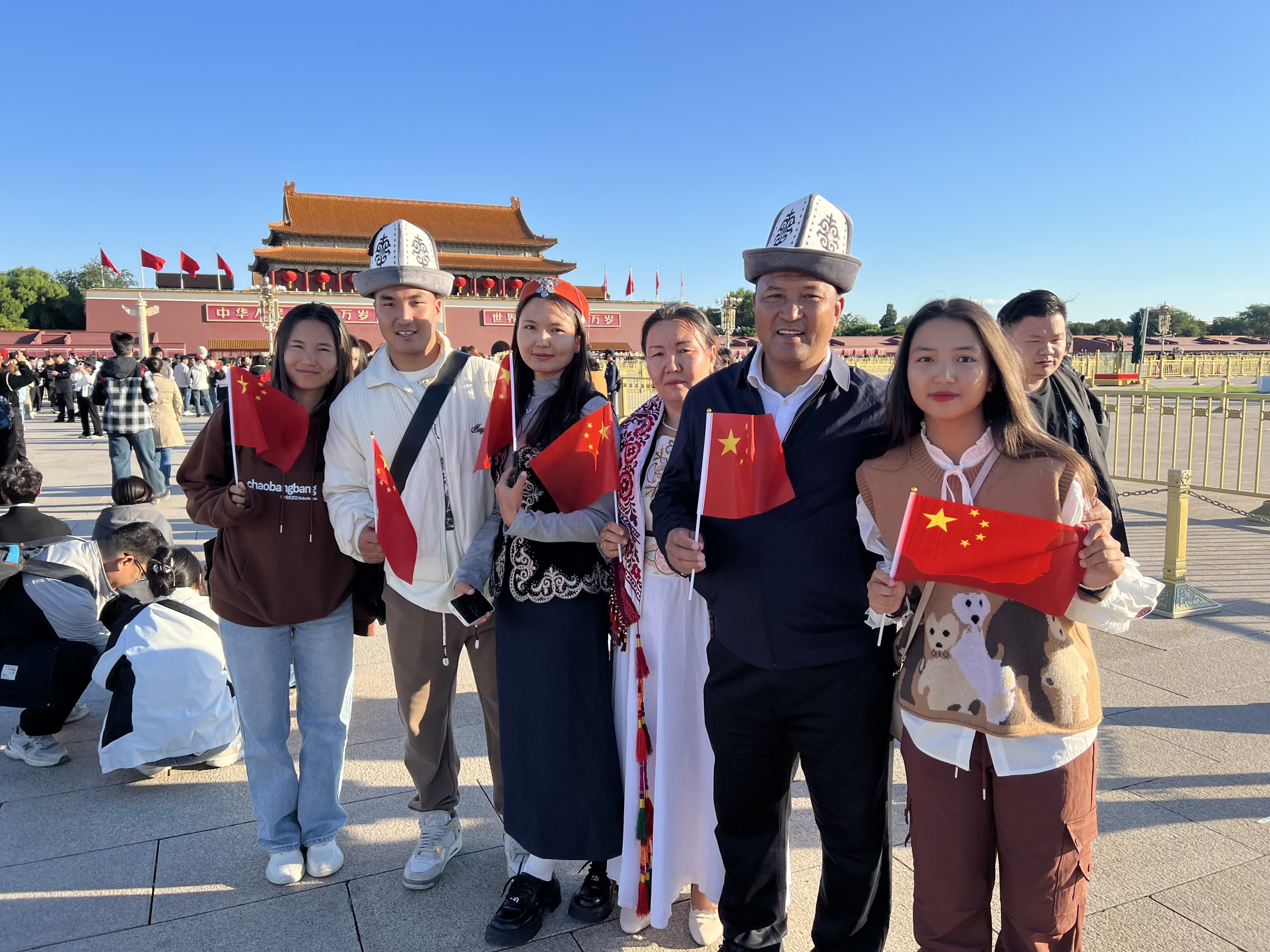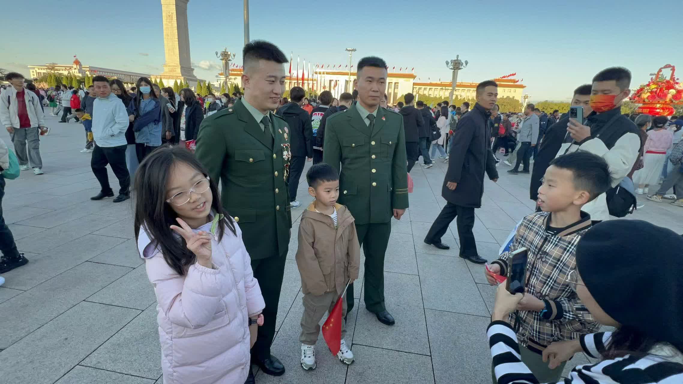 「爺爺心中的夢想就是我們四代人整整齊齊一塊兒來北京看升旗,他第一次來北京看升旗還是50多年前,今天送算圓了他的心愿,老人家很開心。」來自浙江的溫氏家族,祖孫四代共七口人在天安門廣場大花籃前合影留念,87歲的爺爺與80歲的奶奶,臉上洋溢着孩童般的喜悅。與今日圓夢相比,那份等待與期盼似乎都化作了無盡的甜蜜與滿足,即便熬夜未眠,心中那份對祖國的熱愛卻讓他精神矍鑠,毫無倦意。