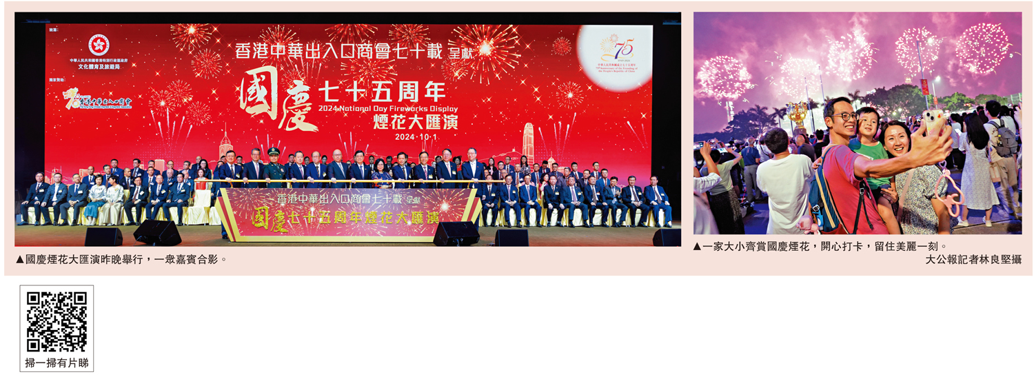 (大公報 記者 王亞毛、劉碩源、林良堅、鄧浩朗)絢麗的國慶煙花於昨晚在維多利亞港上空綻放,將熱烈的節慶氣氛推至最高潮,33萬名市民及遊客在維港兩岸欣賞,人潮提前幾小時到達尖沙咀海旁,期待佔到欣賞煙花最佳視角的好位置。晚上全程約20分鐘的煙花不斷變換出「紅色五角星」、「笑臉」及「竹葉」等圖案,現場人群發出陣陣歡呼,大家舉起手機,共同記錄下煙花的精彩時刻。