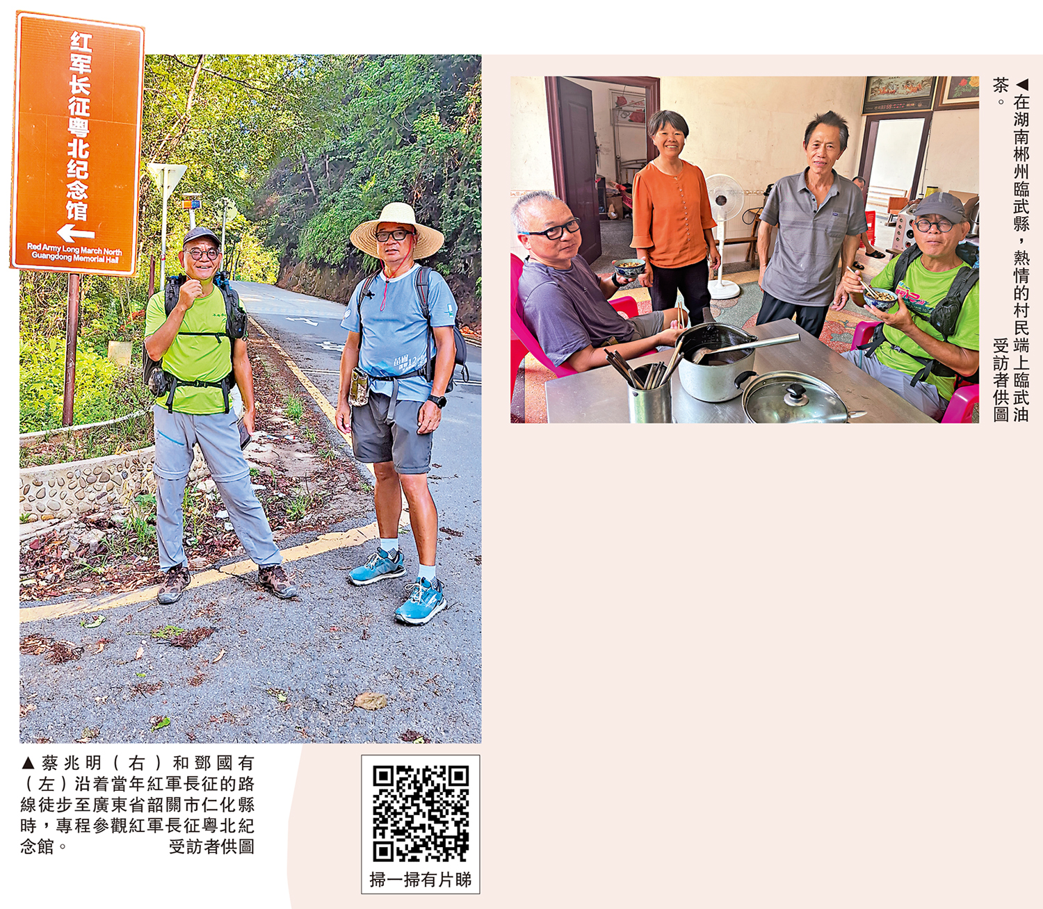 (大公報 記者 李暢、蘇雨潤、凱雷)今年7月1日,兩位年逾六旬的香港大叔─蔡兆明和鄧國有,從江西省瑞金市啟程,踏上重走長征路的旅程,以此獻禮新中國成立75周年與紅軍長征出發90周年。他們計劃用八個月的時間,沿着當年中央主力紅軍長征的路線,徒步8000公里,到達陝西省吳起縣。在重溫當年紅軍艱苦卓絕的奮鬥經歷的同時,傳遞他們所鍾情的「苗圃行動」公益精神。