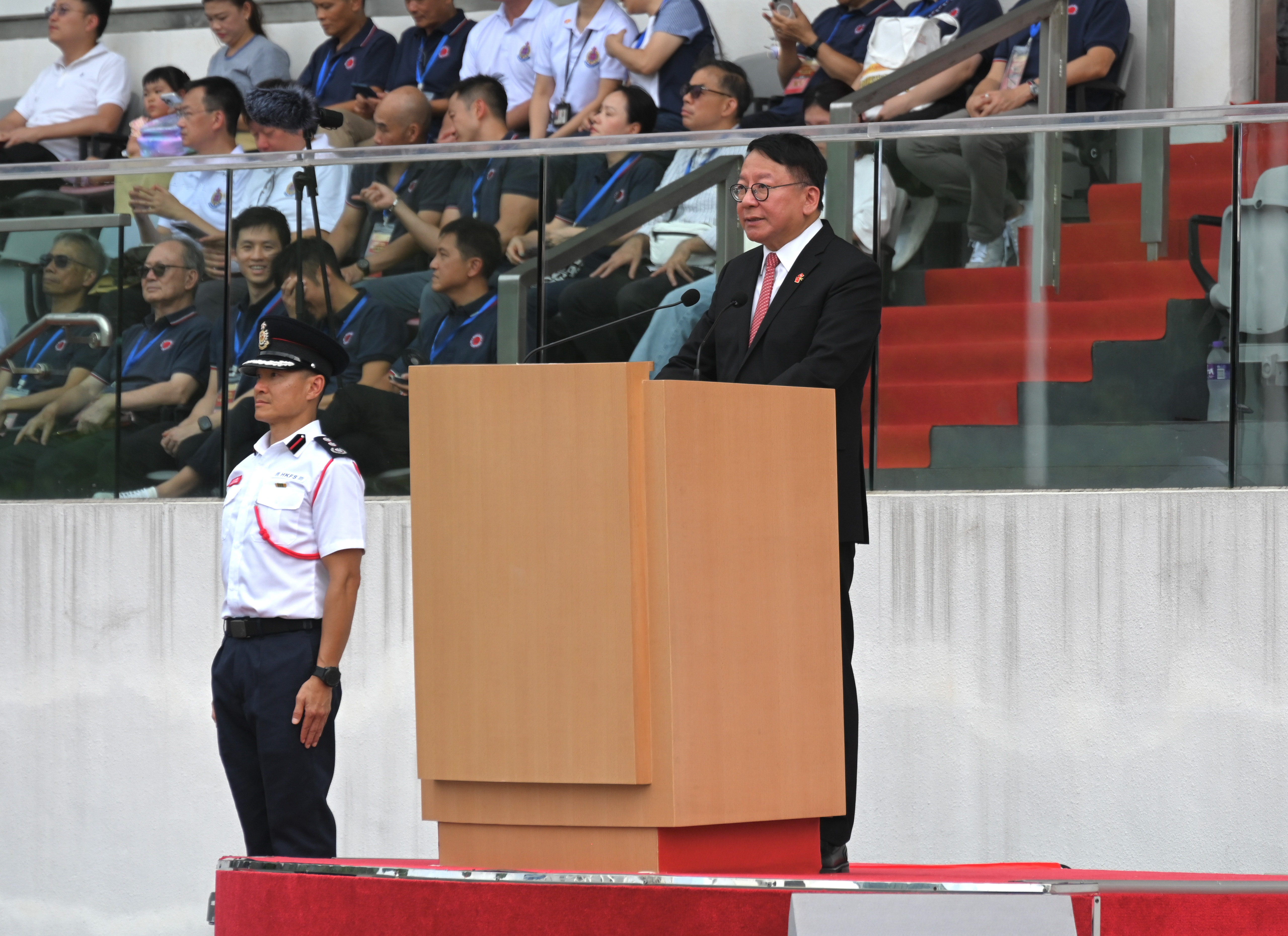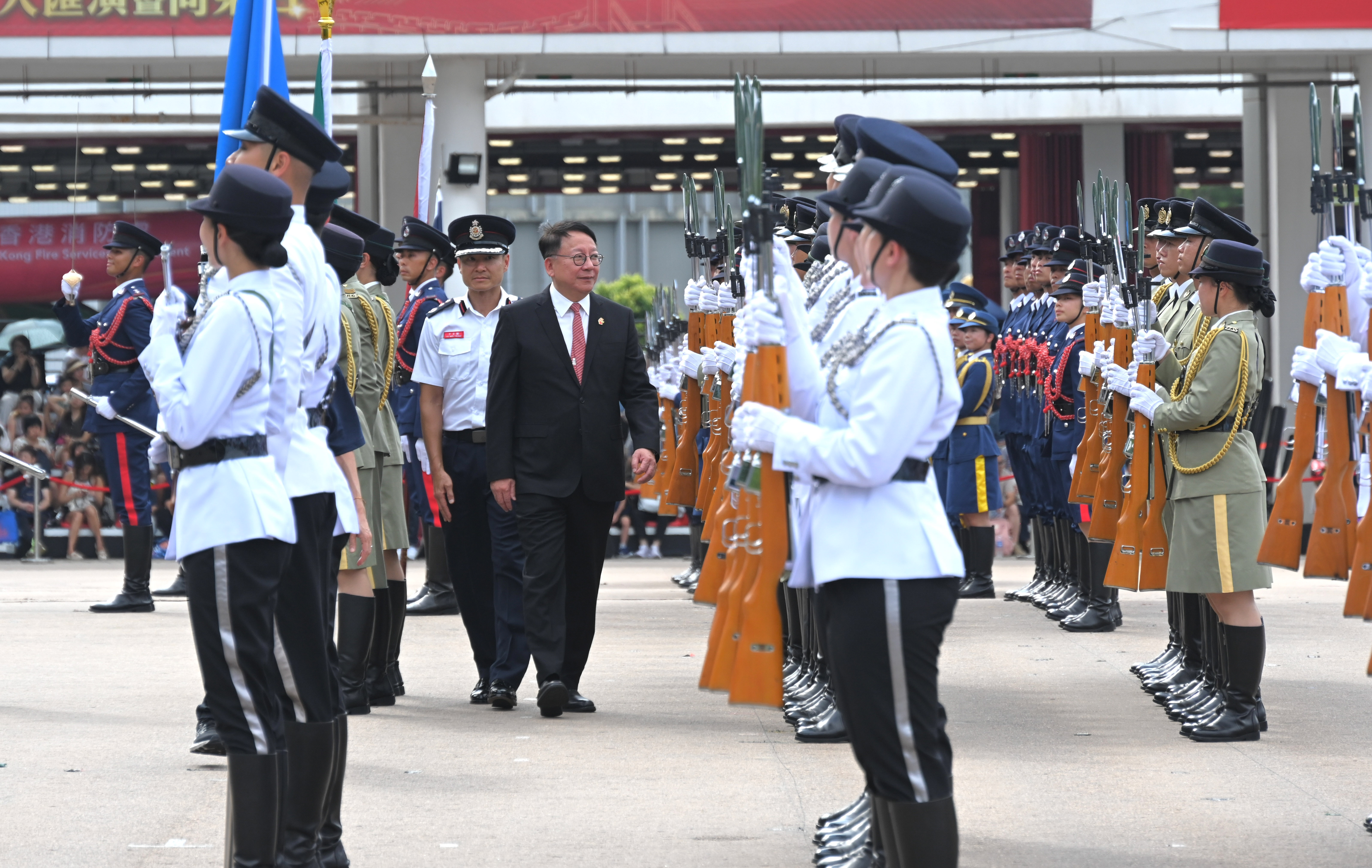 主禮嘉賓政務司司長陳國基檢閱紀律部隊儀仗隊、青少年團體及制服團體。他致辭時指社會各界積極響應政府呼籲,在全港各區舉辦多姿多彩慶祝國慶活動,充分體現大家對祖國的熱愛及未來美好的祝願;而各支紀律部隊及輔助部隊以及青少年團體隊伍的表演,亦展現大家團結一致,維護國家尊嚴的堅定決心,令人鼓舞。他亦勉勵青少年為國家作出貢獻。