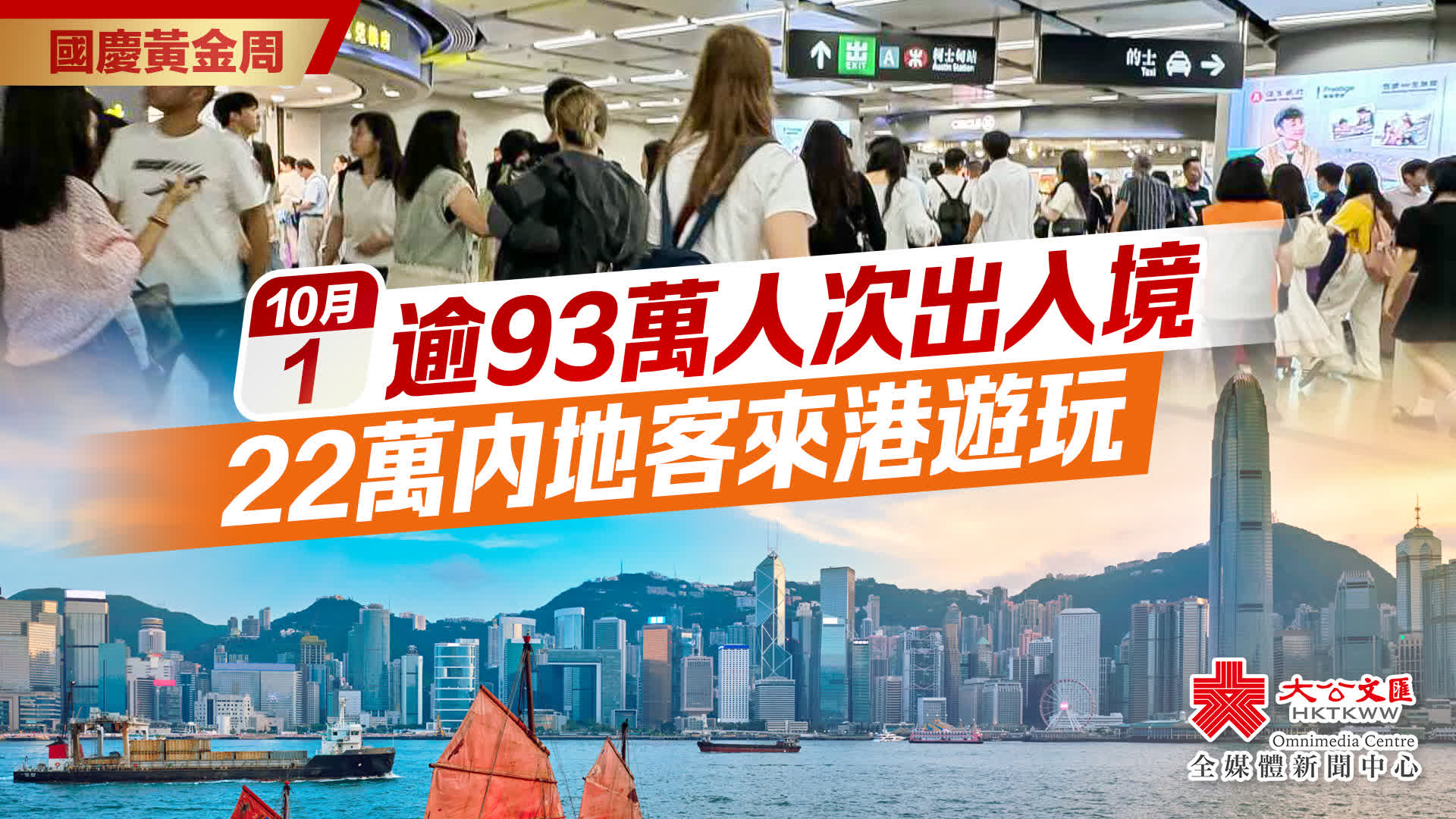 大公文匯全媒體報道,國慶黃金周伊始,不少內地旅客及旅行團開啟在港行程。入境處數據顯示,昨日(10月1日)共有逾93萬人次出入境,分別有56.5萬人次入境及36.5萬人次出境。其中,逾22萬內地旅客南下來港,亦有20萬港人出境遊玩。