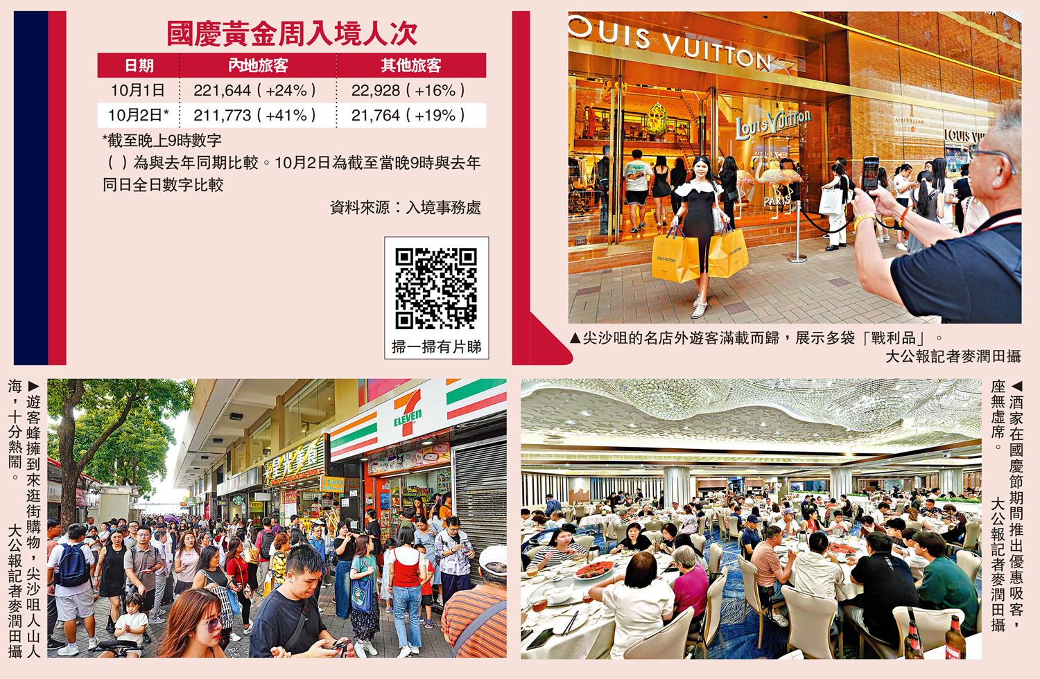 (大公報 記者 劉碩源、張凱文)國慶黃金周內地假期昨日踏第二天,內地訪港旅客繼首日錄得逾22萬人次,創下疫情後單日內地入境旅客新高後,昨日截至晚上九時,錄得21萬人次,較去年同日全日人數高出41%。大公報記者昨日走訪旺角、尖沙咀一帶,處處見到旅客,尖沙咀廣東道名店外出現人龍,不少遊客手提大包小包,購物收穫豐富。有小店對國慶黃金周生意感樂觀,相信與內地旅客購物免稅額增加、兩地股市上升有關。