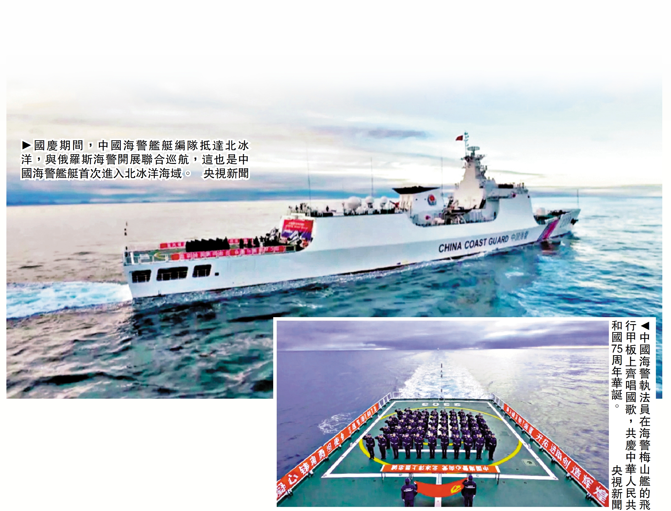 10月2日,央視新聞發布消息,國慶期間,中國海警艦艇編隊抵達北冰洋,與俄羅斯海警開展聯合巡航,這也是中國海警艦艇首次進入北冰洋海域。從央視播出的視頻中,海警梅山艦的飛行甲板上,海警執法員們齊唱國歌,共慶中華人民共和國75周年華誕,鮮艷的五星紅旗迎風飄揚,嘹亮的國歌在北冰洋海域上唱響。