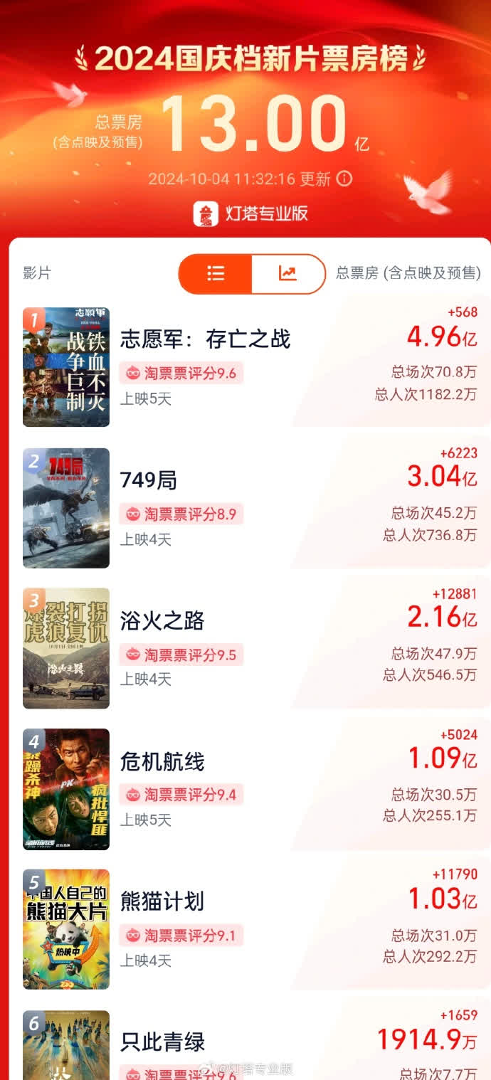 據網絡平台數據,截至10月4日11時32分,2024年國慶檔新片票房(含點映及預售)突破13億!《志願軍:存亡之戰》《749局》《浴火之路》暫列新片票房前三名。