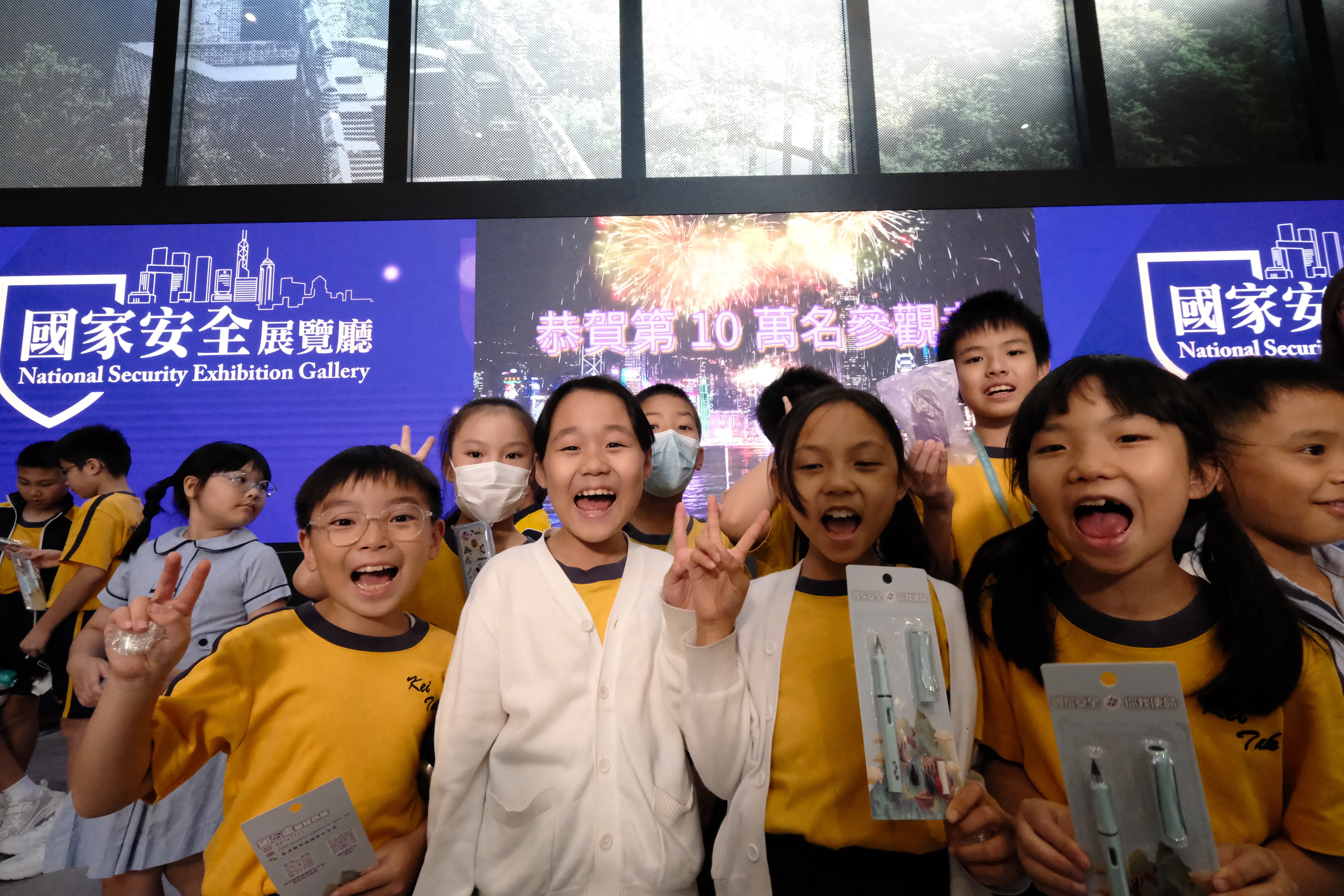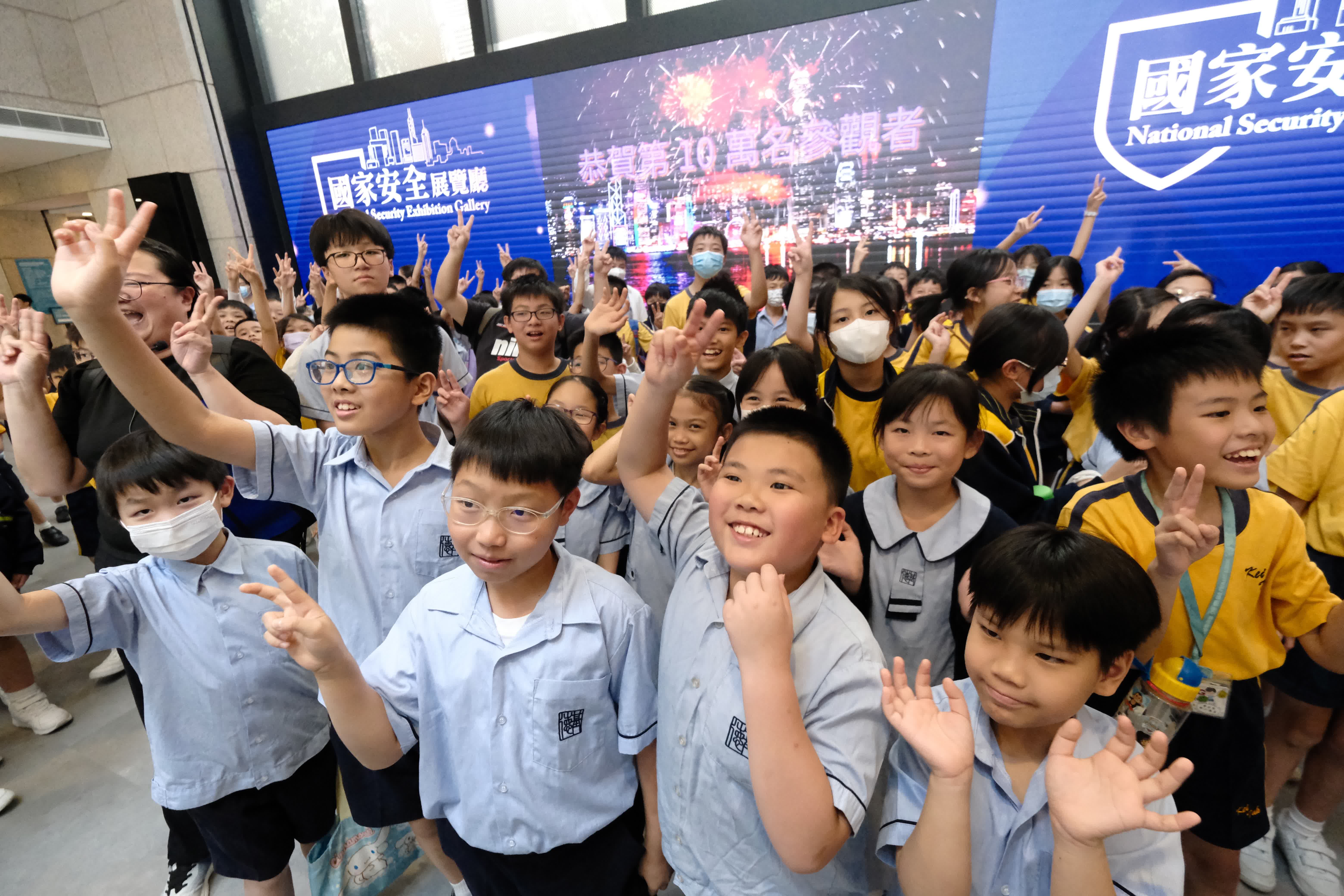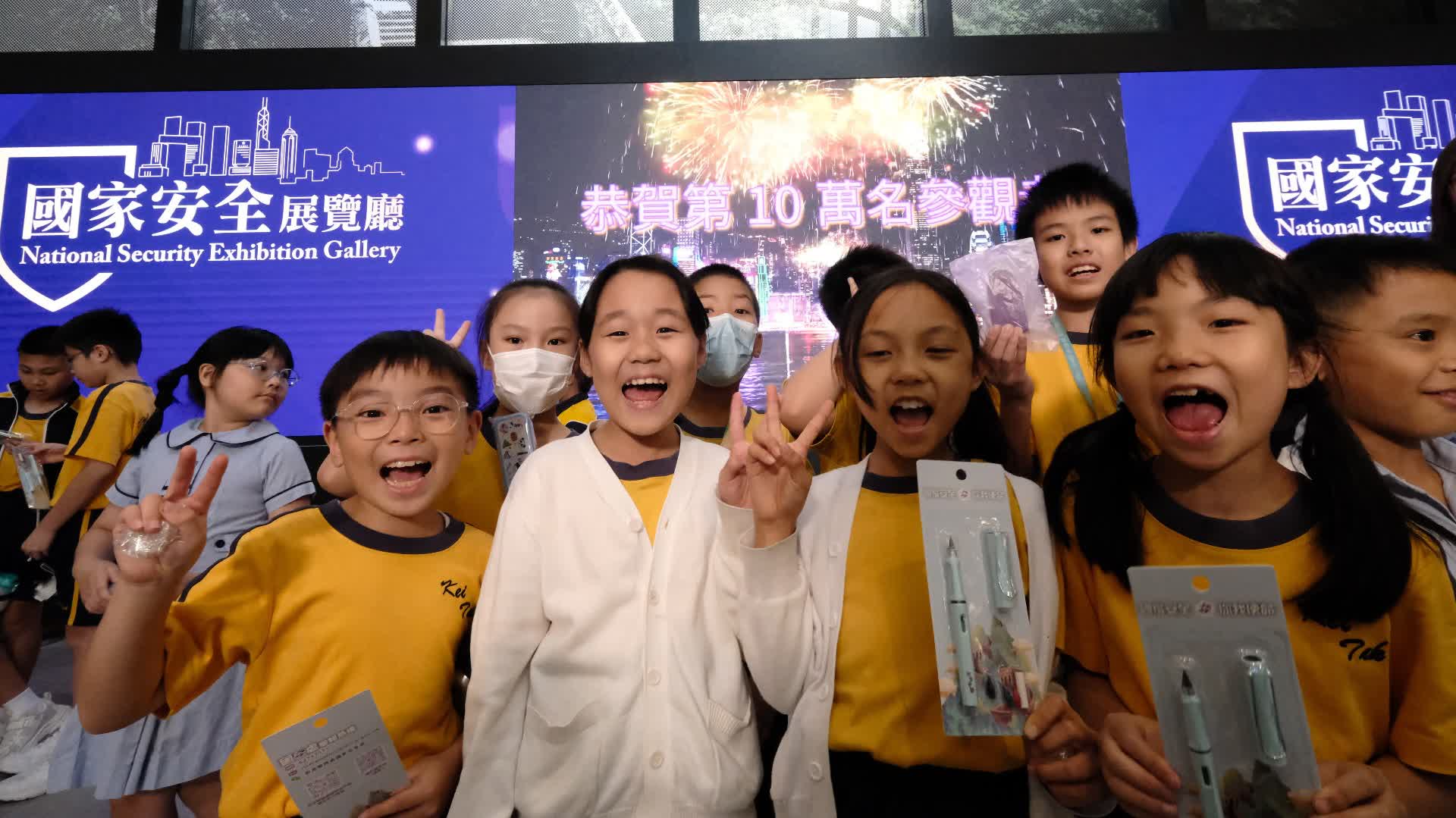 (香港文匯報記者 胡恬恬)今年8月7日對公眾開放的香港特區國家安全展覽廳今日(10月4日)迎來第十萬名參觀者——來自聖公會基德小學的三年級學生團體。一群學生現場聽到這個好消息,忍不住激動歡呼雀躍,充滿喜悅的「耶」聲回蕩整個大堂。國家安全展覽廳負責人張建光表示,第十萬名參觀者的到訪不僅標誌着國家安全展覽廳在社區中的影響力和吸引力,更凸顯了展覽廳深受各界人士的認同及支持。有學生參觀完展廳後表示,對國家成就相關展品和日軍侵華影片印象最為深刻,希望未來再與家人前來參觀,了解和感受國家的巨大進步。